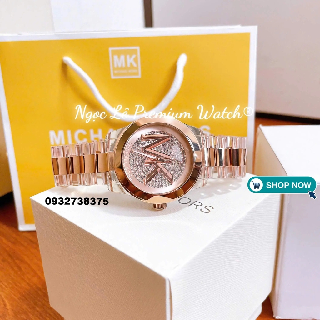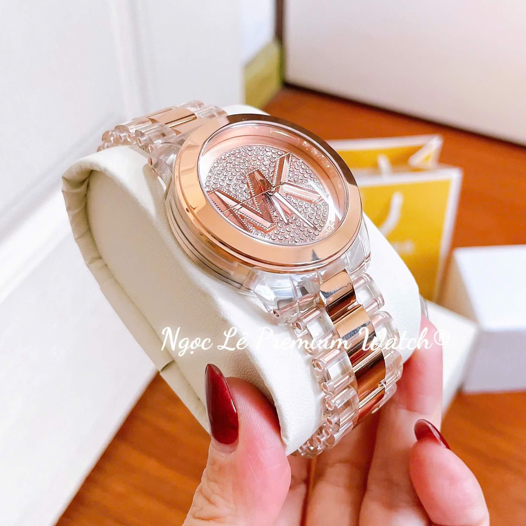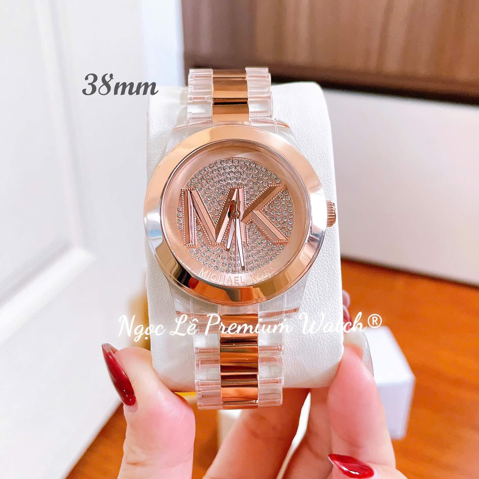 • Tông vàng hồng sang chảnh, mặt đồng hồ đính đá chữ MK nổi bật ở trung tâm