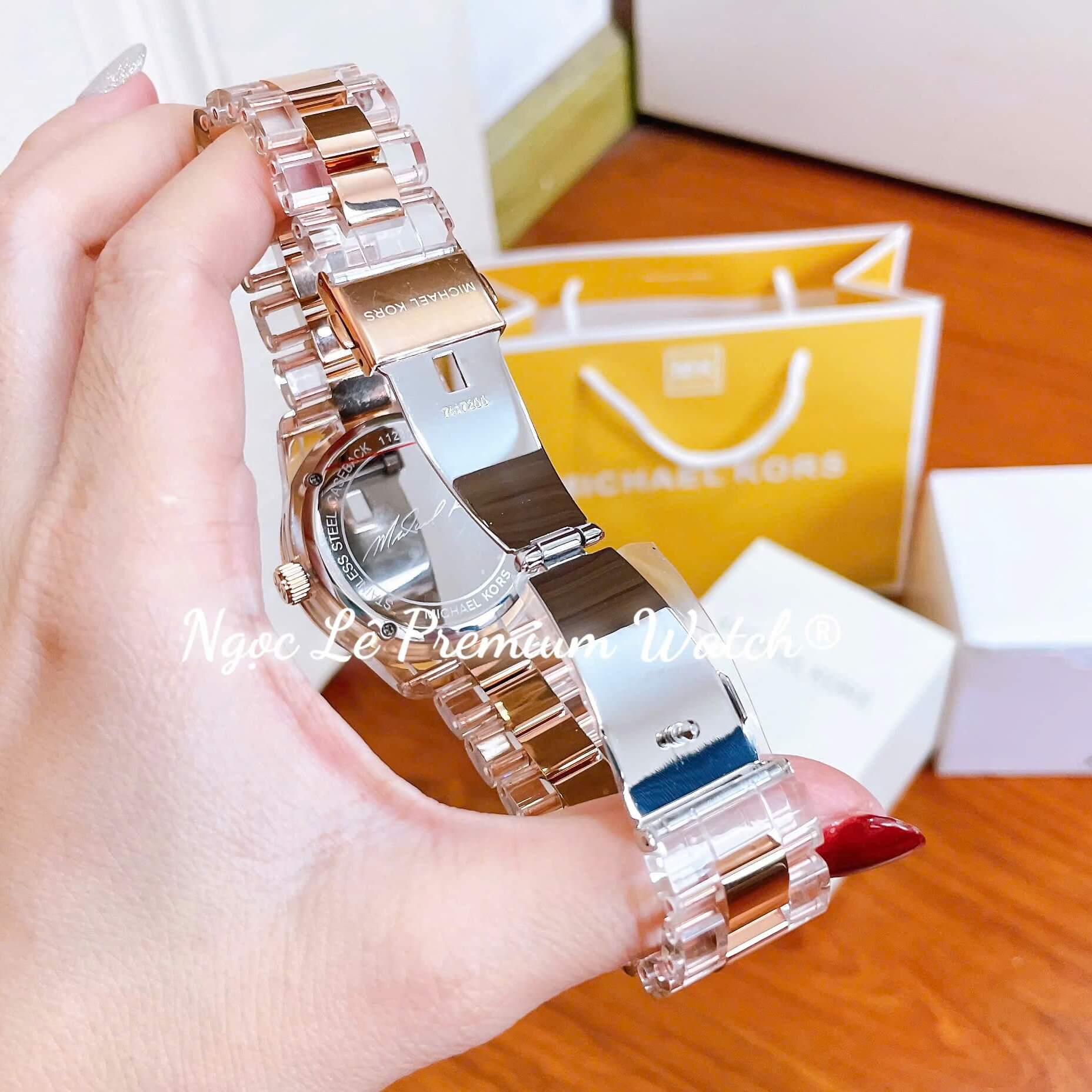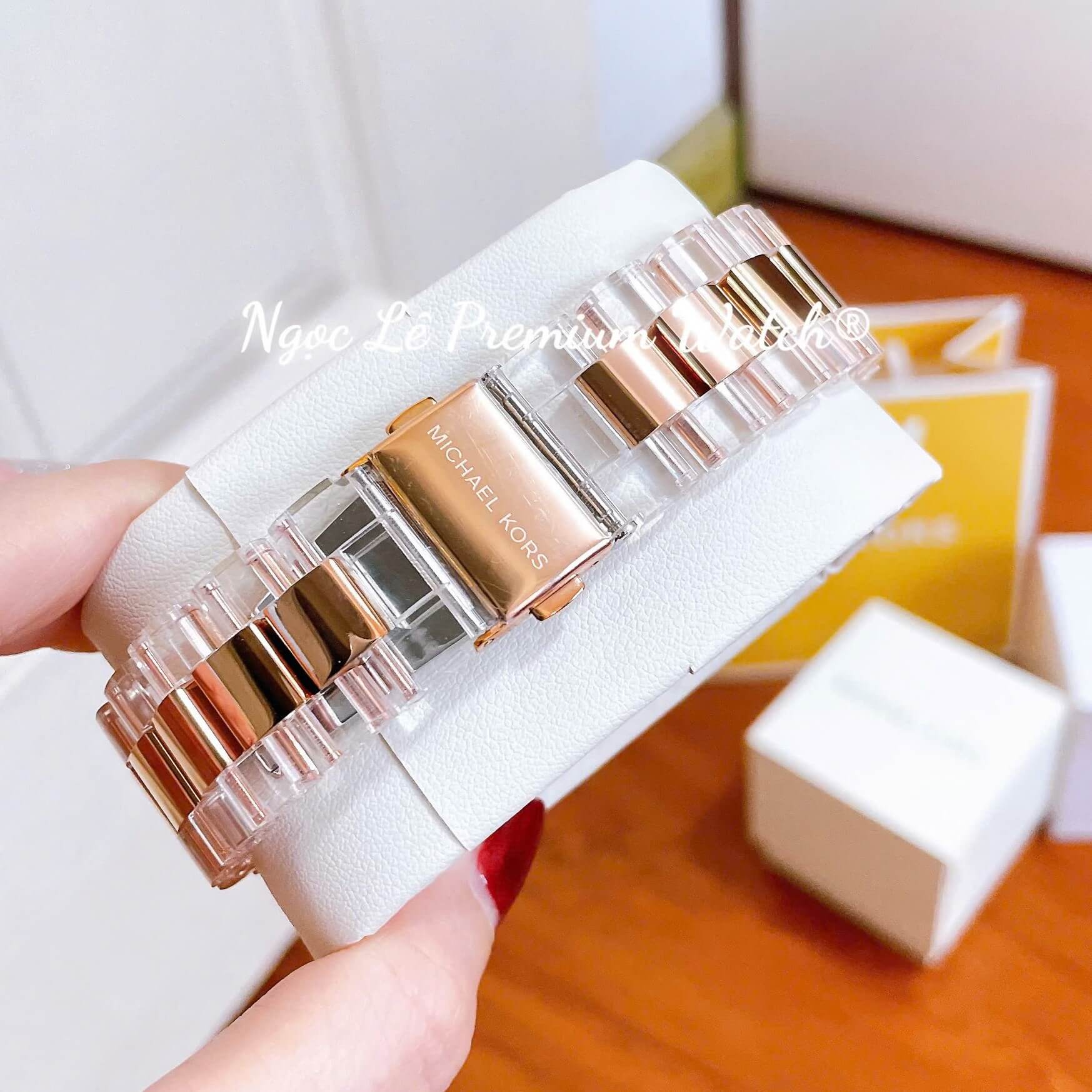 Đồng hồ màu vàng hồng, phối nhựa acetate trong suốt, làm cho chiếc đồng hồ trở nên nổi bật và cuốn hút