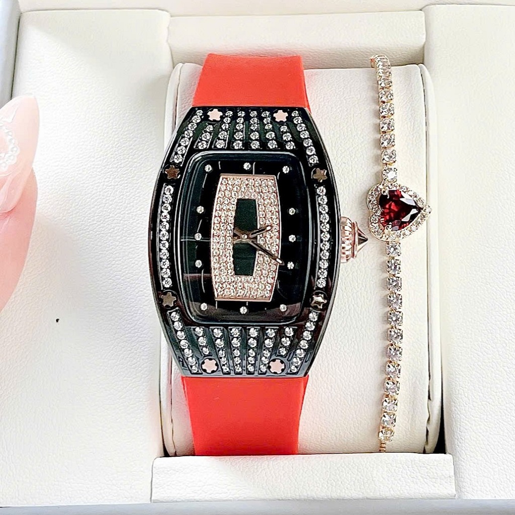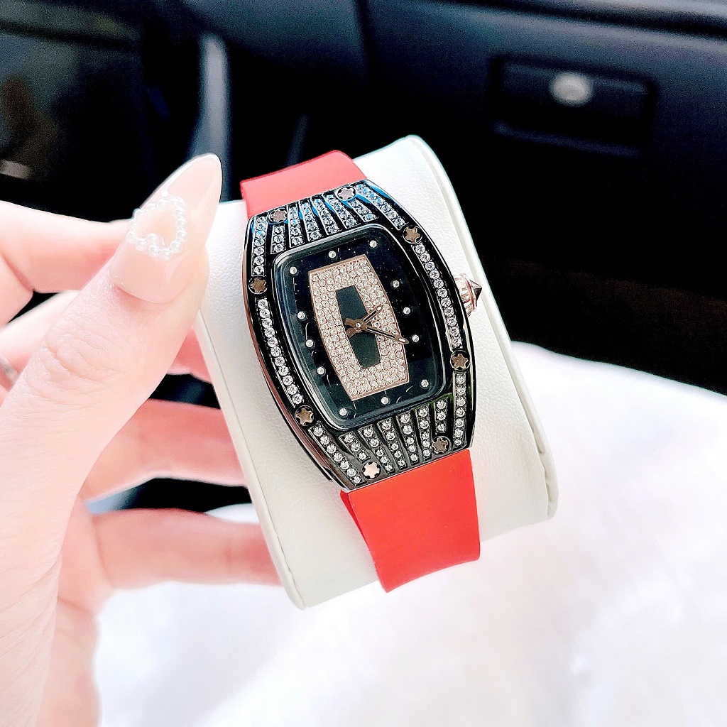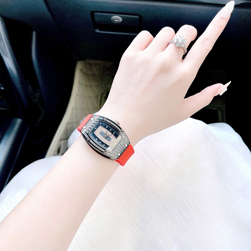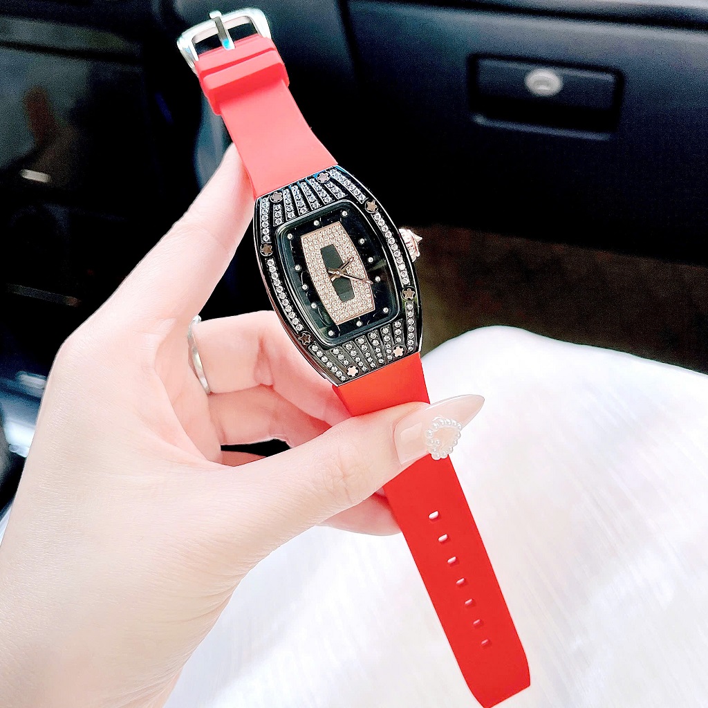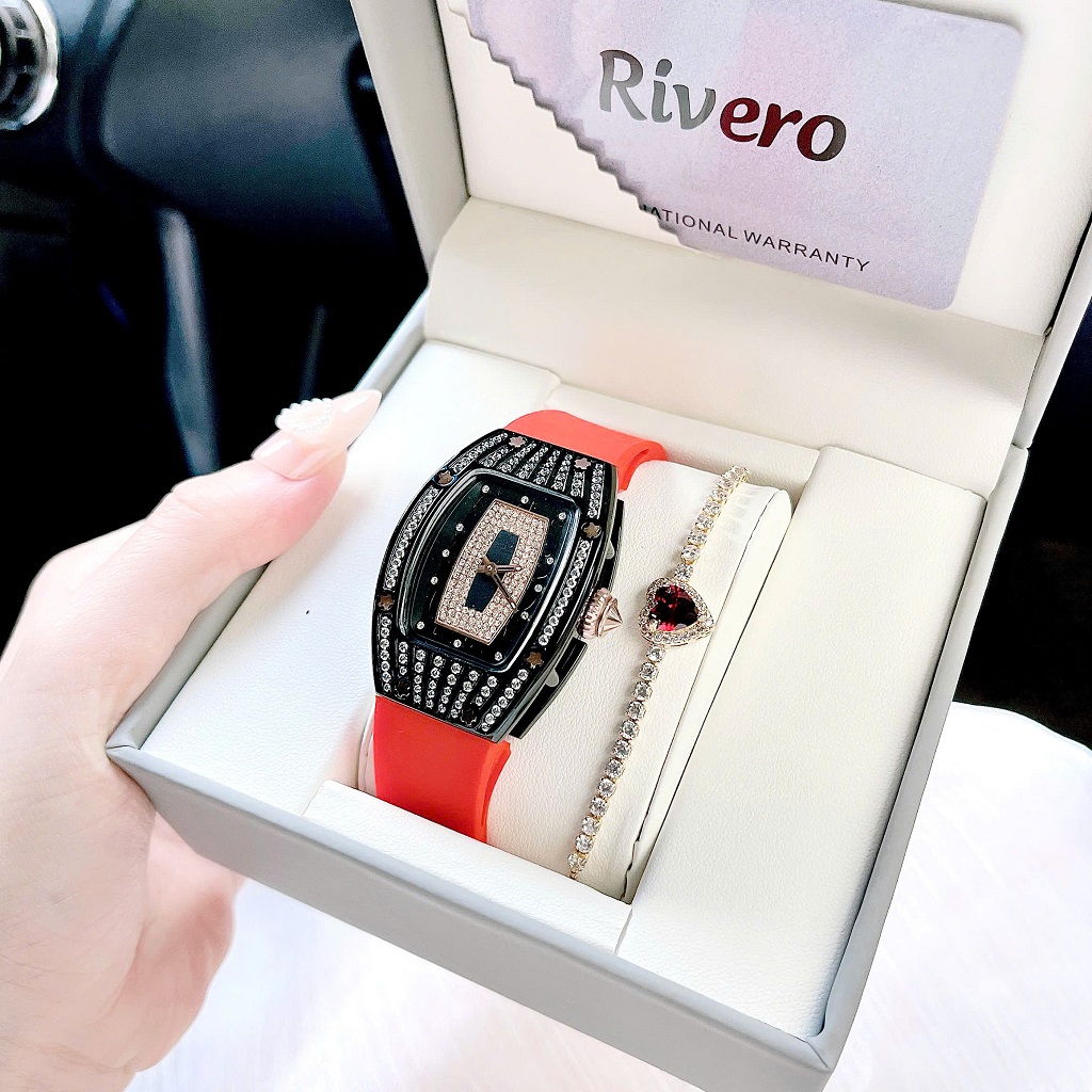 Đồng Hồ Nữ Rivero R9005 Dây Silicone Đỏ Đính Đá Vỏ Đen Size 36mm – Quartz