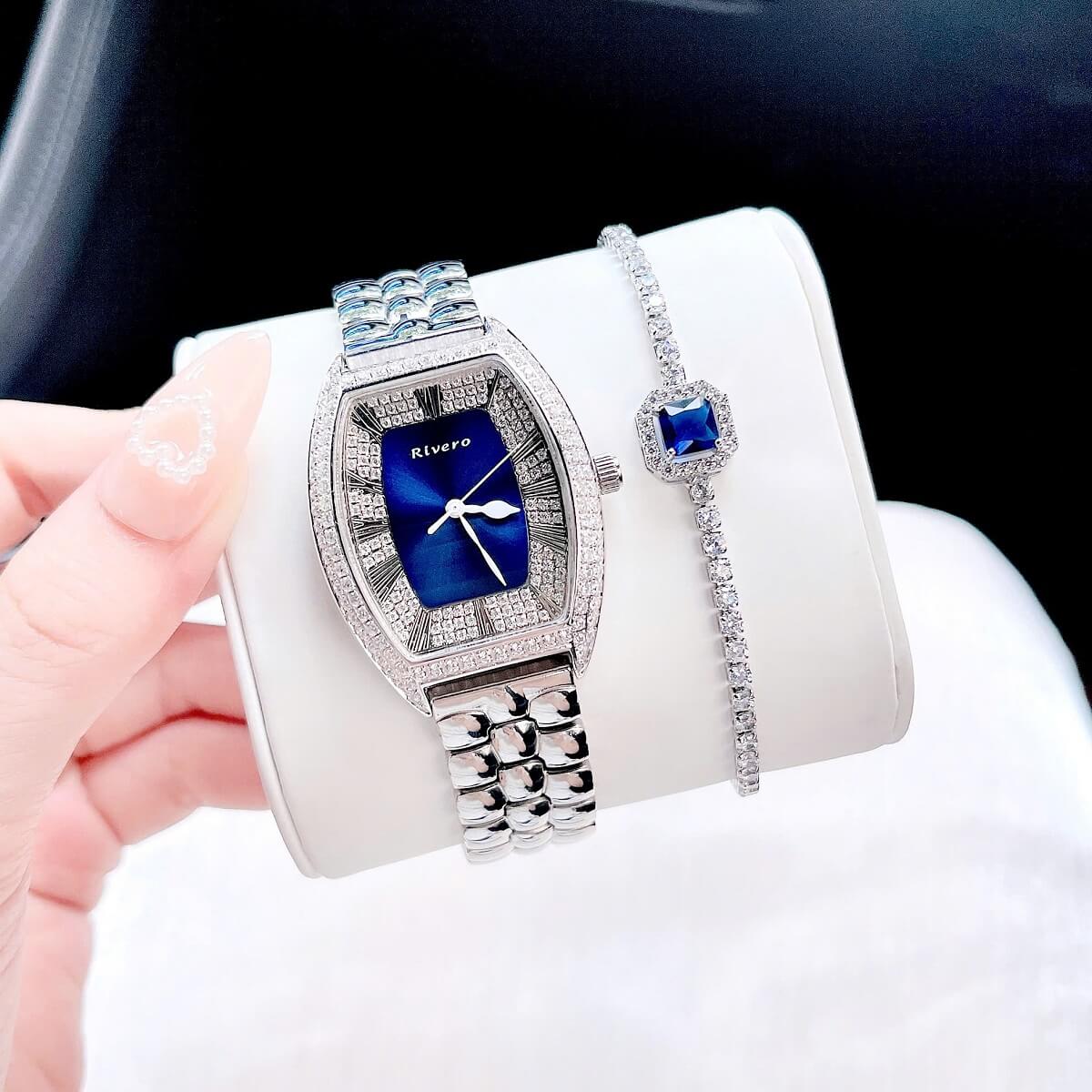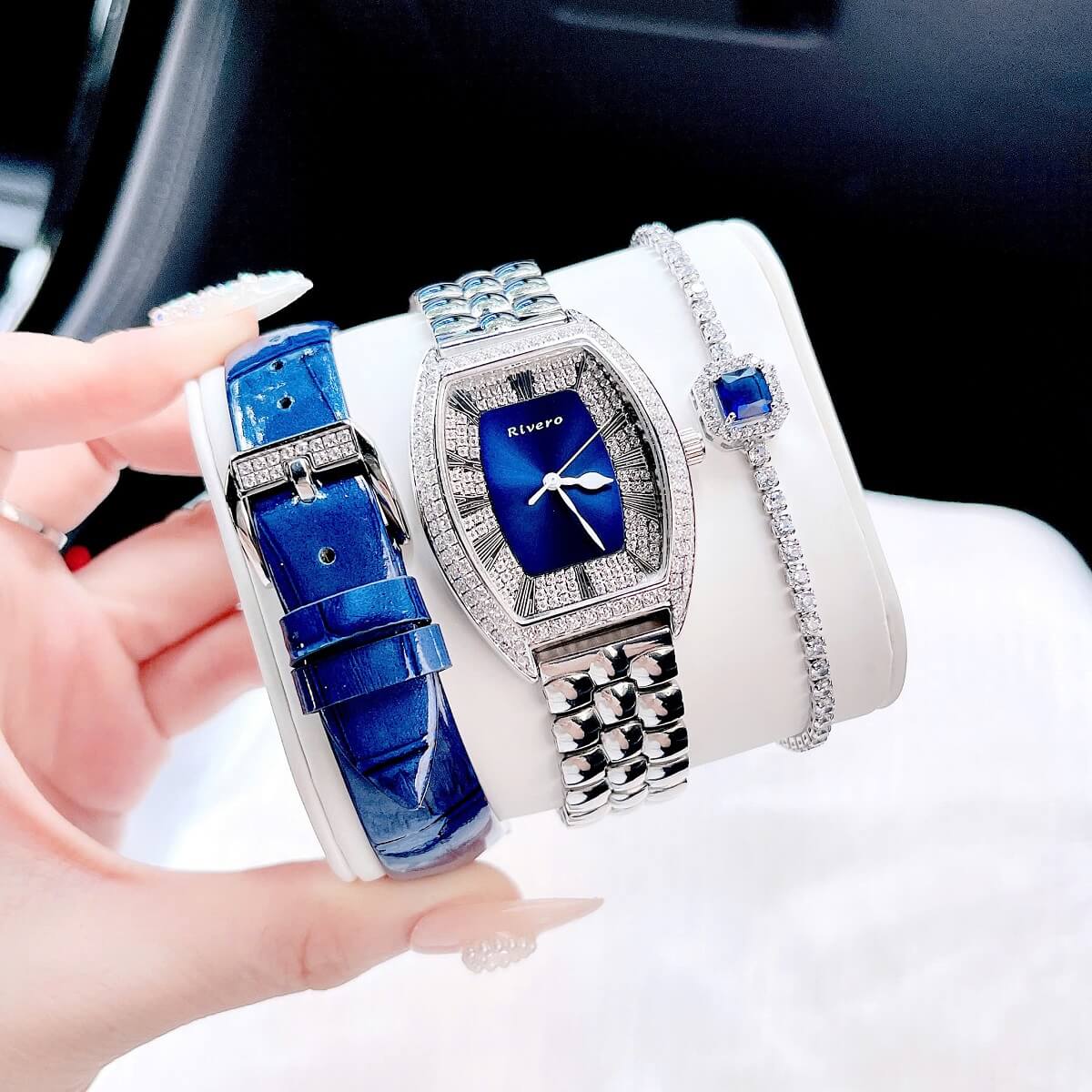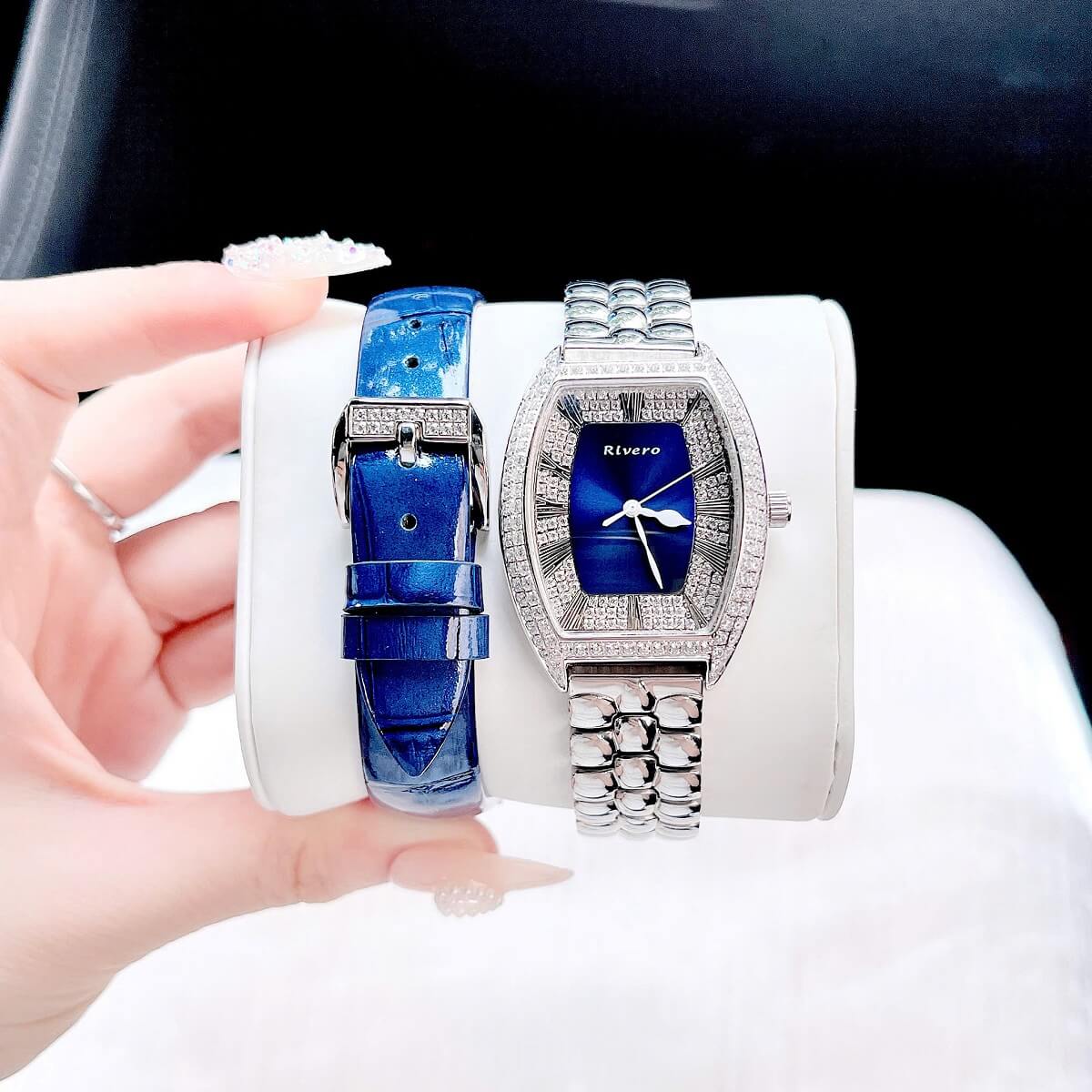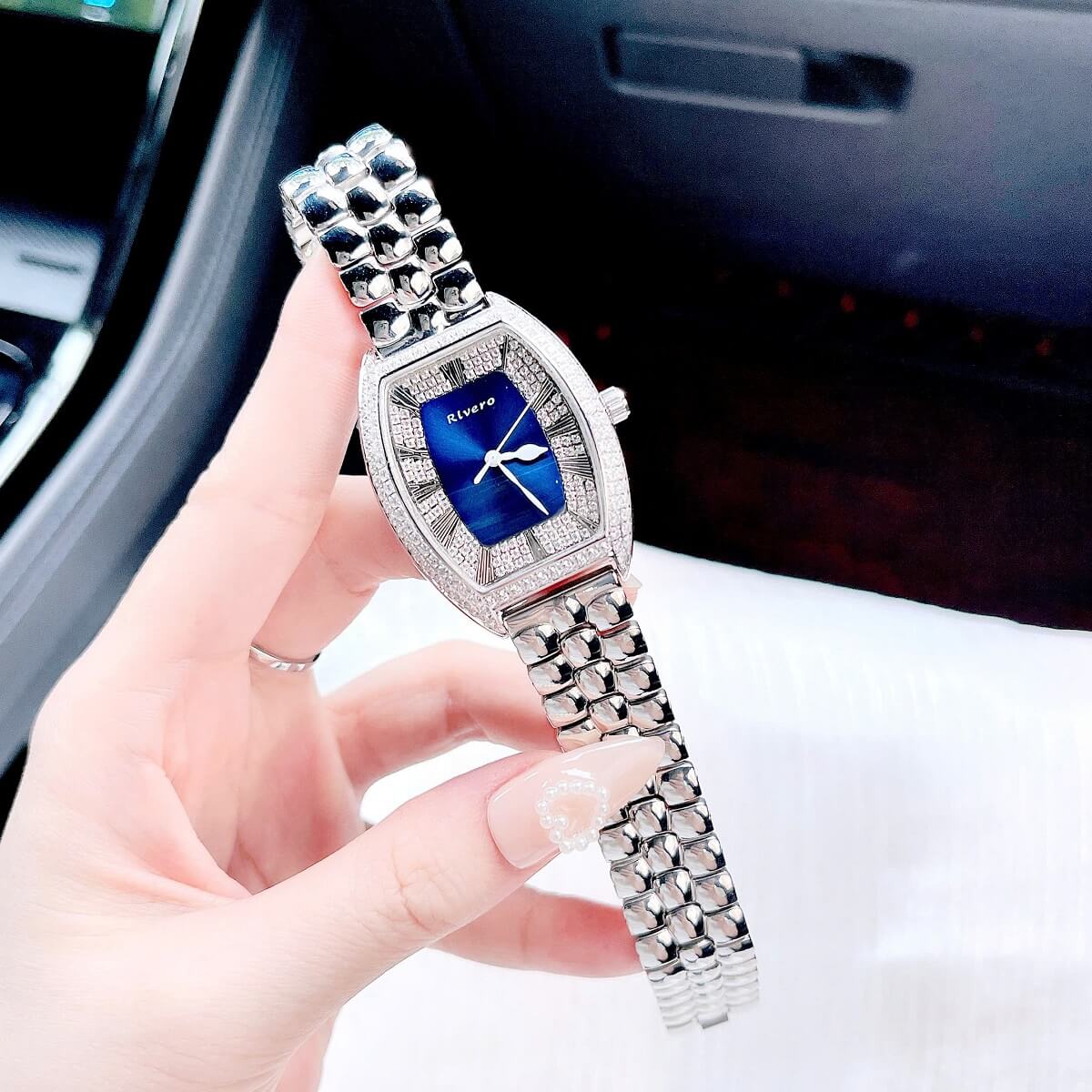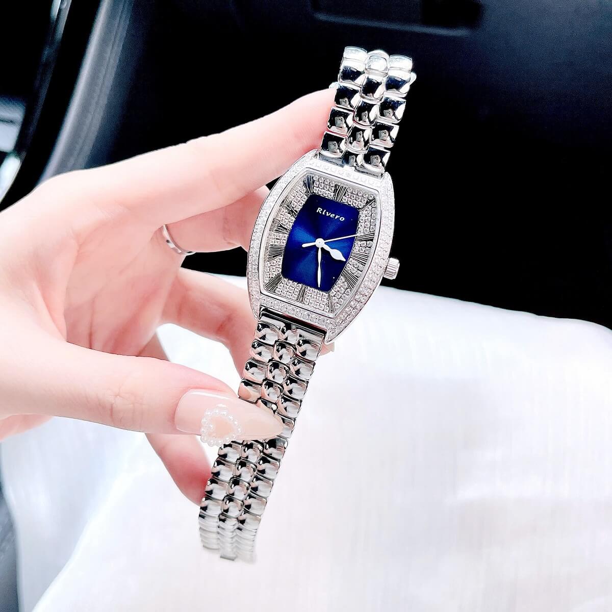 Rivero R9007 mang đến một thiết kế đầy thu hút với sắc xanh dương trẻ trung, kết hợp cùng viền đá lấp lánh và vỏ silver hiện đại. Chiếc đồng hồ không chỉ là công cụ xem giờ mà còn là phụ kiện thời trang giúp nàng nổi bật trong mọi hoàn cảnh.