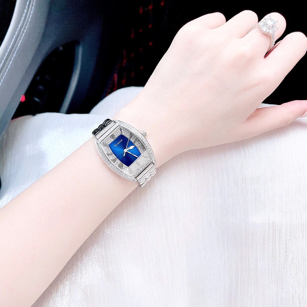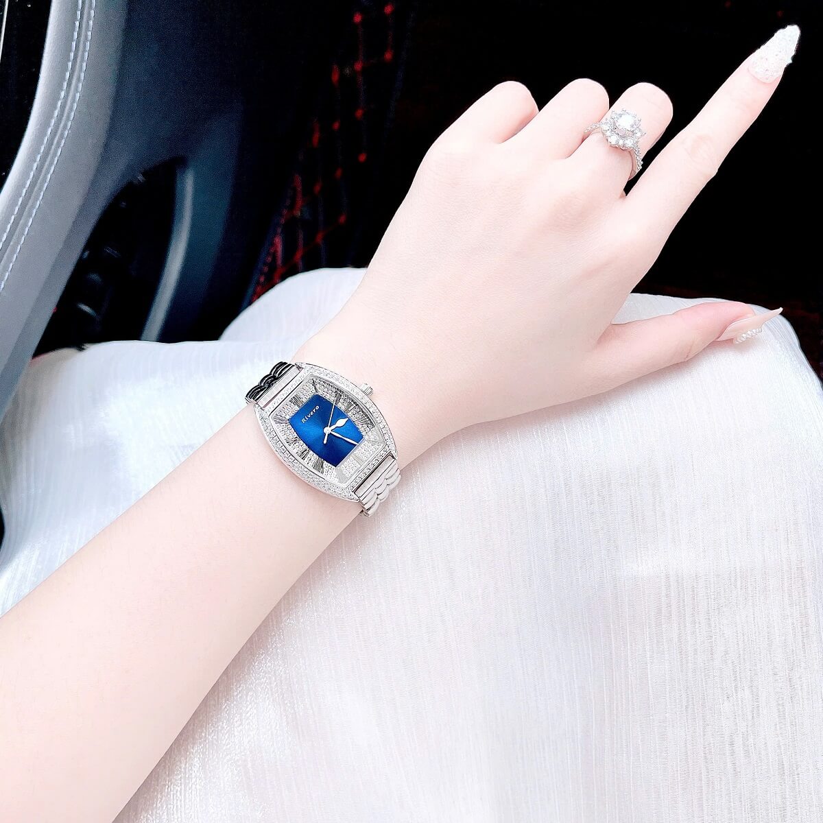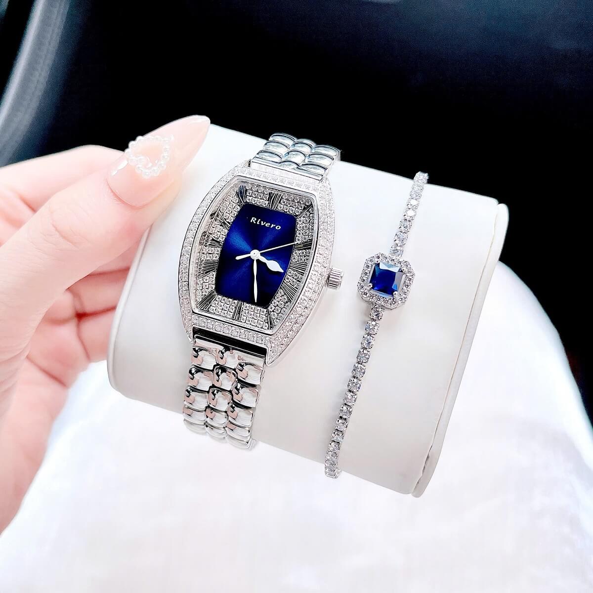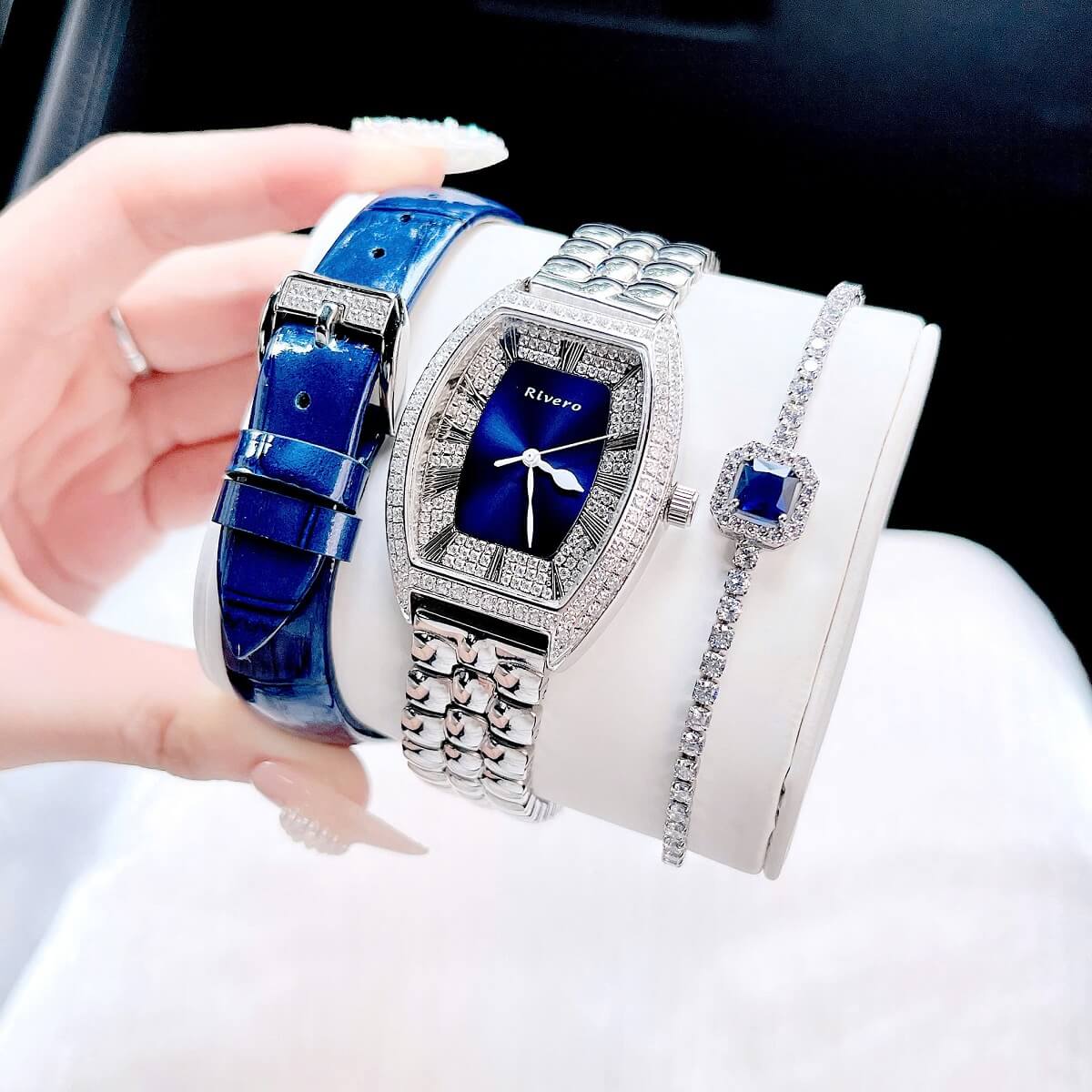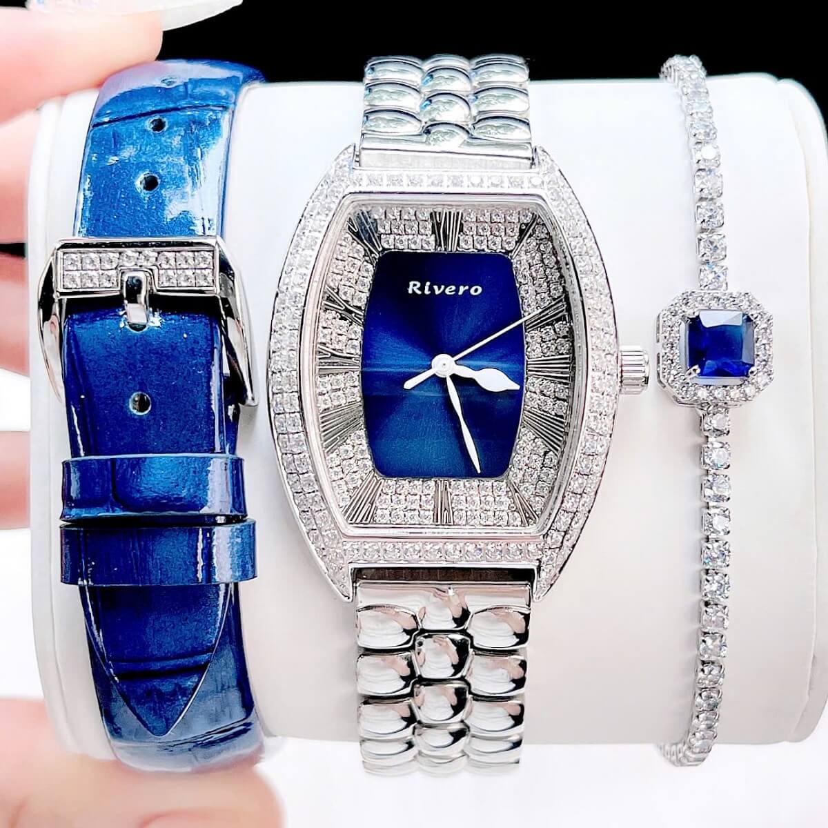 Rivero R9007 mang đến một thiết kế đầy thu hút với sắc xanh dương trẻ trung, kết hợp cùng viền đá lấp lánh và vỏ silver hiện đại. Chiếc đồng hồ không chỉ là công cụ xem giờ mà còn là phụ kiện thời trang giúp nàng nổi bật trong mọi hoàn cảnh.