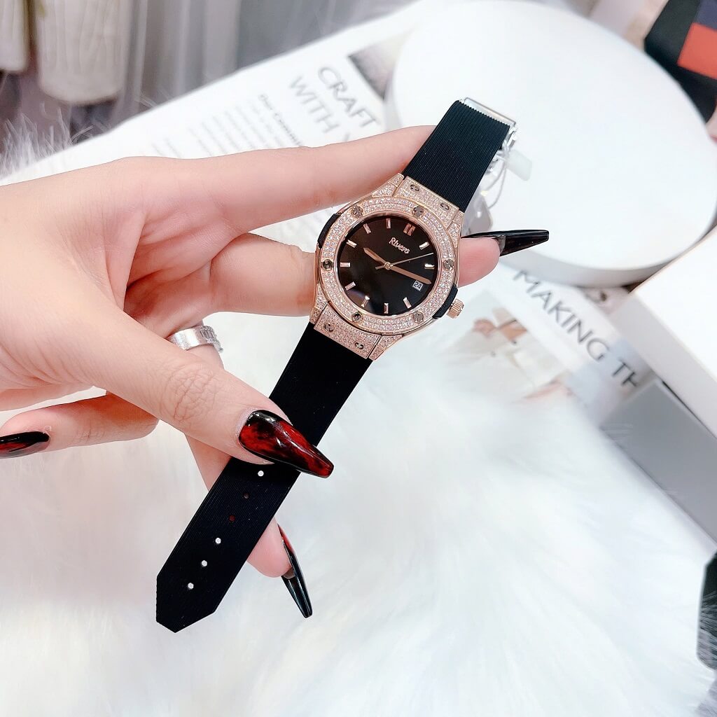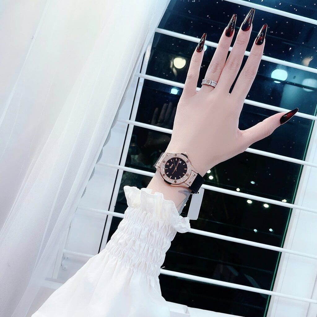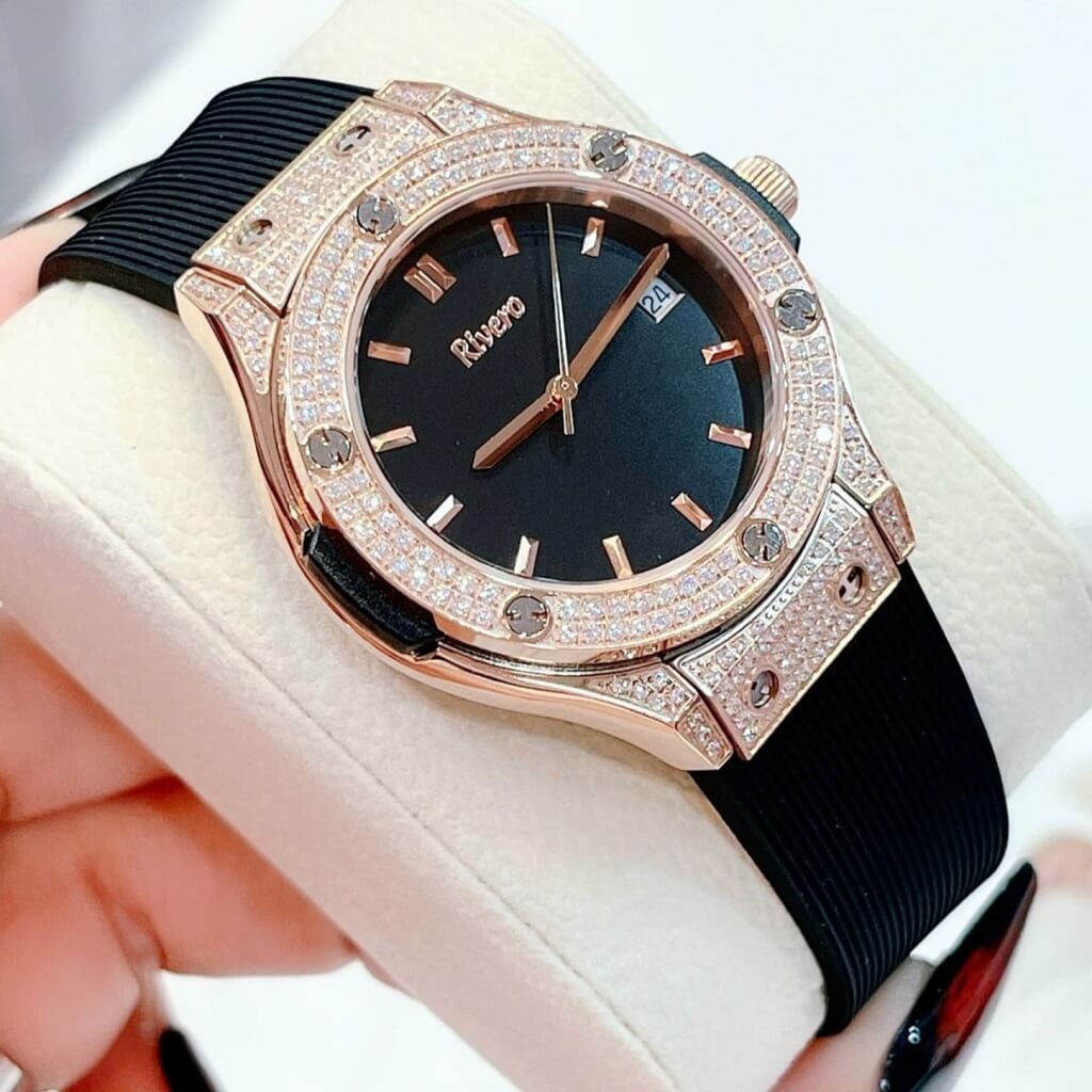 Đính đá: Đồng hồ được trang trí với các viên đá tinh tế, làm tăng vẻ đẹp và độ lấp lánh cho sản phẩm, tạo điểm nhấn sang trọng.