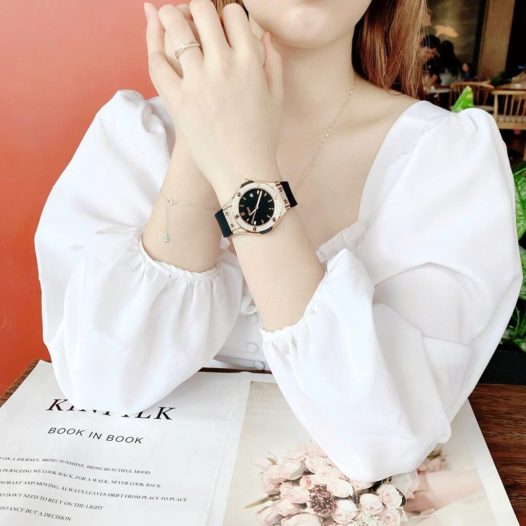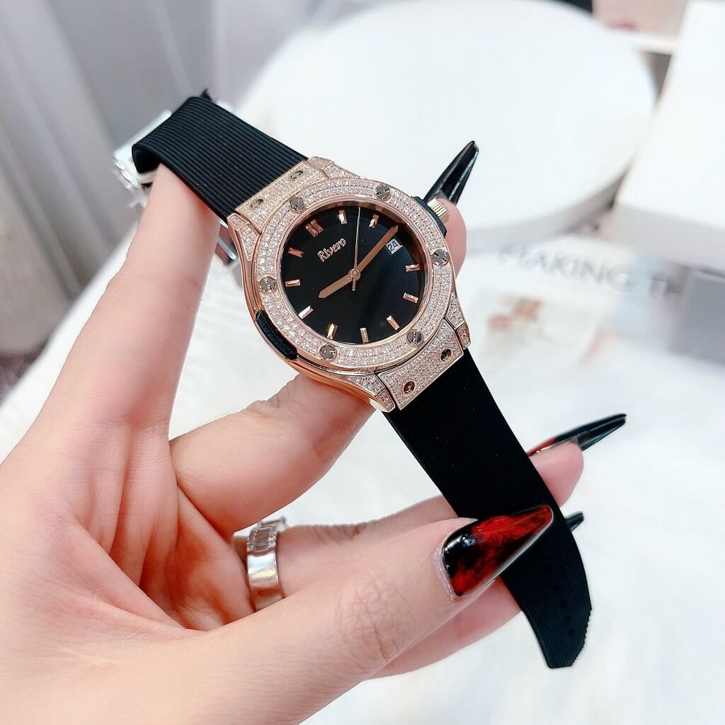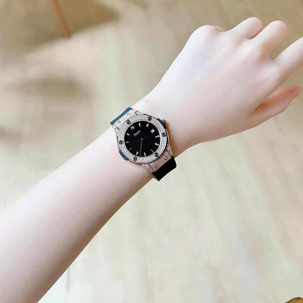 Đính đá: Đồng hồ được trang trí với các viên đá tinh tế, làm tăng vẻ đẹp và độ lấp lánh cho sản phẩm, tạo điểm nhấn sang trọng.