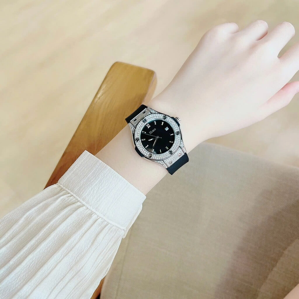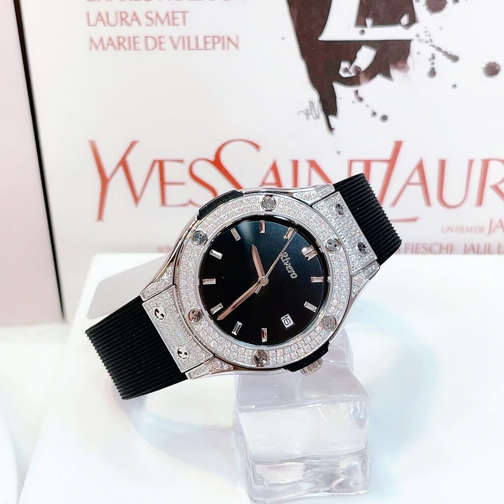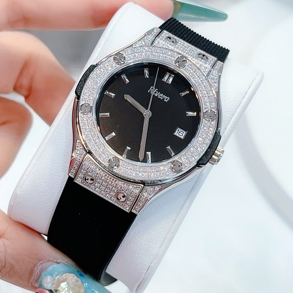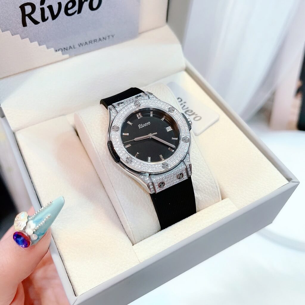 Đồng hồ nữ Rivero R9009 với thiết kế dây cao su đen và vỏ màu bạc (silver) đính đá là một lựa chọn thời trang thanh lịch và hiện đại. Dưới đây là một số thông tin về sản phẩm: