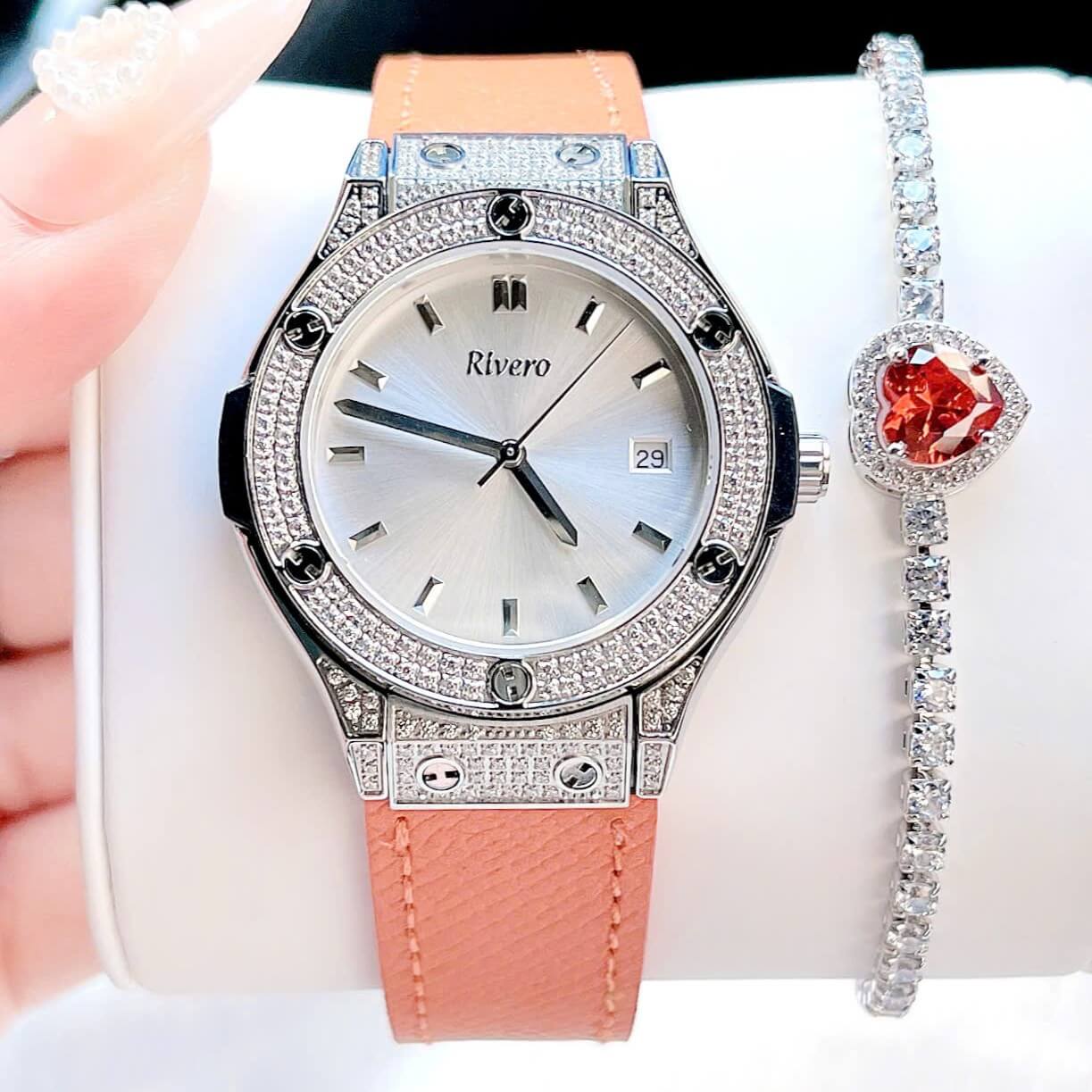 Rivero R9009 phiên bản dây da cam là lựa chọn lý tưởng cho các nàng yêu thích sự nổi bật, tươi mới nhưng vẫn giữ được nét thanh lịch. Màu cam rực rỡ kết hợp cùng mặt số trắng và viền đá lấp lánh mang lại tổng thể trẻ trung, đầy năng lượng.