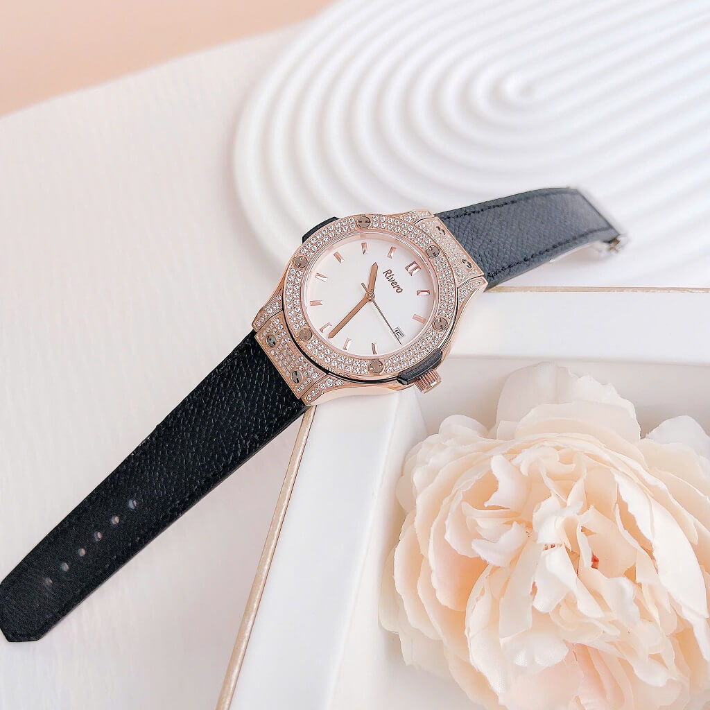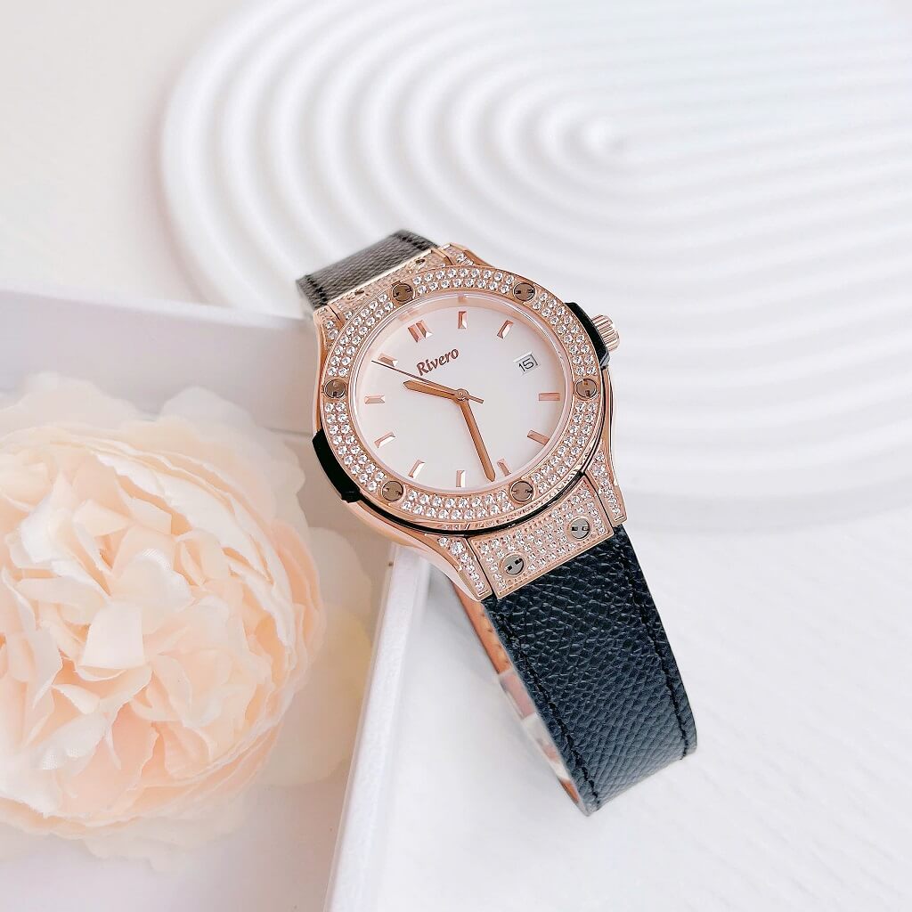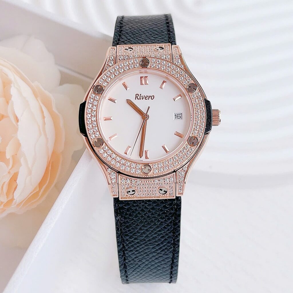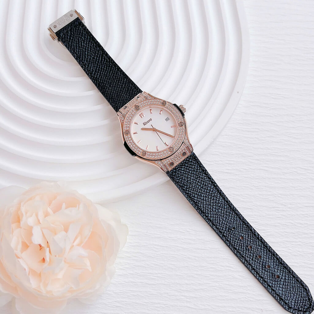 Rivero R9009 phiên bản dây da đen, vỏ màu rose gold là một thiết kế lý tưởng dành cho những quý cô yêu thích sự sang trọng nhưng vẫn giữ được nét hiện đại và cá tính. Sở hữu mặt số 34mm vừa vặn, mẫu đồng hồ này mang đến điểm nhấn nổi bật cho cổ tay và tổng thể outfit.