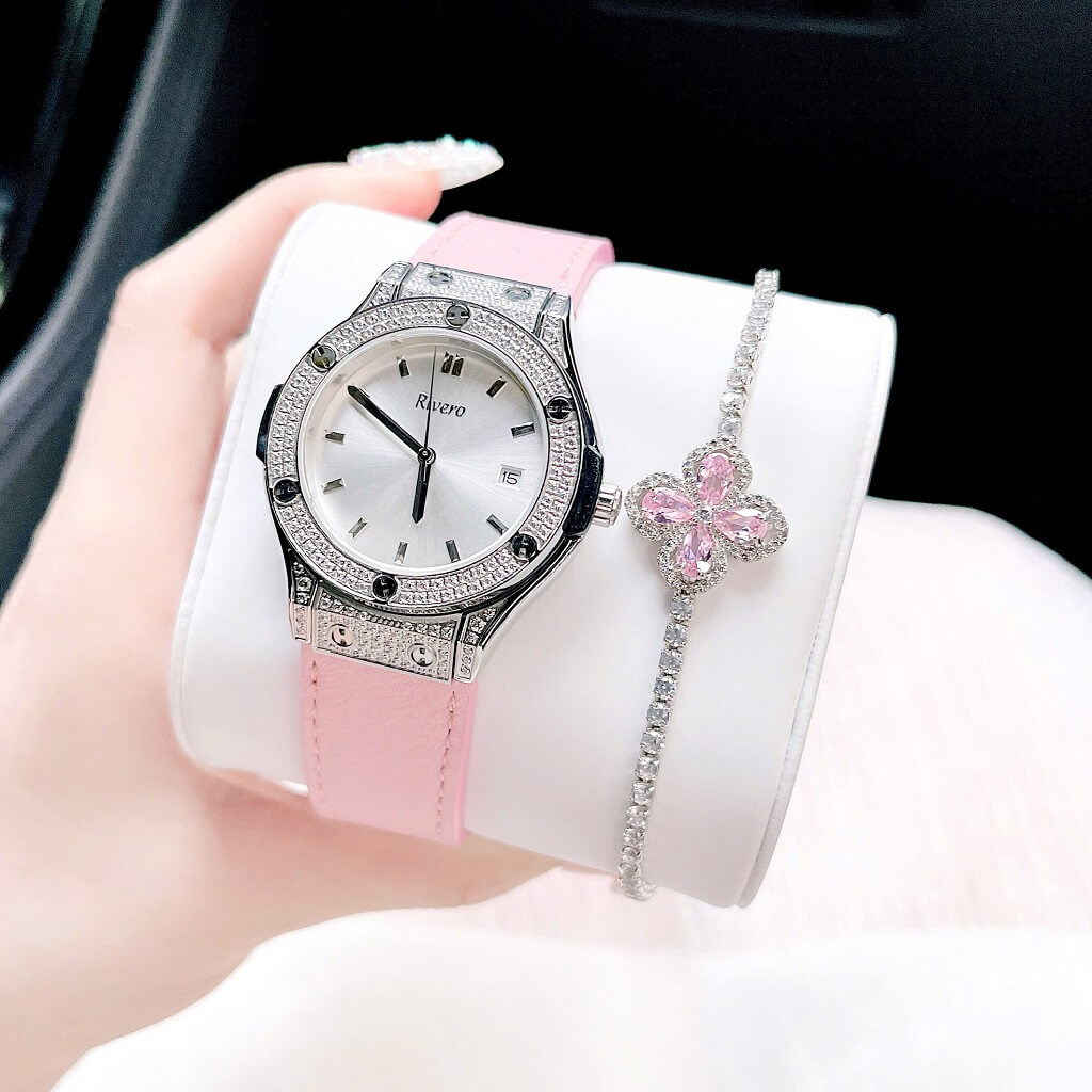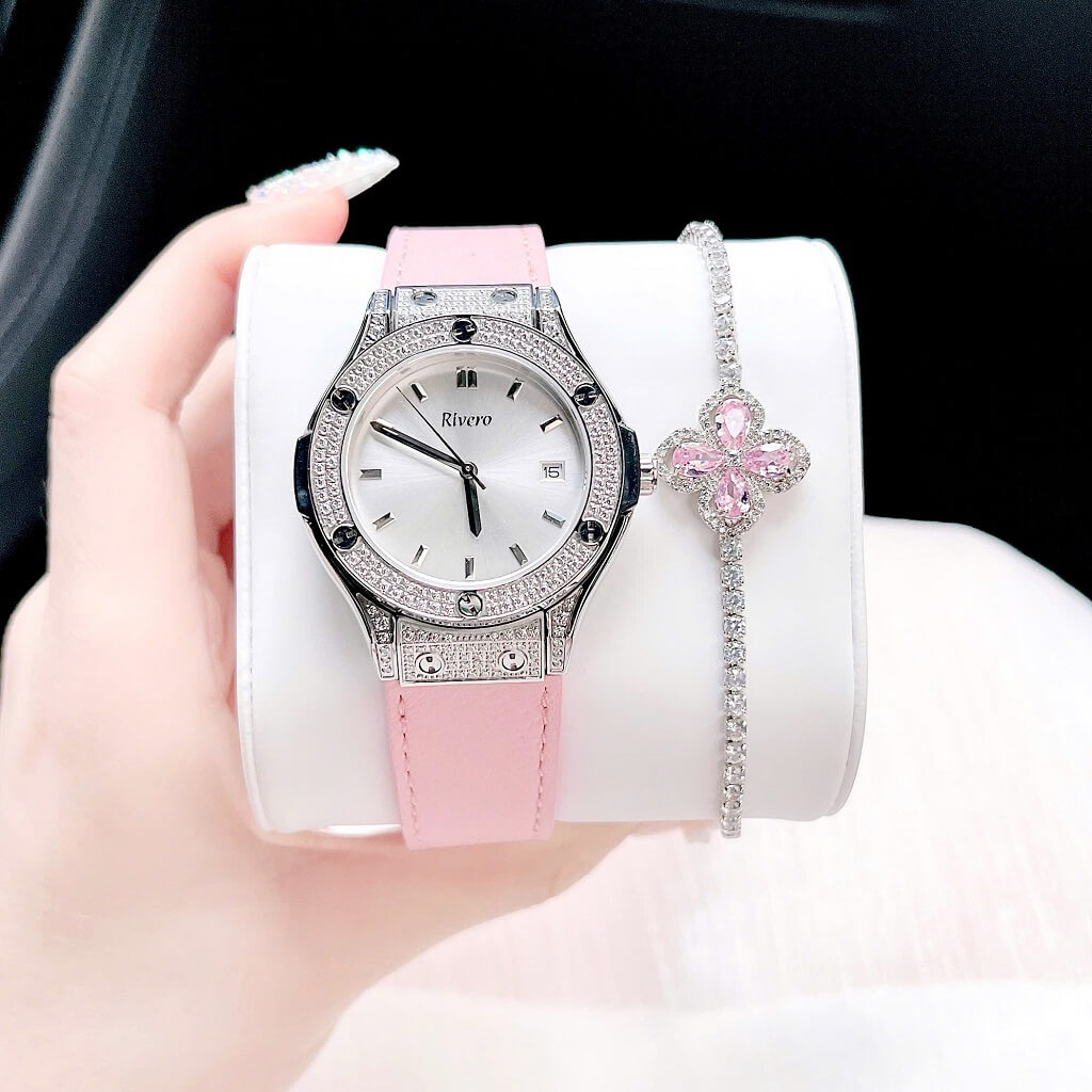 Đồng hồ nữ Rivero R9009 dây da hồng vỏ màu silver đính đá size 34mm chính hãng là một mẫu đồng hồ thời trang sang trọng, phù hợp với nhiều phong cách khác nhau. Dưới đây là một số thông tin chi tiết về sản phẩm này: