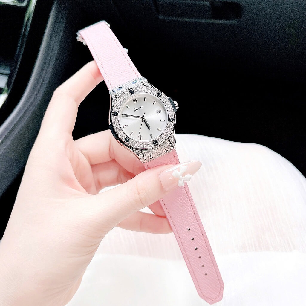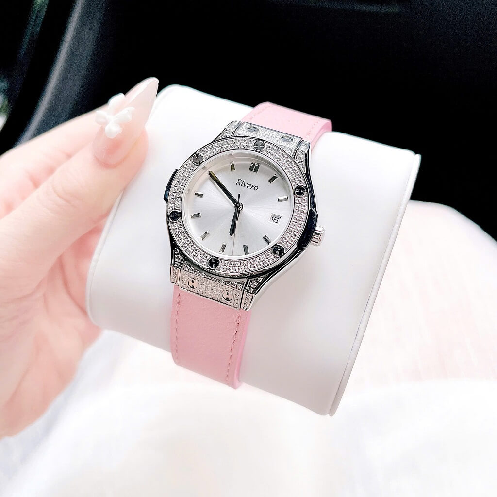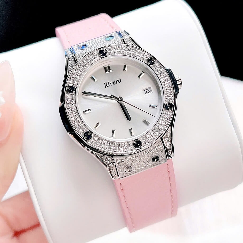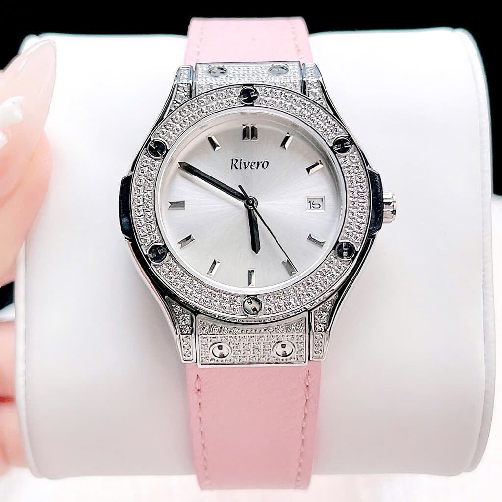 Thông số chi tiết sản phẩm: Đồng Hồ Nữ Rivero R9009 Dây Da Hồng Vỏ Màu Silver Đính Đá Size 34mm Chính Hãng
