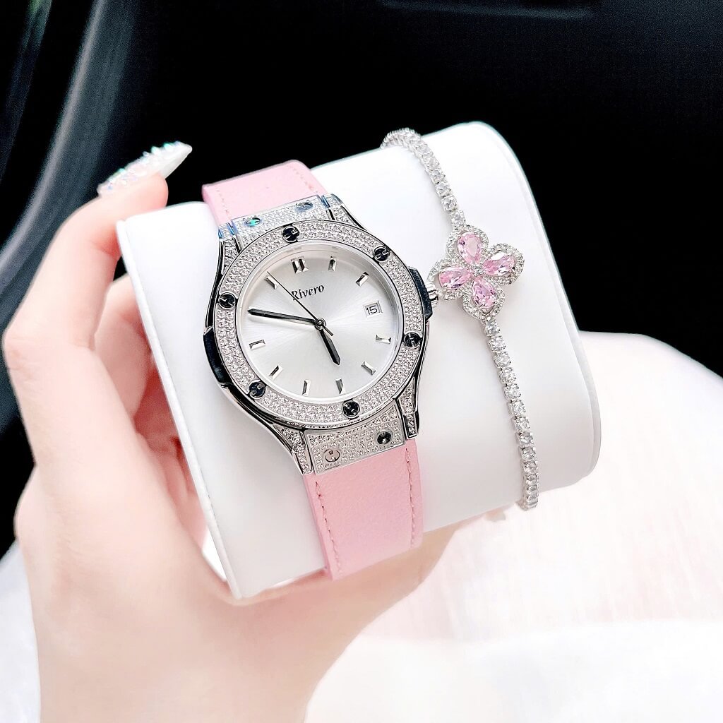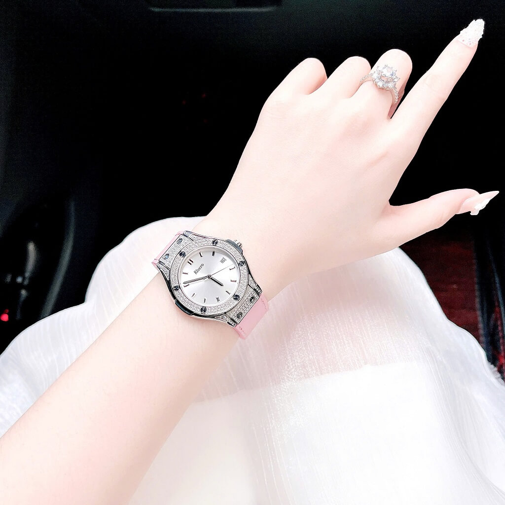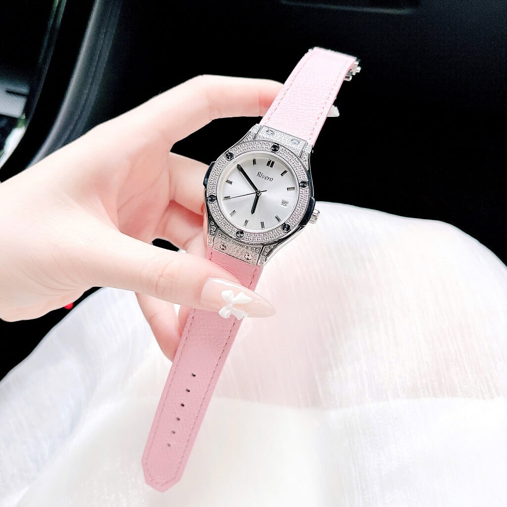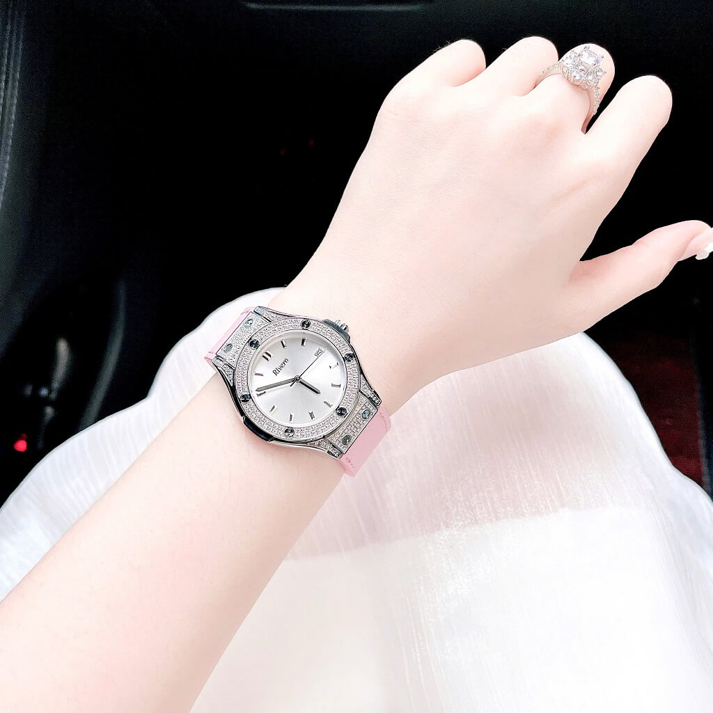 Thông số chi tiết sản phẩm: Đồng Hồ Nữ Rivero R9009 Dây Da Hồng Vỏ Màu Silver Đính Đá Size 34mm Chính Hãng