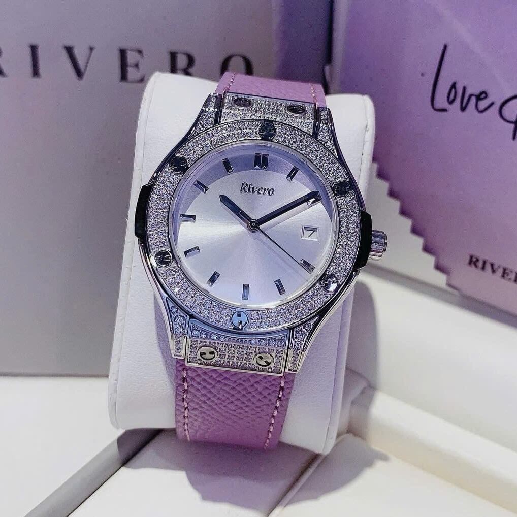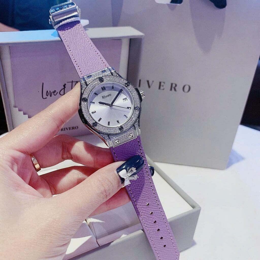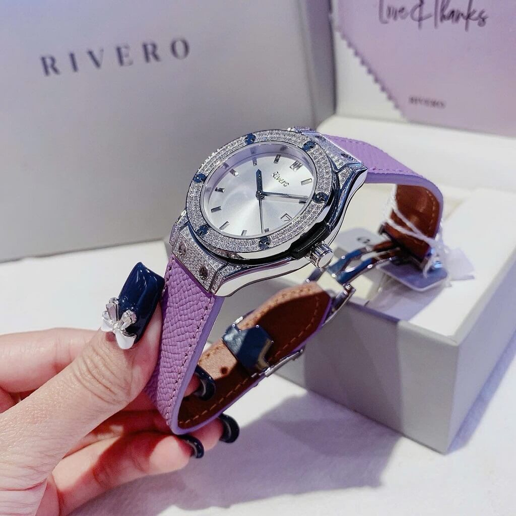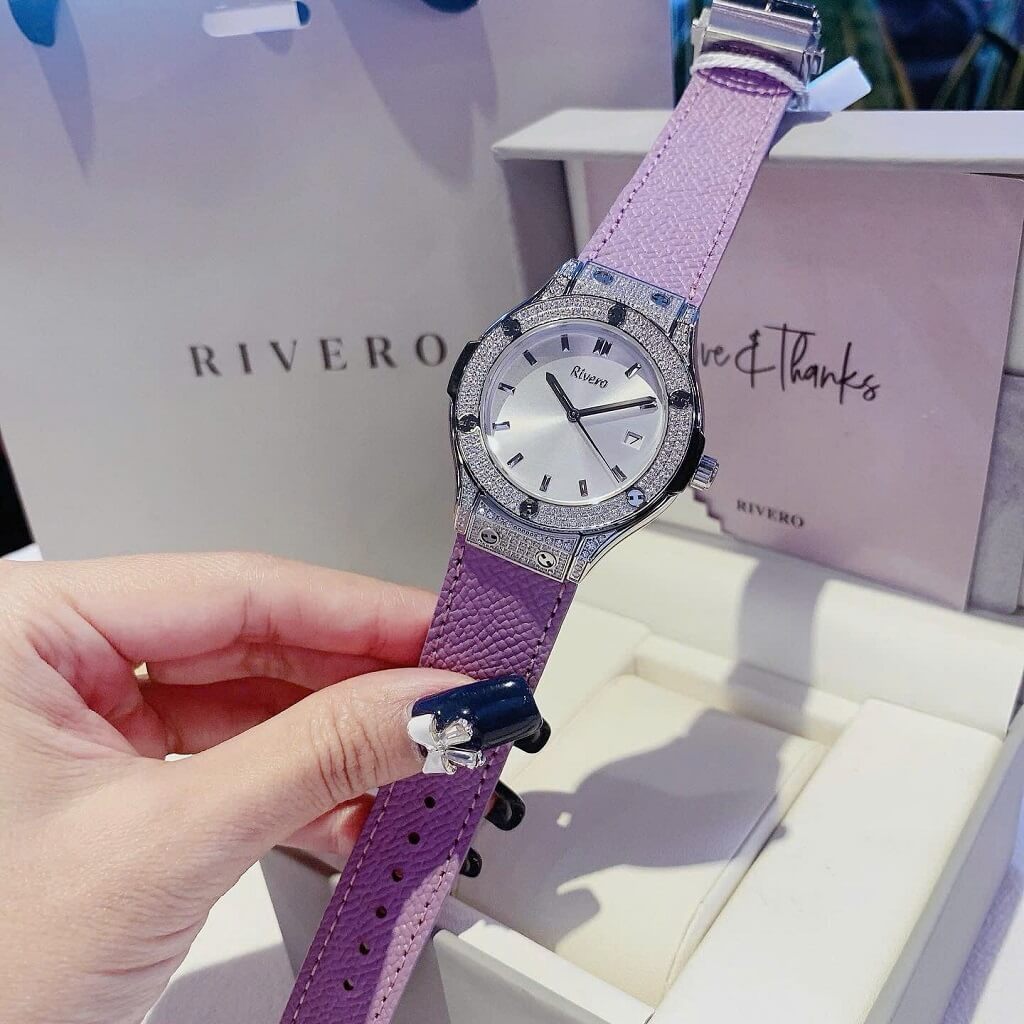 Thông số chi tiết sản phẩm: Đồng Hồ Nữ Rivero R9009 Dây Da Tím Vỏ Màu Silver Đính Đá Size 34mm Chính Hãng