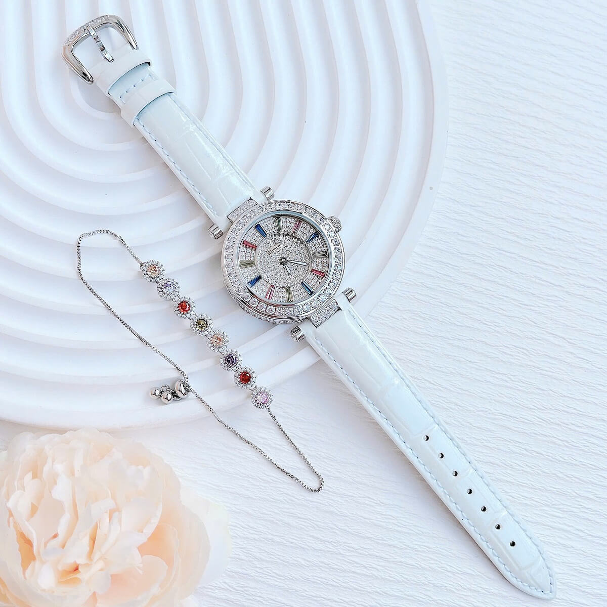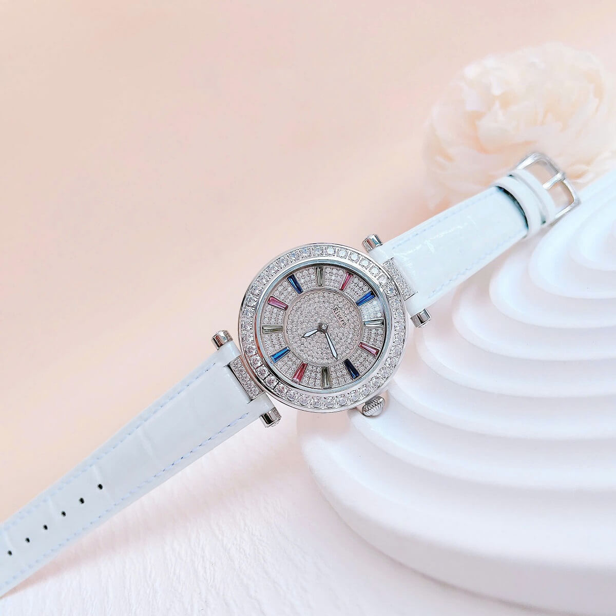 Rivero R9015 là sự kết hợp hoàn hảo giữa yếu tố thẩm mỹ và năng lượng phong thủy. Thiết kế nổi bật với mặt số viền đá bán quý – biểu tượng của sự may mắn và bình an, đi cùng dây da trắng thanh lịch và vỏ silver sáng bóng, tạo nên một chiếc đồng hồ không chỉ đẹp mắt mà còn mang ý nghĩa tích cực cho người đeo.