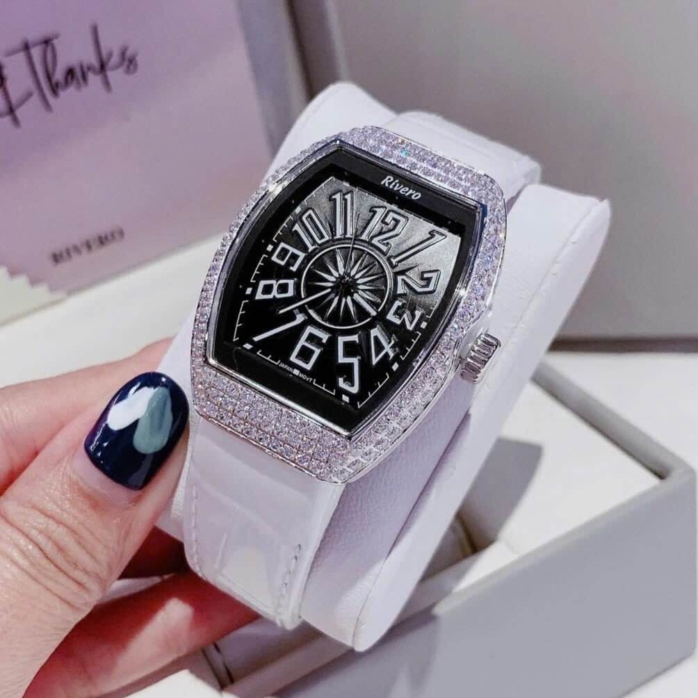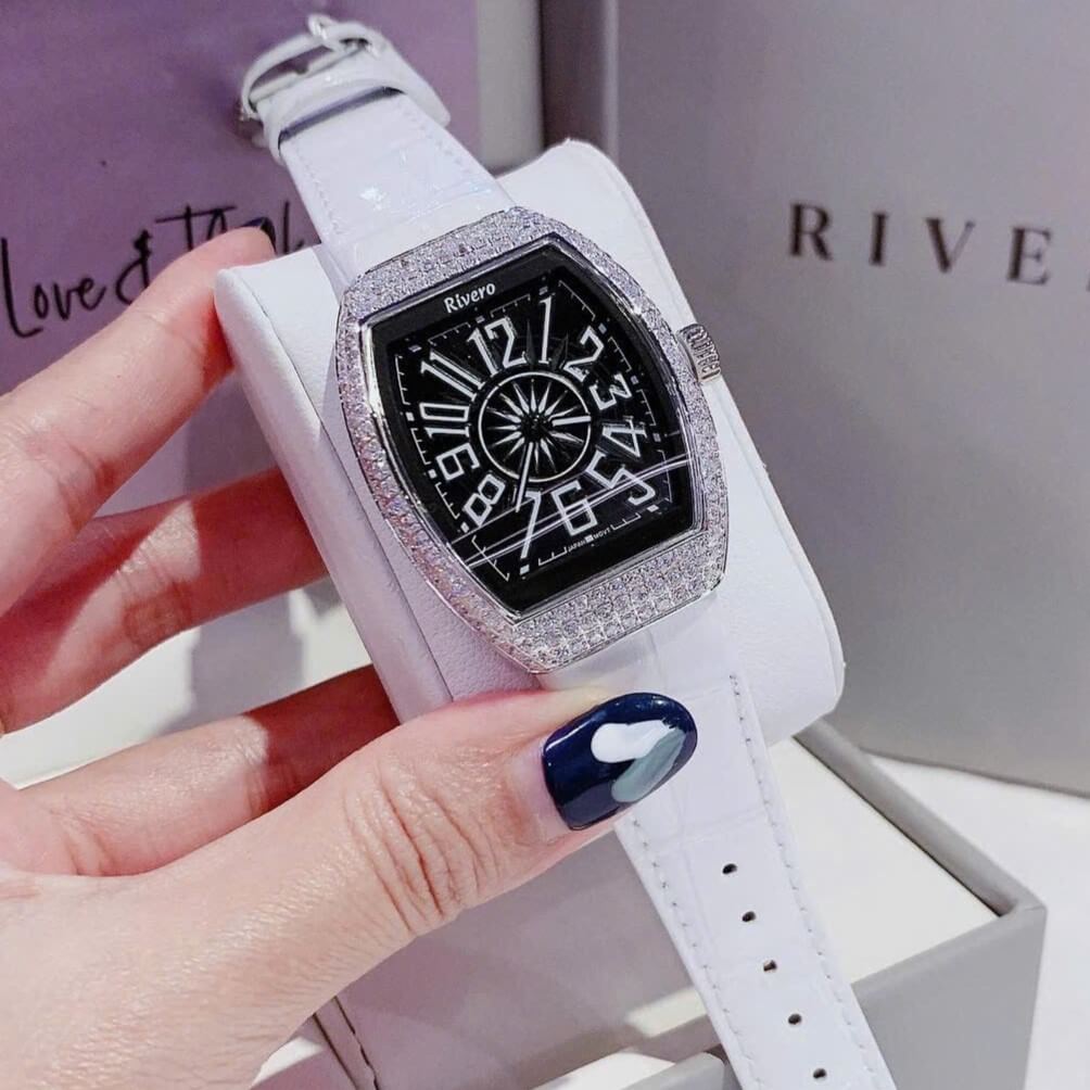 Hình ảnh Đồng Hồ Nữ Rivero R9066 Mặt Ovan Dây Da Trắng Đính Đá Silver Size 32mm