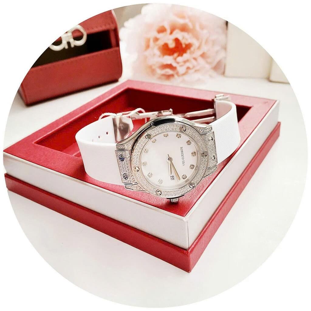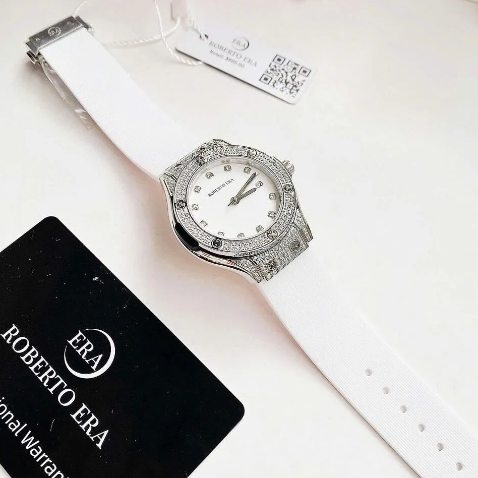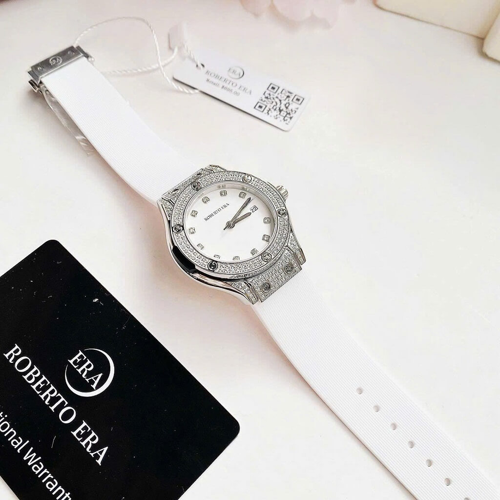 Thông số chi tiết sản phẩm: Đồng Hồ Nữ Roberto Era Dây Cao Su Trắng Vỏ Màu Silver Đính Đá Size 34mm Chính Hãng