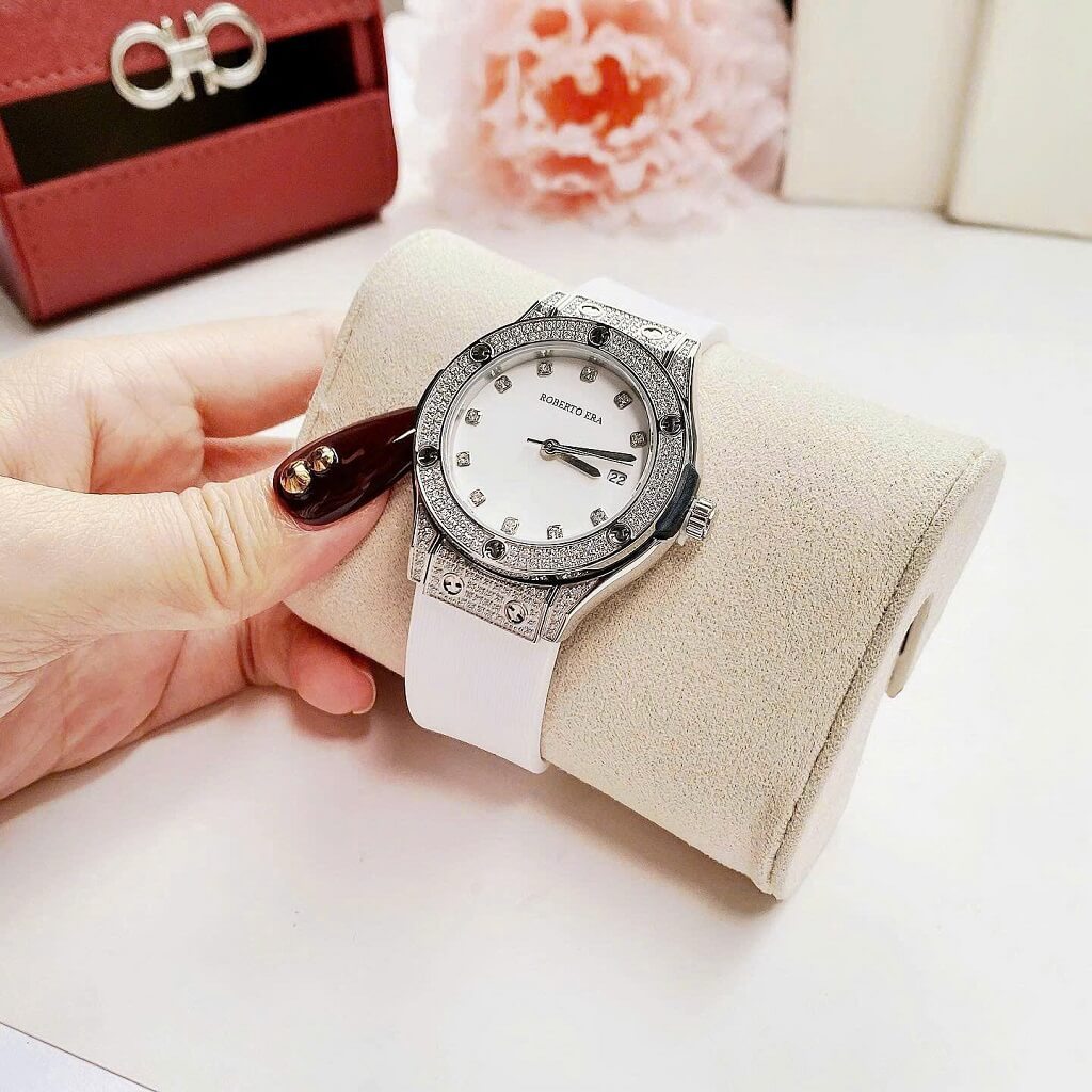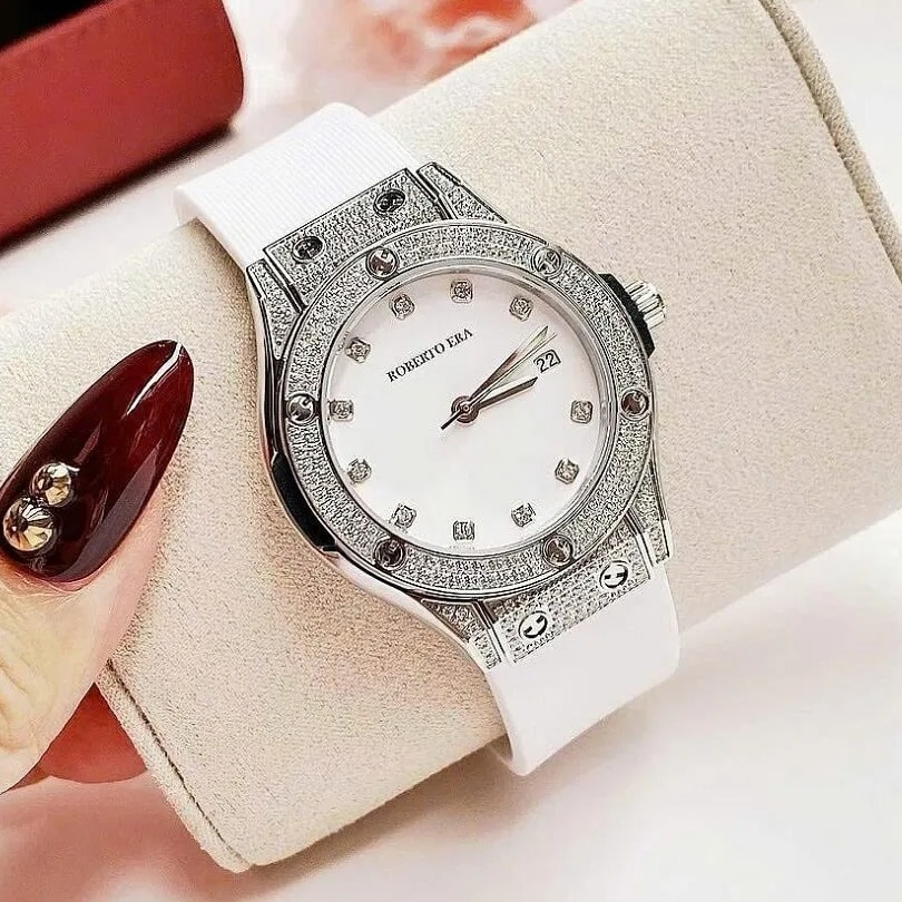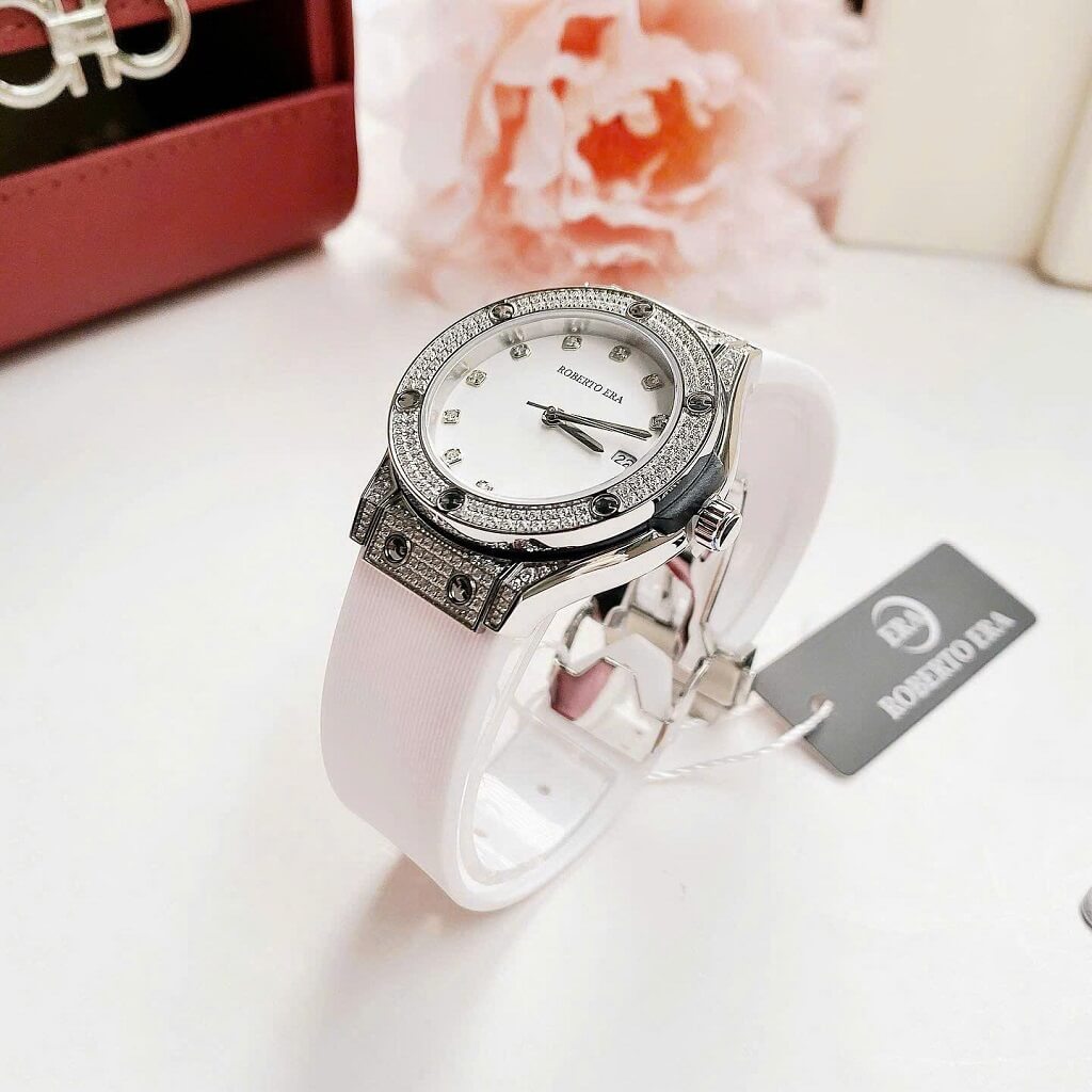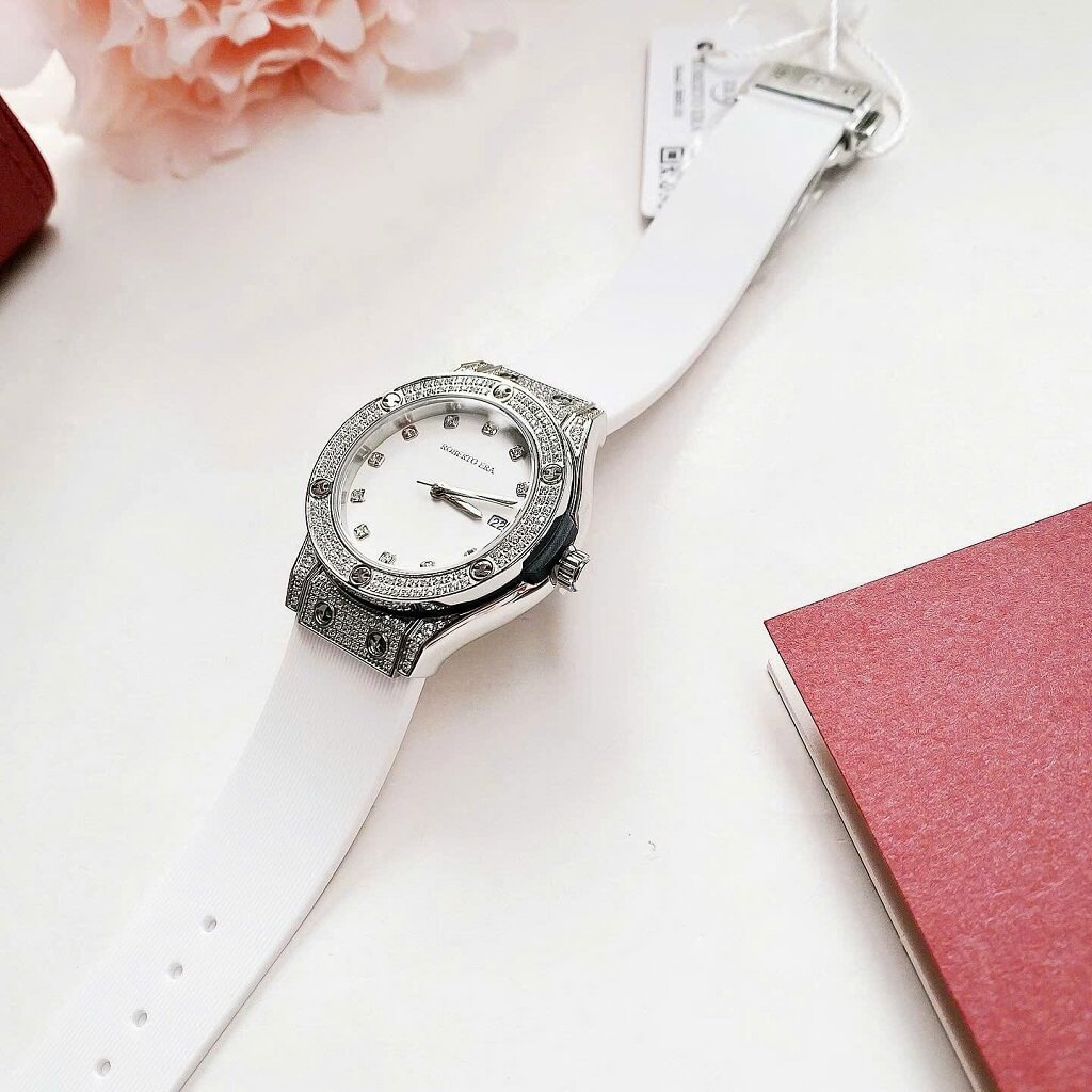 Đồng Hồ Nữ Roberto Era Dây Cao Su Trắng Vỏ Màu Silver Đính Đá Size 34mm Chính Hãng là một mẫu đồng hồ nữ nổi bật với thiết kế sang trọng và trẻ trung. Dưới đây là những đặc điểm chi tiết về chiếc đồng hồ này:
