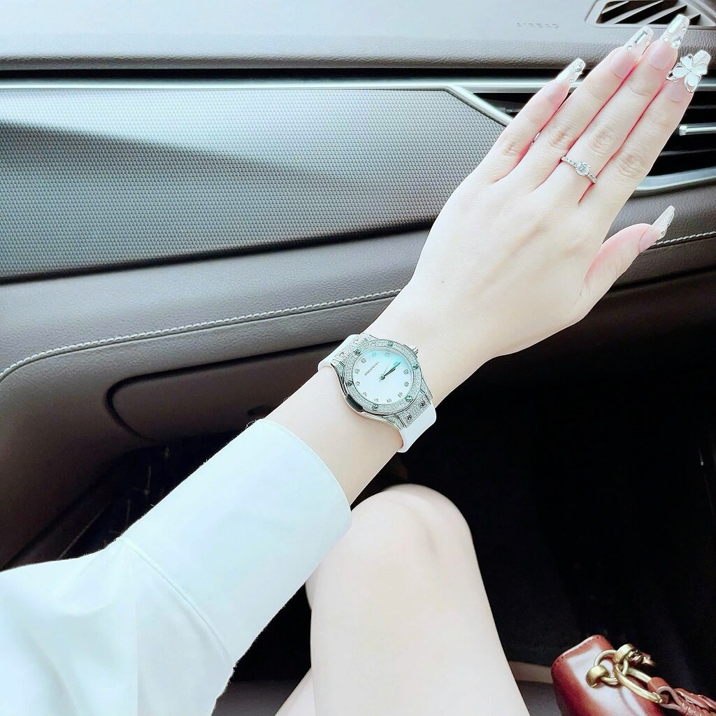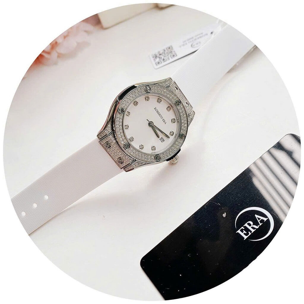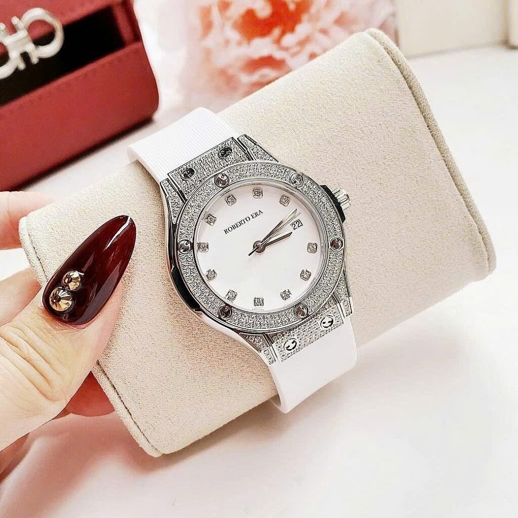 Đồng Hồ Nữ Roberto Era Dây Cao Su Trắng Vỏ Màu Silver Đính Đá Size 34mm Chính Hãng là một mẫu đồng hồ nữ nổi bật với thiết kế sang trọng và trẻ trung. Dưới đây là những đặc điểm chi tiết về chiếc đồng hồ này: