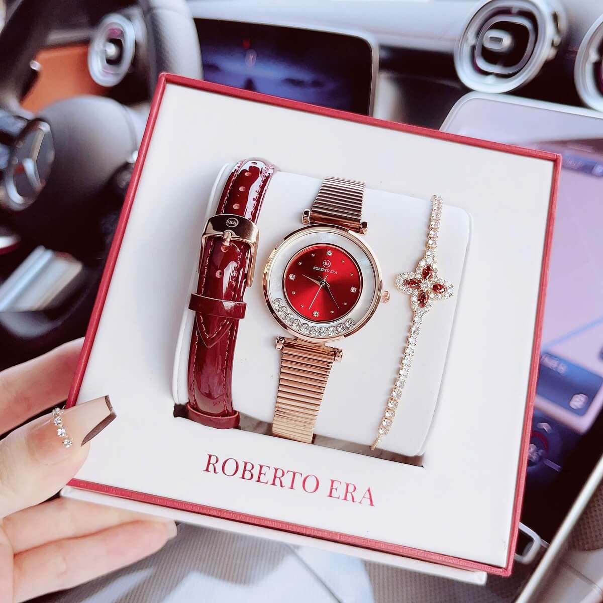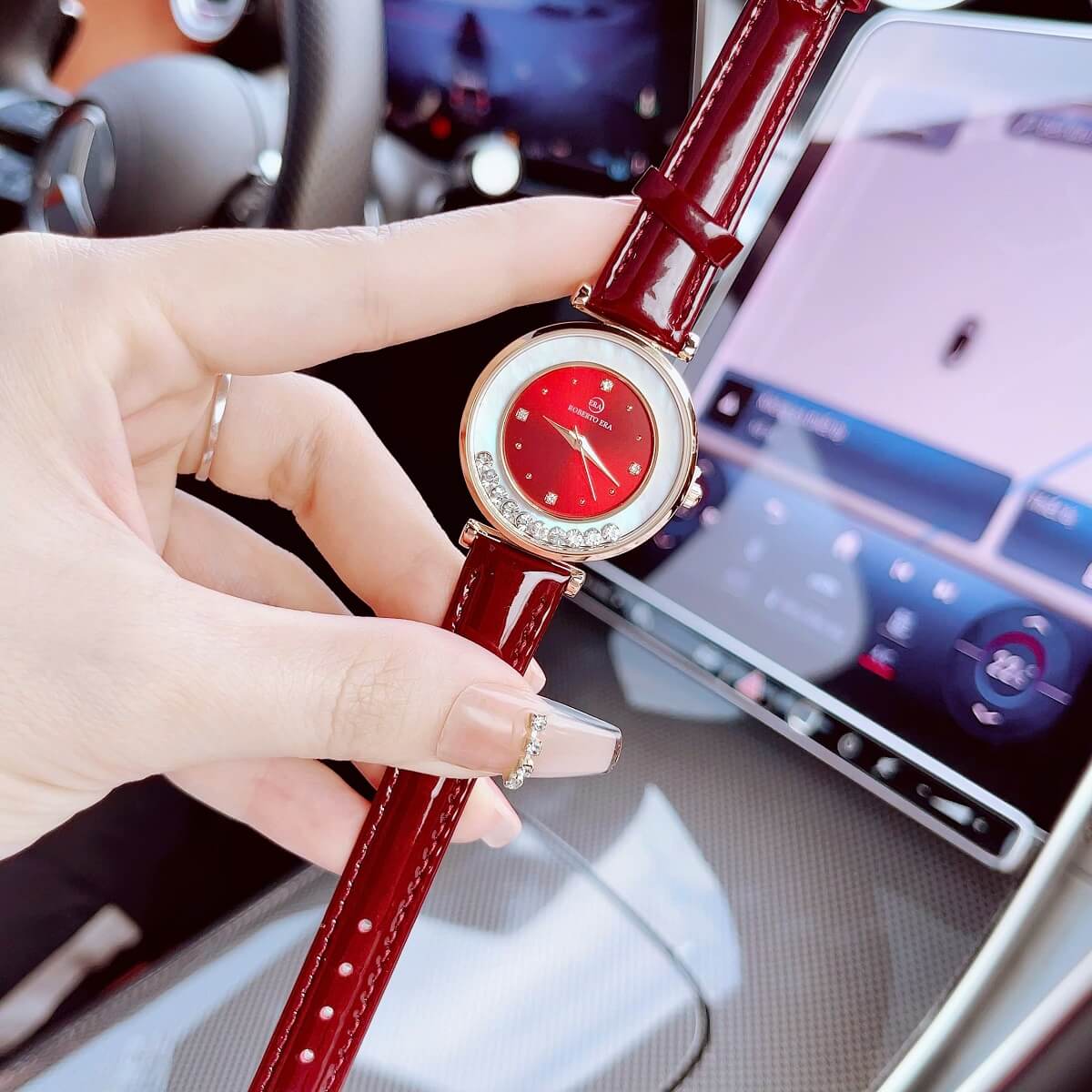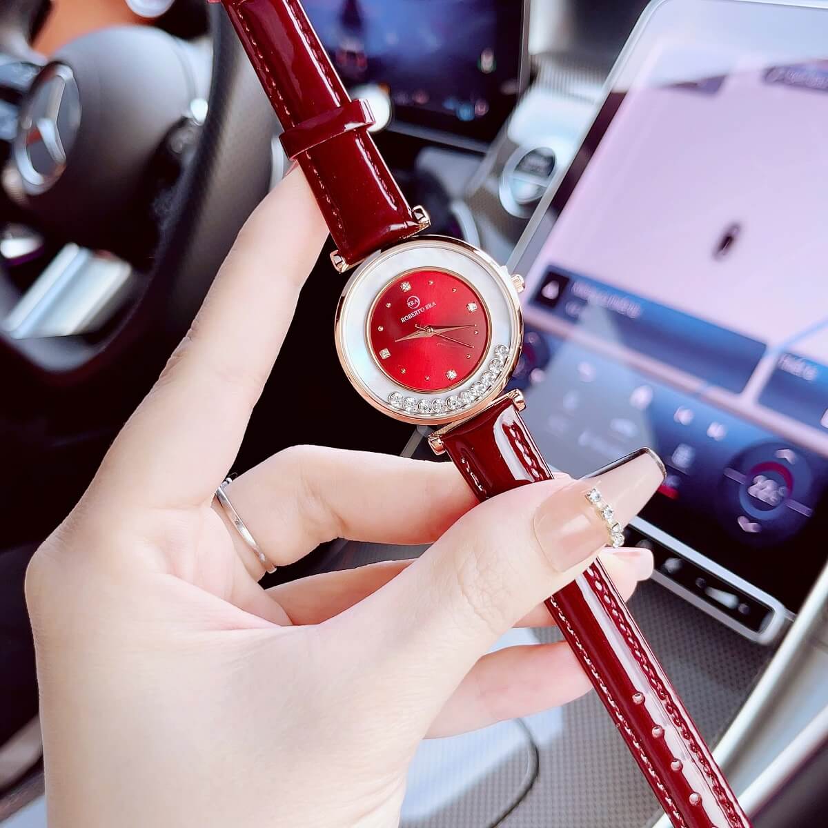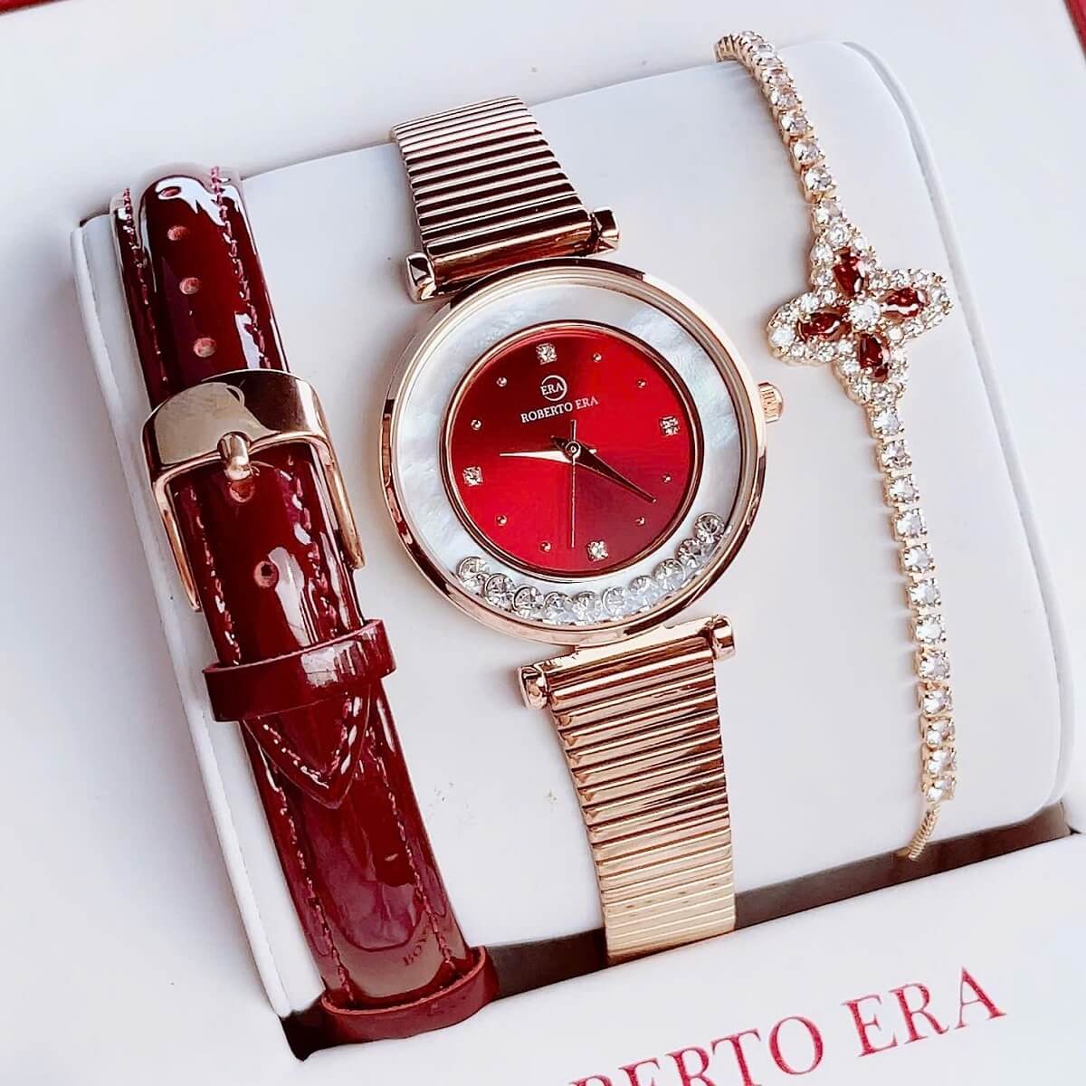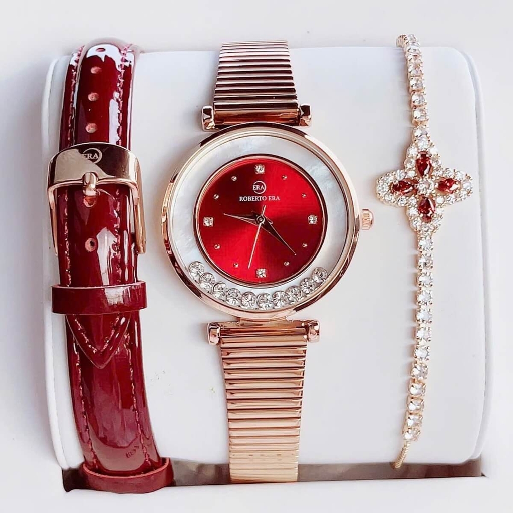 Đồng hồ Roberto Era nữ size 32mm với thiết kế thời thượng, nổi bật nhờ mặt đỏ cuốn hút kết hợp dây da đỏ mềm mại và vỏ kim loại vàng hồng sang trọng. Lên tay cực kỳ nổi bật, phù hợp cho nàng yêu phong cách nữ tính nhưng vẫn muốn tạo điểm nhấn ấn tượng.