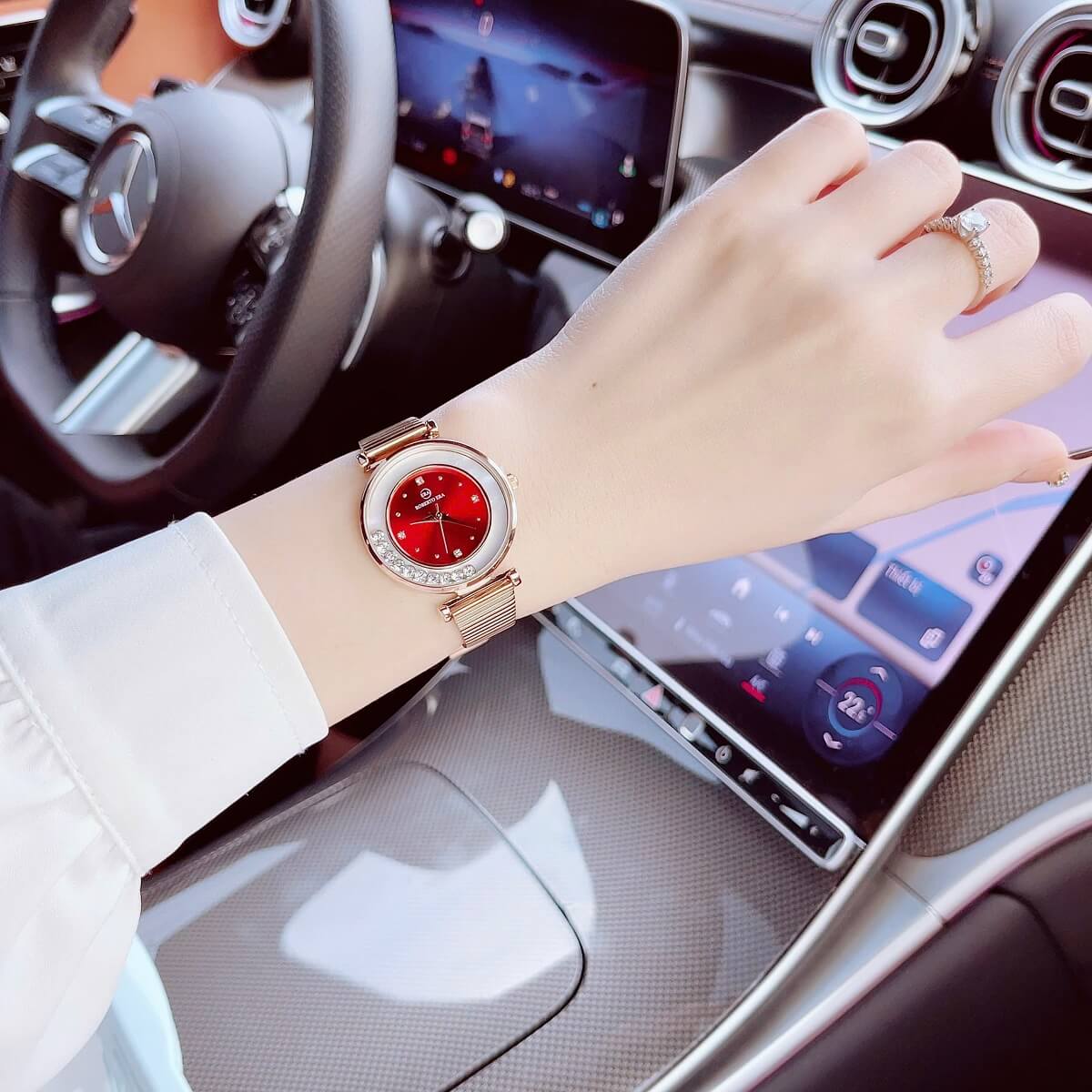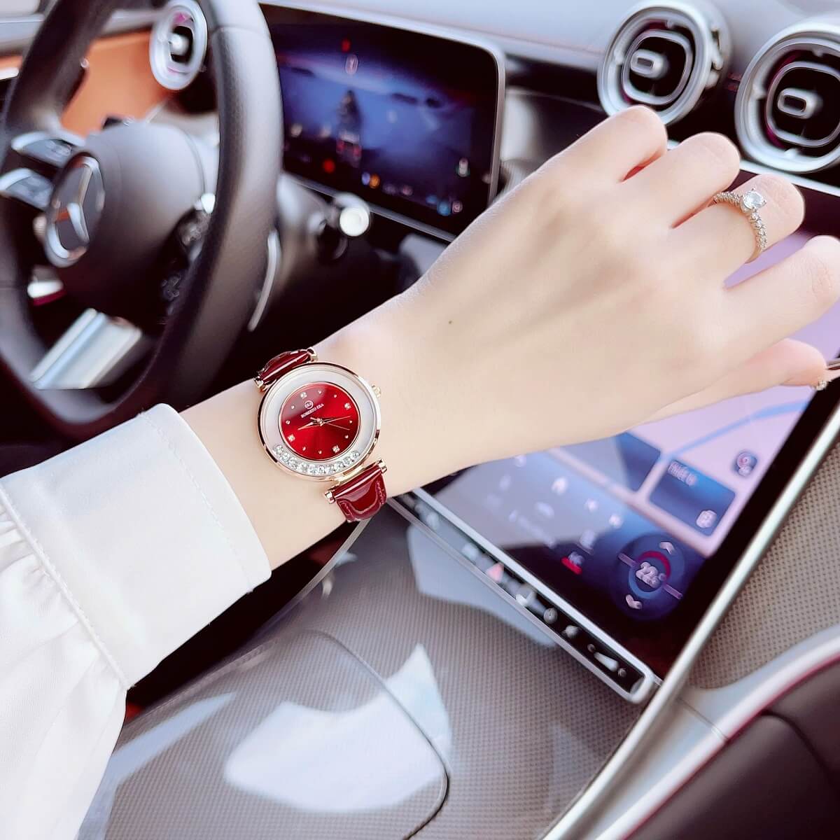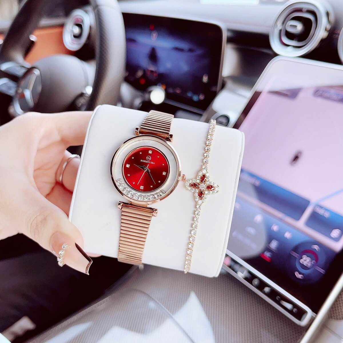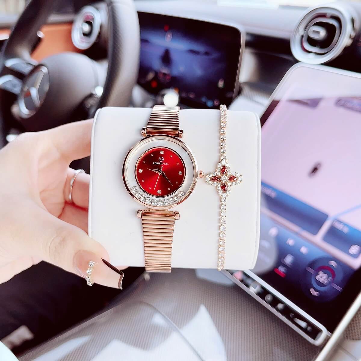 Đồng hồ Roberto Era nữ size 32mm với thiết kế thời thượng, nổi bật nhờ mặt đỏ cuốn hút kết hợp dây da đỏ mềm mại và vỏ kim loại vàng hồng sang trọng. Lên tay cực kỳ nổi bật, phù hợp cho nàng yêu phong cách nữ tính nhưng vẫn muốn tạo điểm nhấn ấn tượng.