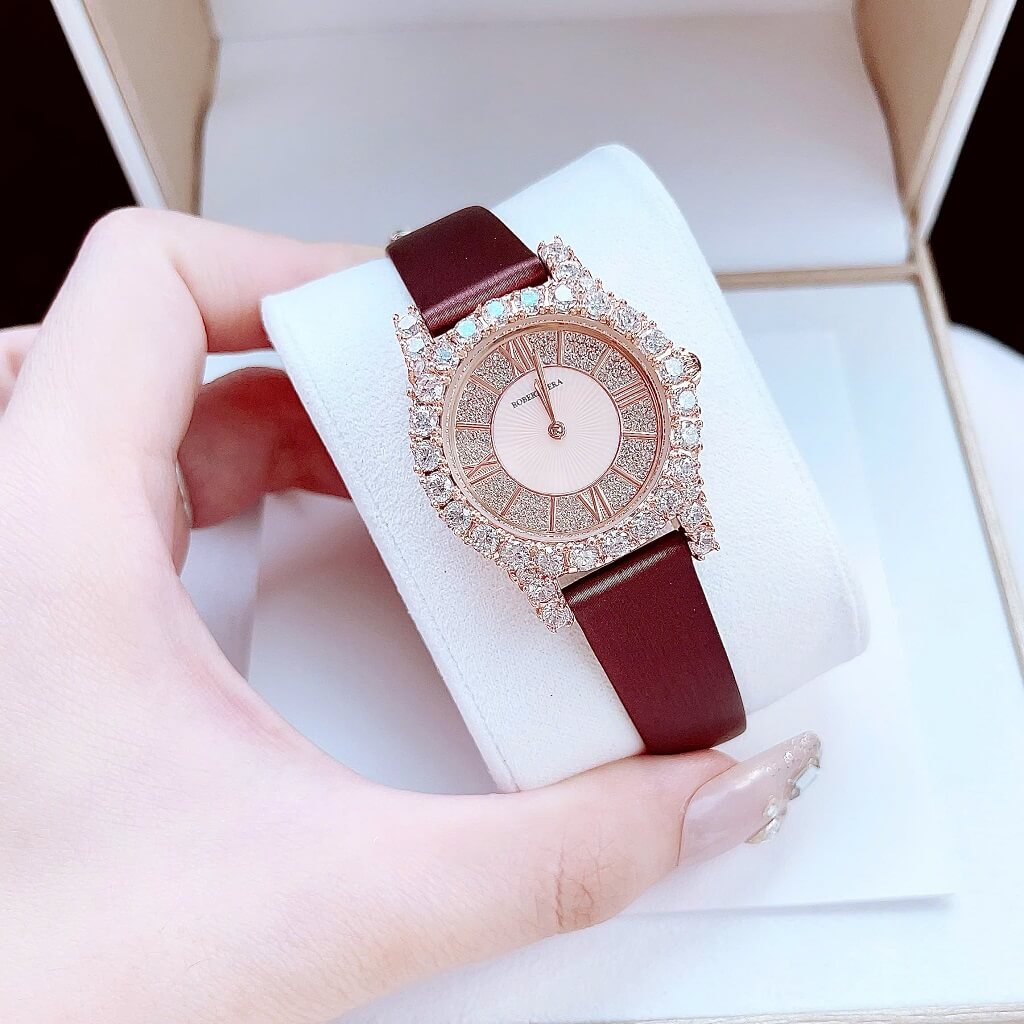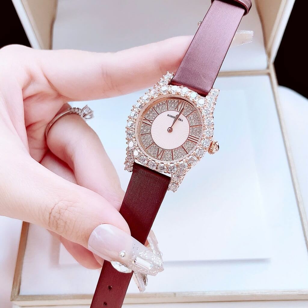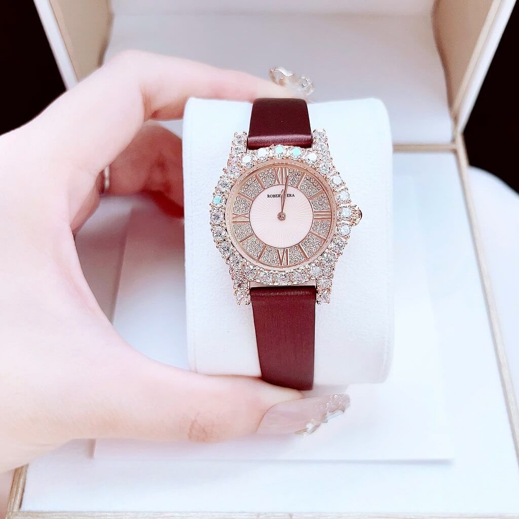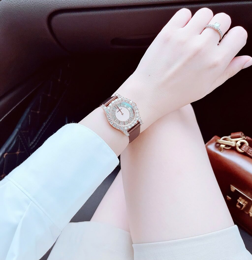 Viền đồng hồ đính đá lấp lánh, bắt sáng nhẹ nhàng mỗi khi xoay cổ tay.
