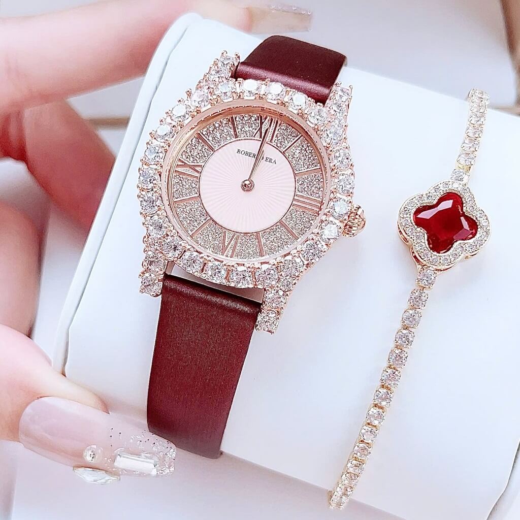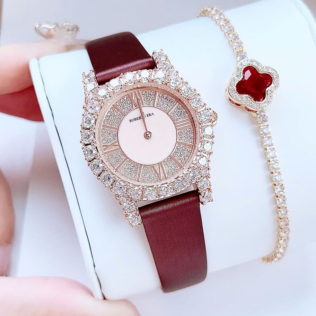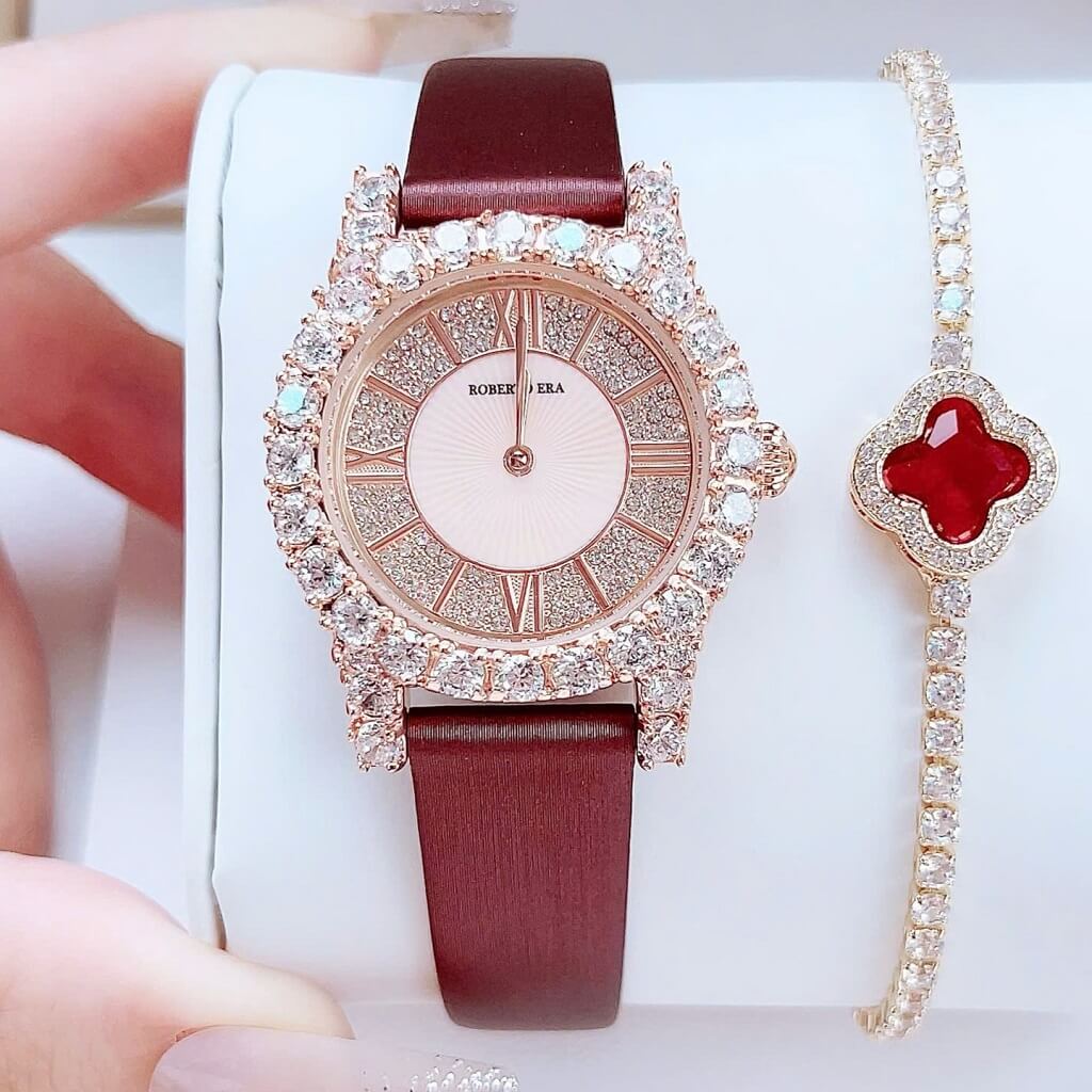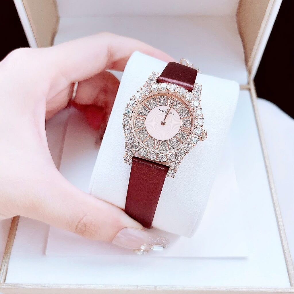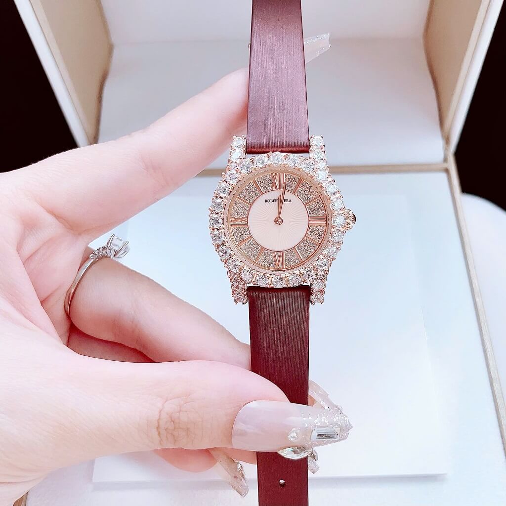 Viền đồng hồ đính đá lấp lánh, bắt sáng nhẹ nhàng mỗi khi xoay cổ tay.
