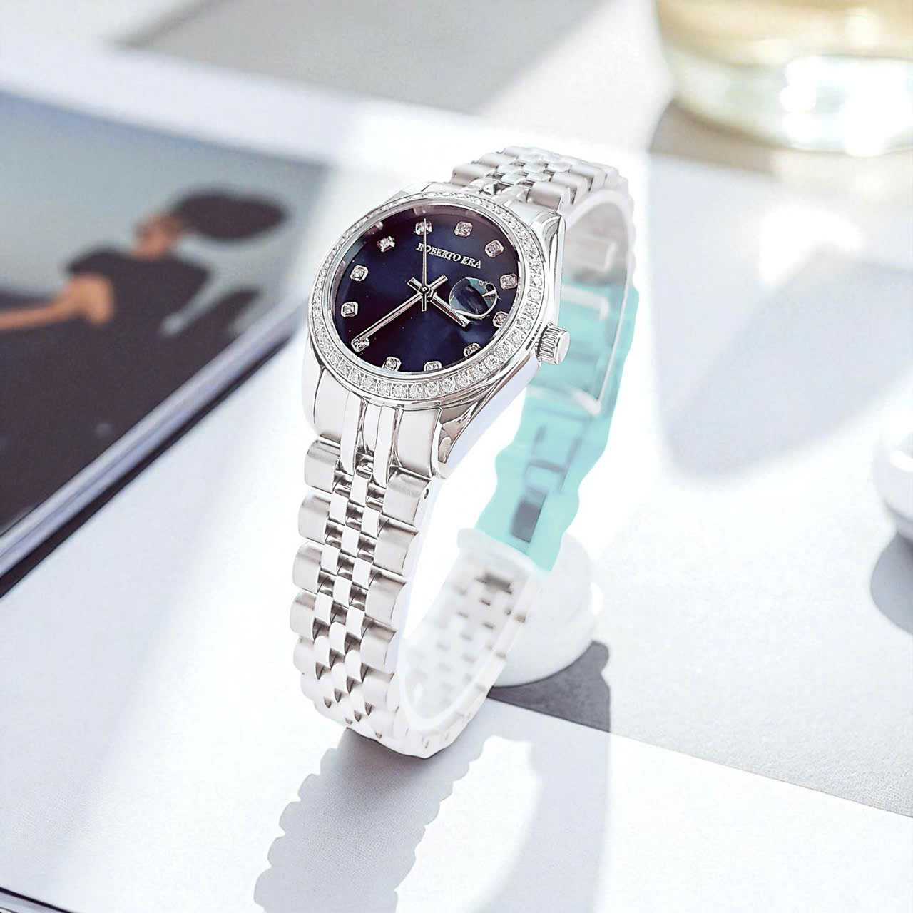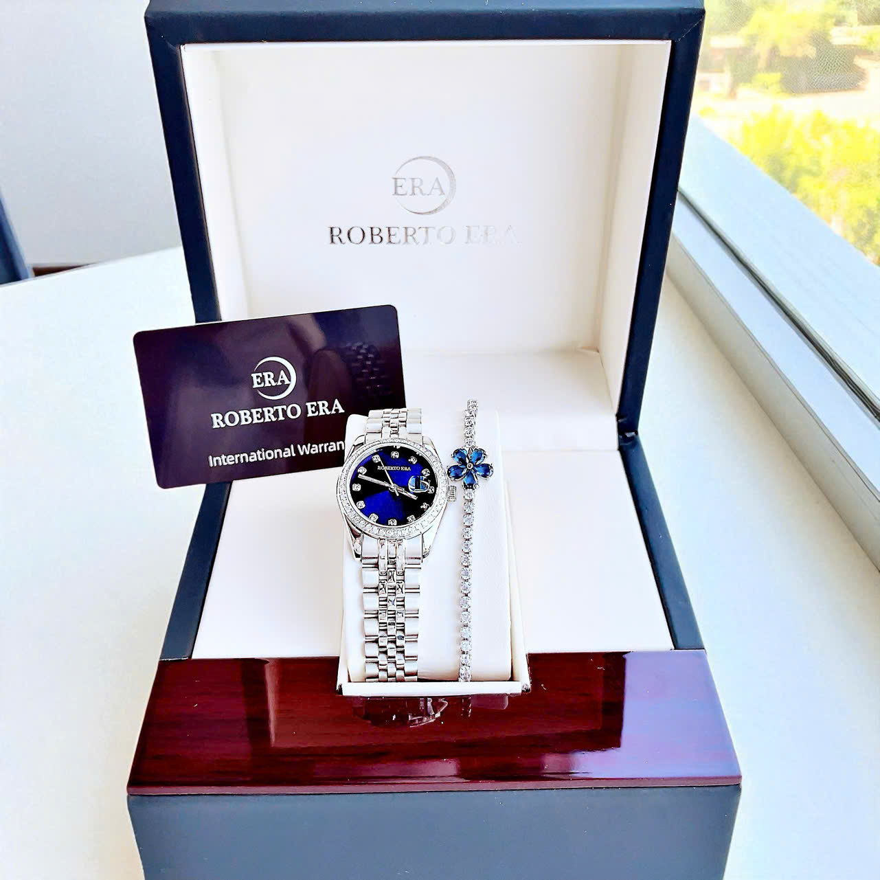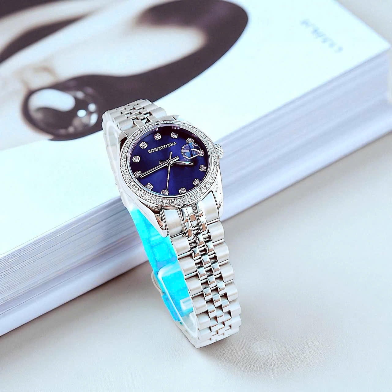 Đồng hồ nữ Roberto Era dây kim loại silver 32mm là sự kết hợp hoàn hảo giữa nét thanh lịch và sang trọng hiện đại. Thiết kế mặt xanh lạ mắt, viền đính đá tinh xảo, dây kim loại silver sáng bóng mang đến tổng thể trẻ trung, quý phái và cực kỳ dễ phối đồ. Đây là một trong những mẫu đồng hồ được nhiều chị em yêu thích nhờ vẻ đẹp nổi bật nhưng không quá phô trương.