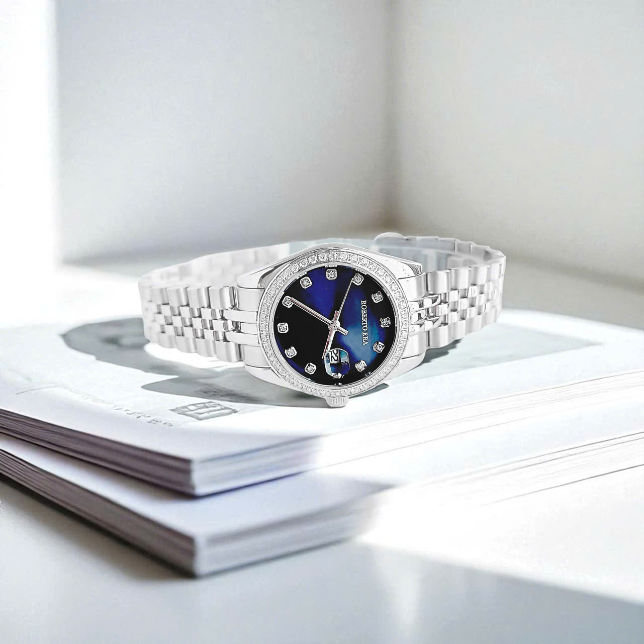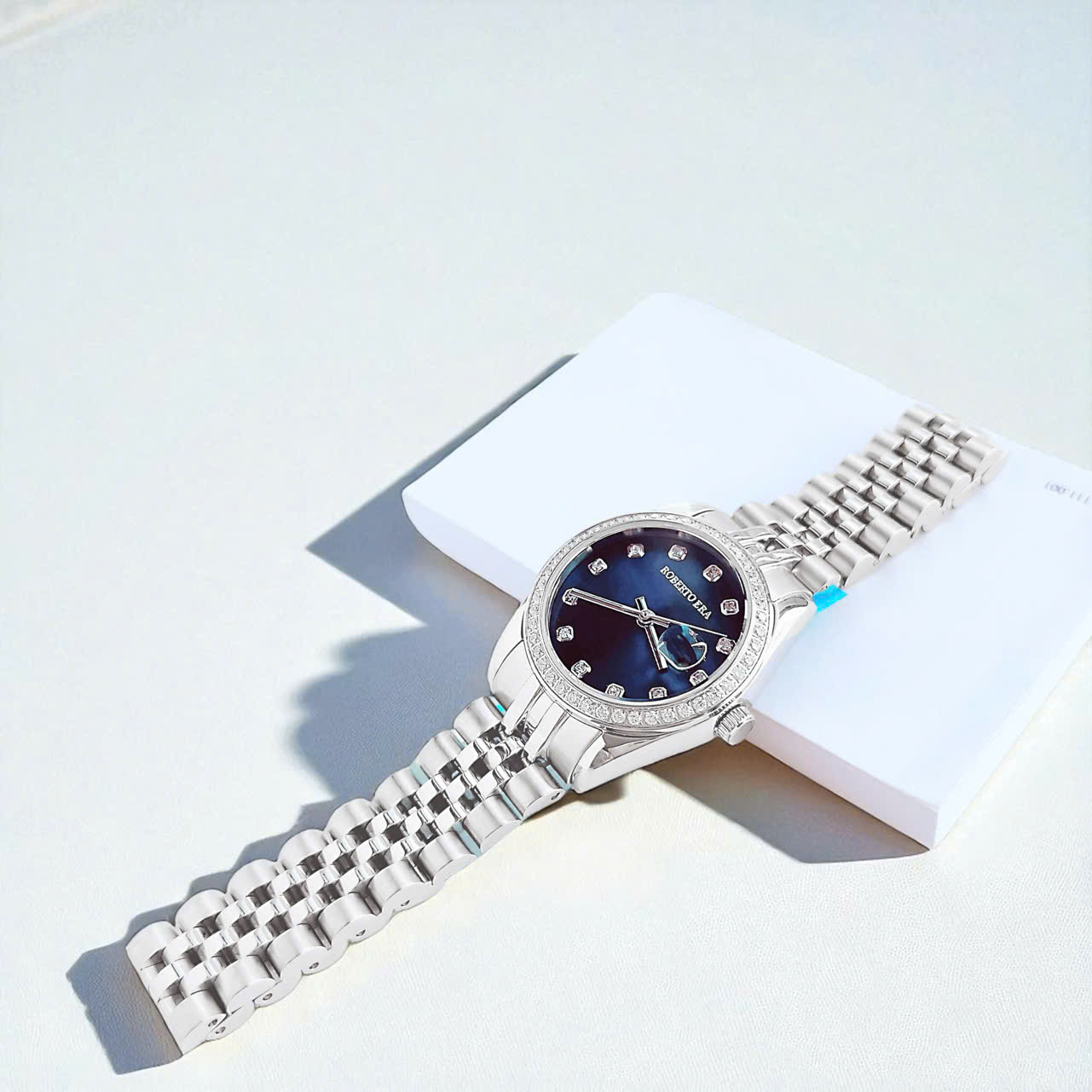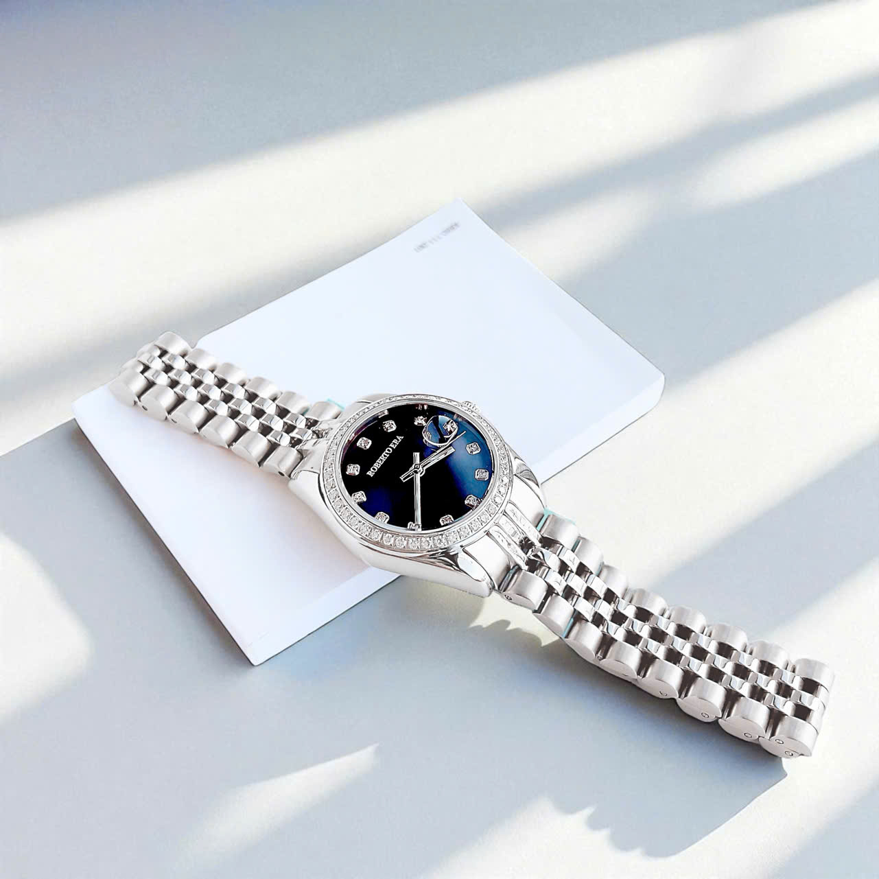 Đồng hồ nữ Roberto Era dây kim loại silver 32mm là sự kết hợp hoàn hảo giữa nét thanh lịch và sang trọng hiện đại. Thiết kế mặt xanh lạ mắt, viền đính đá tinh xảo, dây kim loại silver sáng bóng mang đến tổng thể trẻ trung, quý phái và cực kỳ dễ phối đồ. Đây là một trong những mẫu đồng hồ được nhiều chị em yêu thích nhờ vẻ đẹp nổi bật nhưng không quá phô trương.