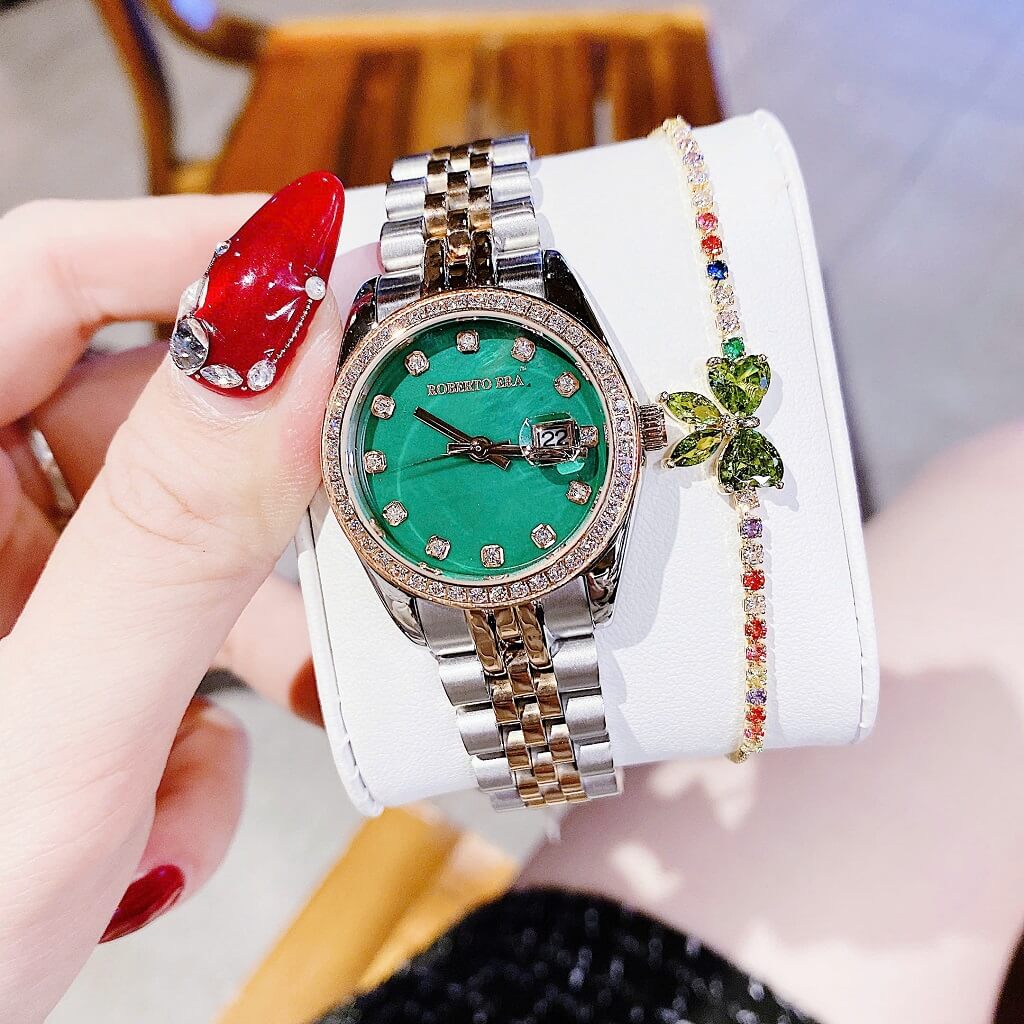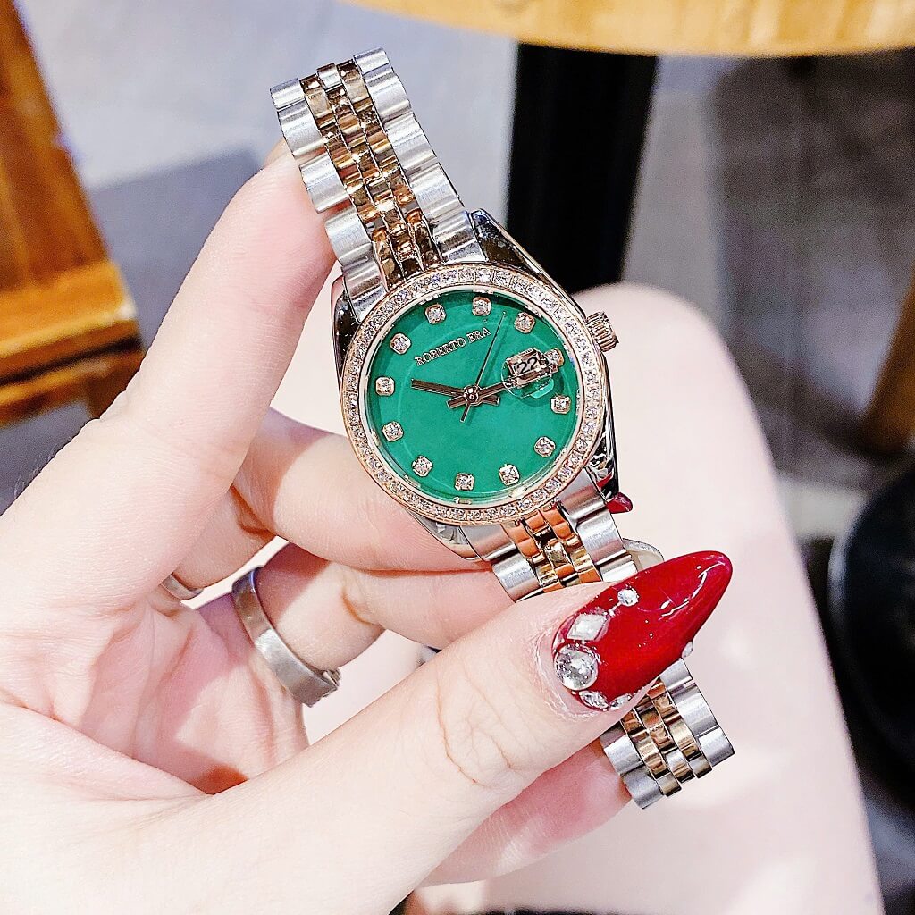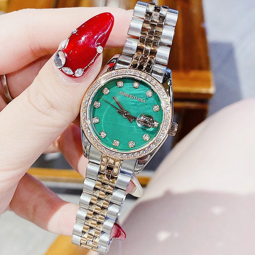 Đồng Hồ Nữ Roberto Era Dây Vỏ Inox Demi Green Viền Đá Size 31mm Chính Hãng là một mẫu đồng hồ nữ cao cấp, được thiết kế tinh tế và sang trọng. Sau đây là một số thông tin nổi bật về chiếc đồng hồ này: