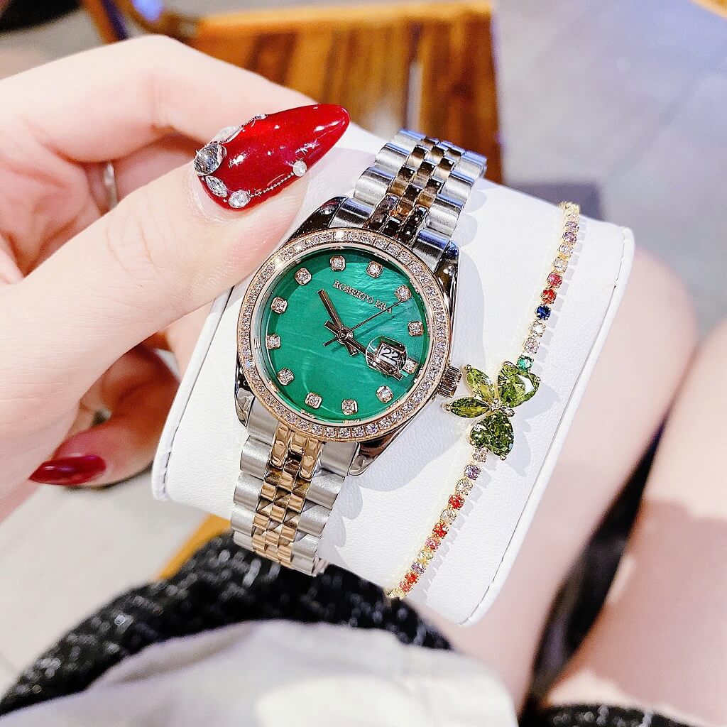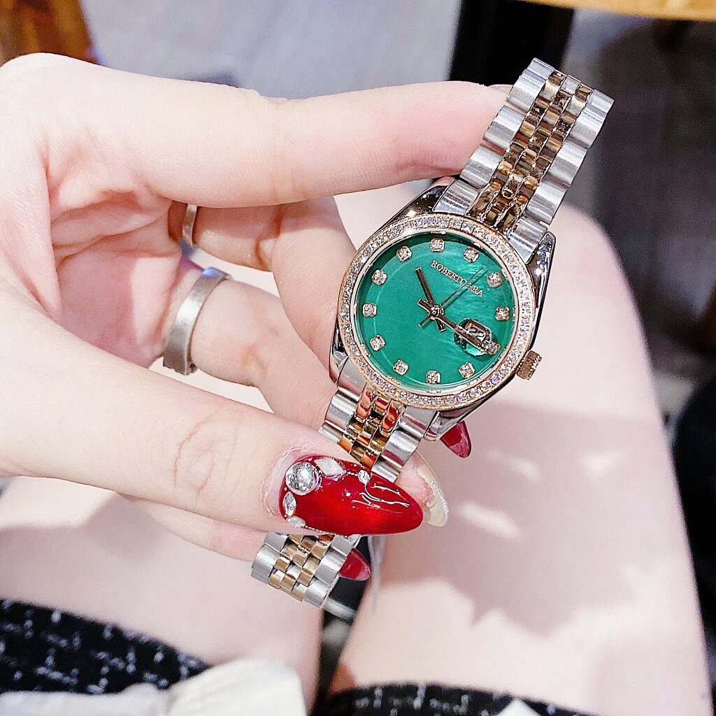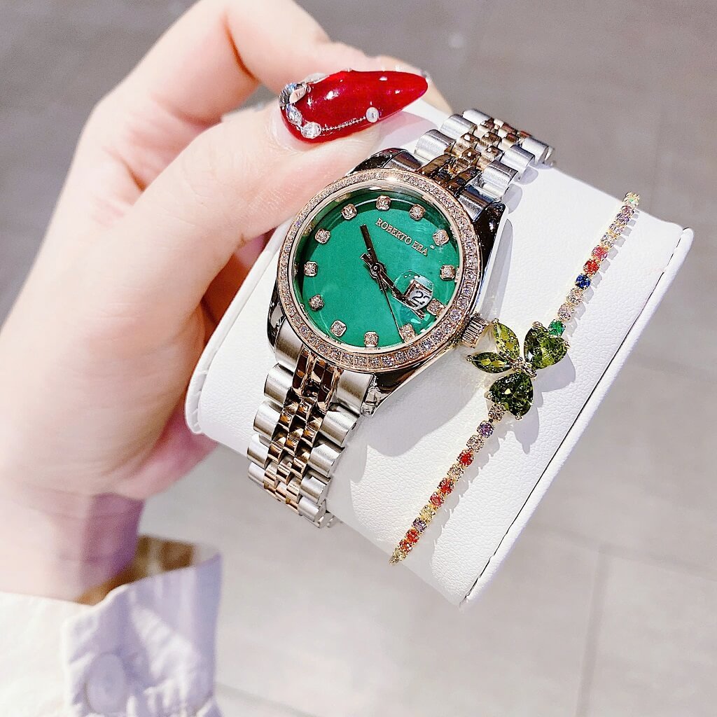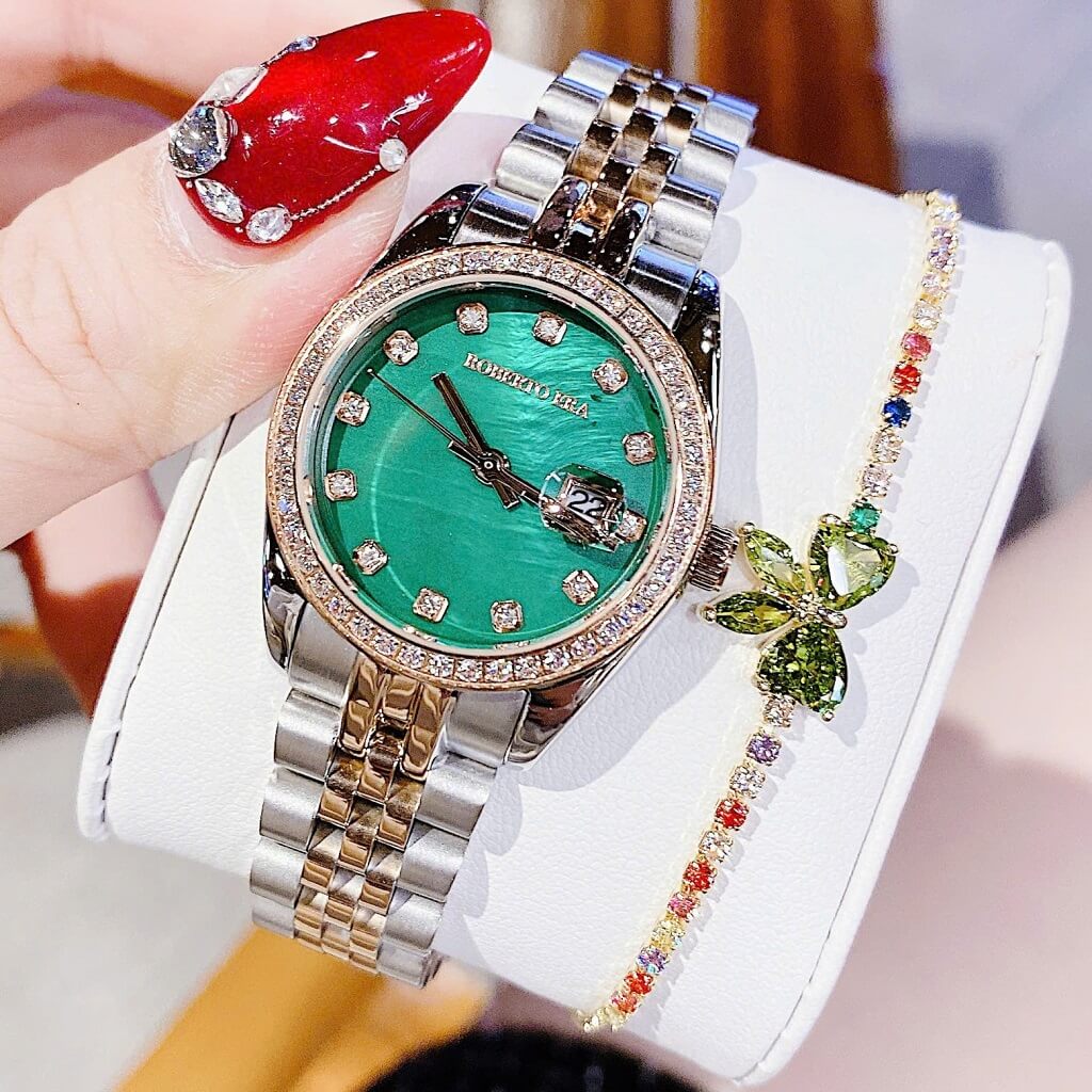 Đồng Hồ Nữ Roberto Era Dây Vỏ Inox Demi Green Viền Đá Size 31mm Chính Hãng là một mẫu đồng hồ nữ cao cấp, được thiết kế tinh tế và sang trọng. Sau đây là một số thông tin nổi bật về chiếc đồng hồ này: