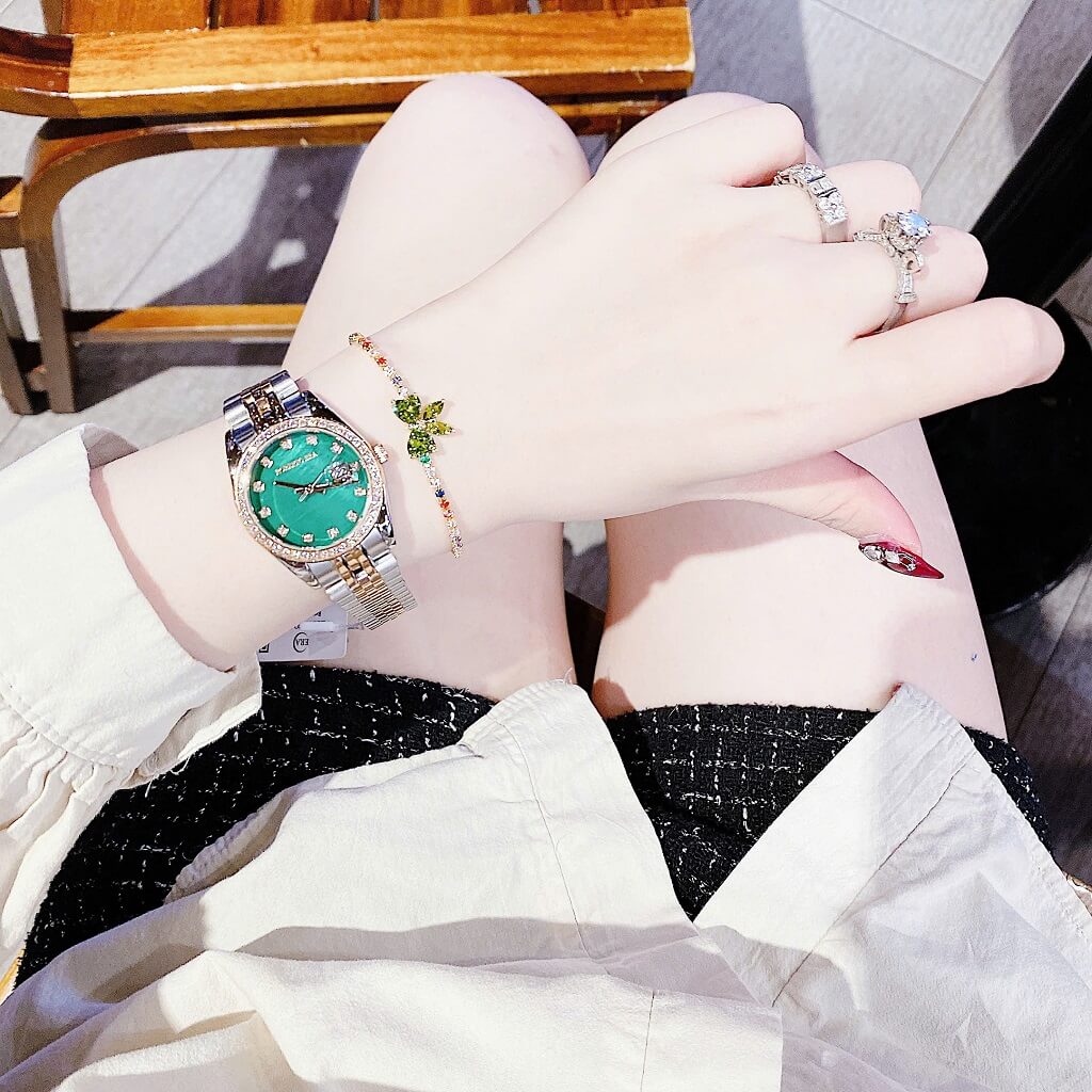 Thông số chi tiết sản phẩm: Đồng Hồ Nữ Roberto Era Dây Vỏ Inox Demi Green Viền Đá Size 31mm Chính Hãng