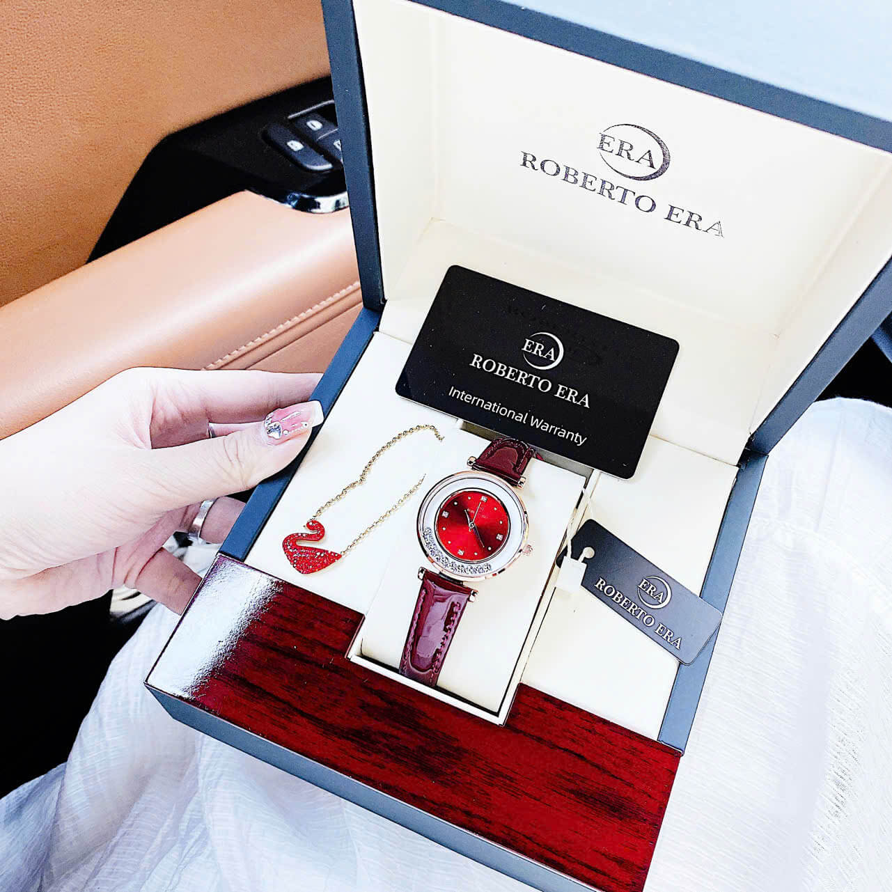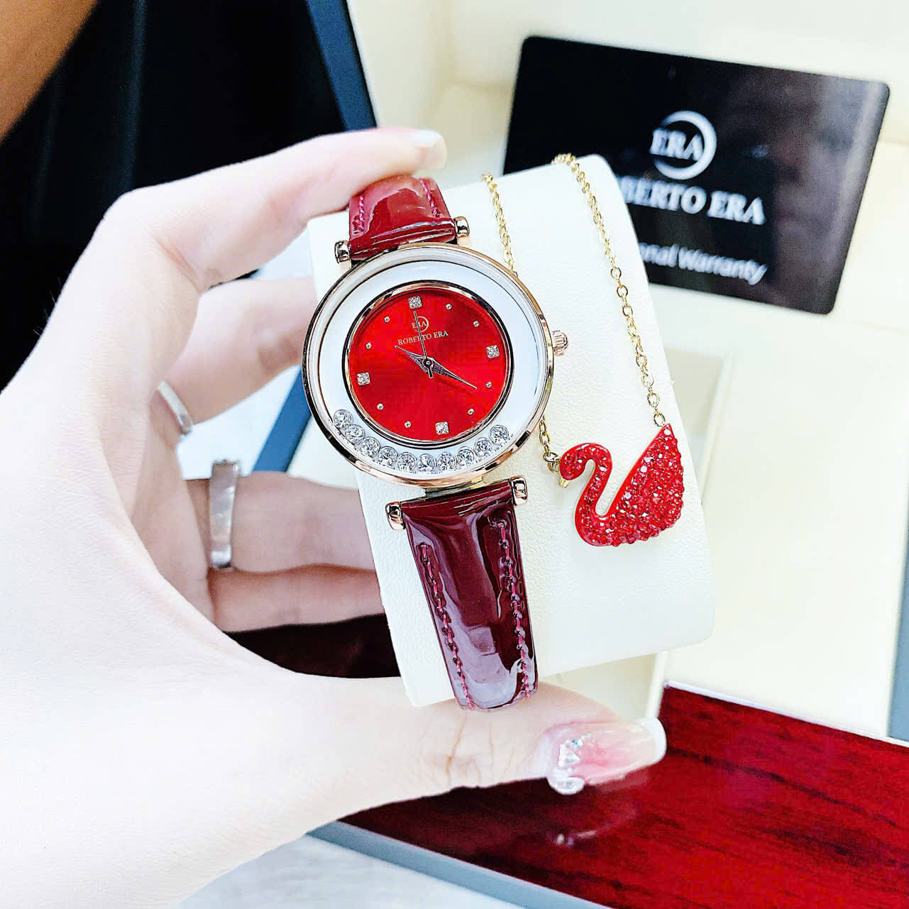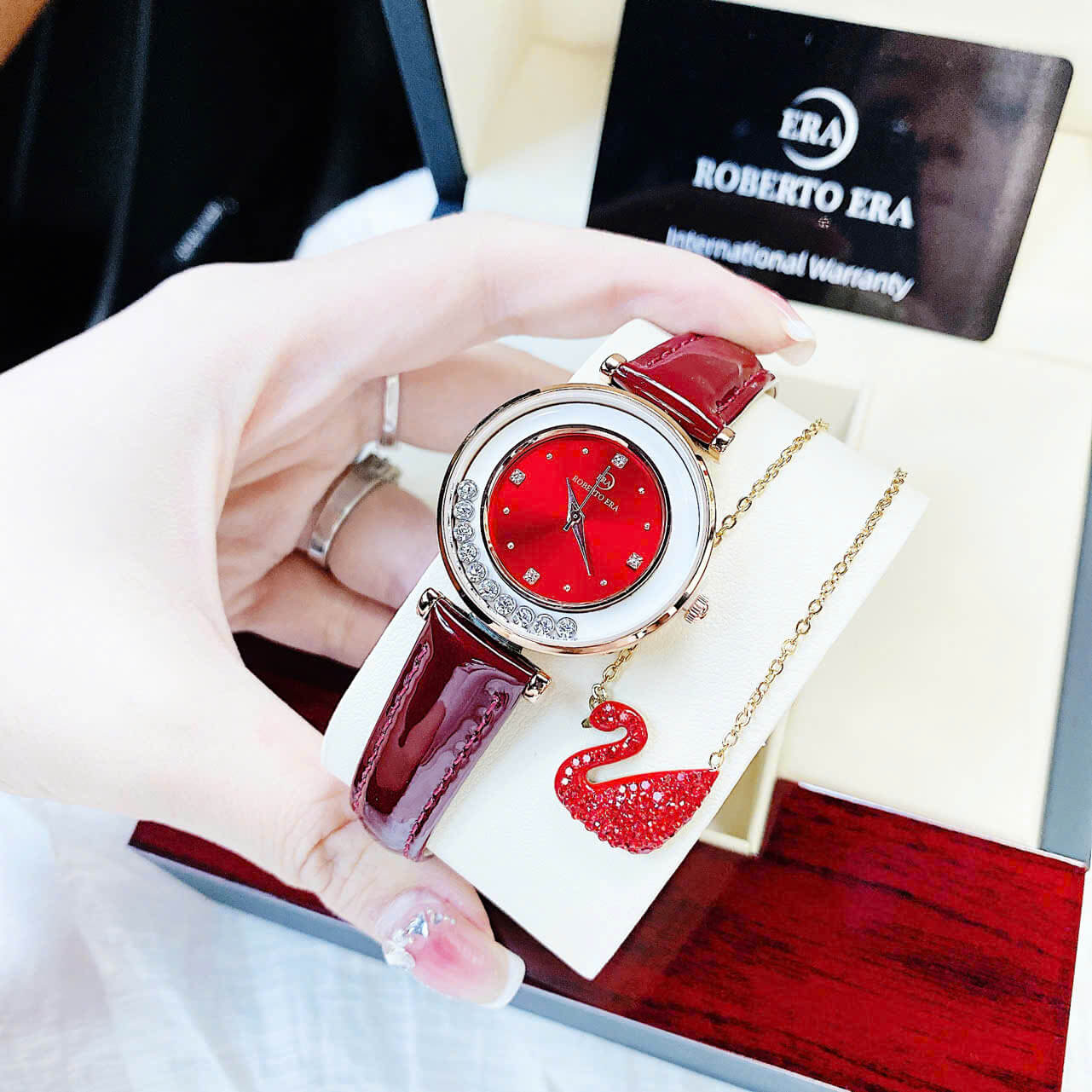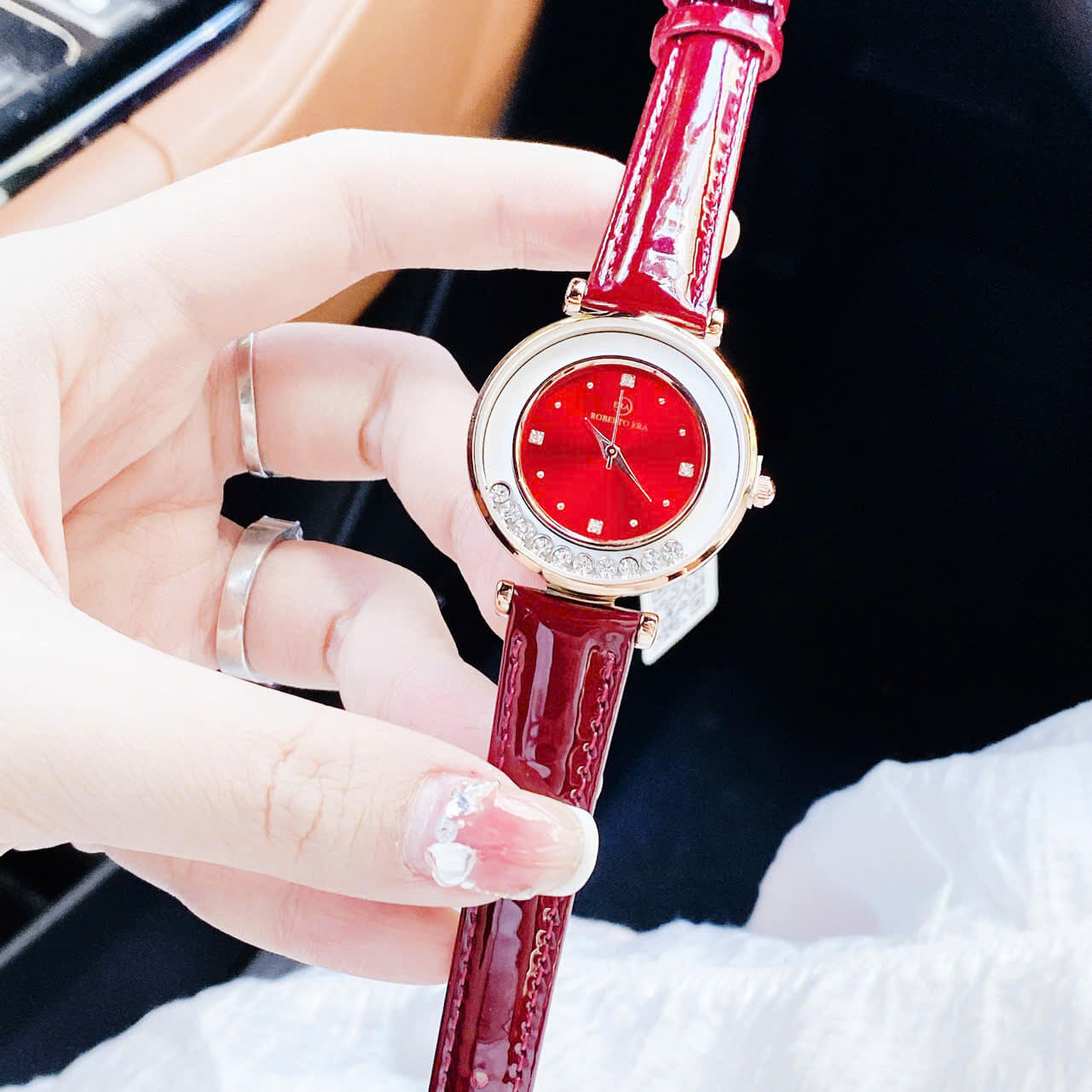 THÔNG TIN SẢN PHẨM: Đồng Hồ Nữ Roberto Era Mặt Đỏ Viền Đá Chạy Dây Da Đỏ Kim Loại Vàng Hồng Máy Pin Size 32mm