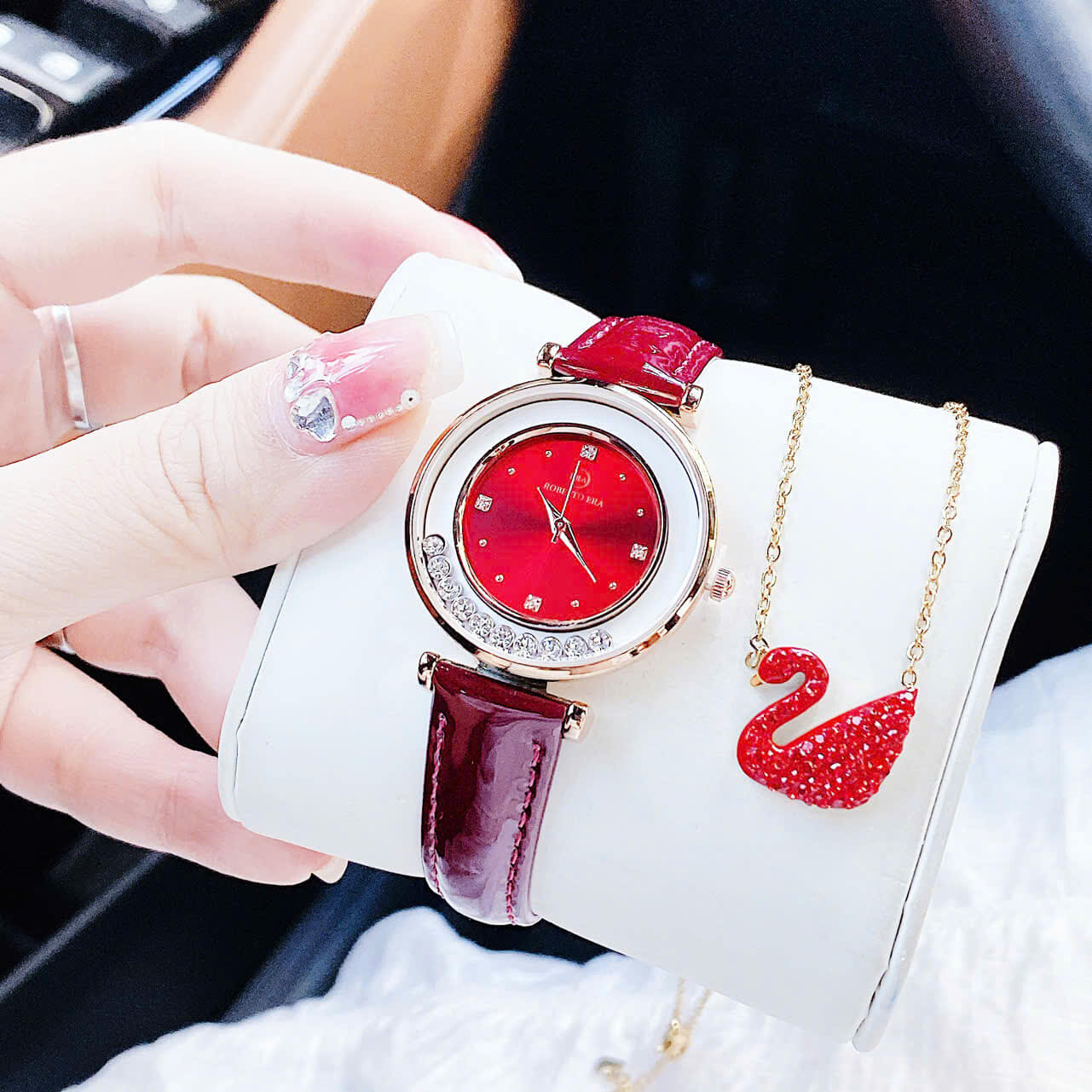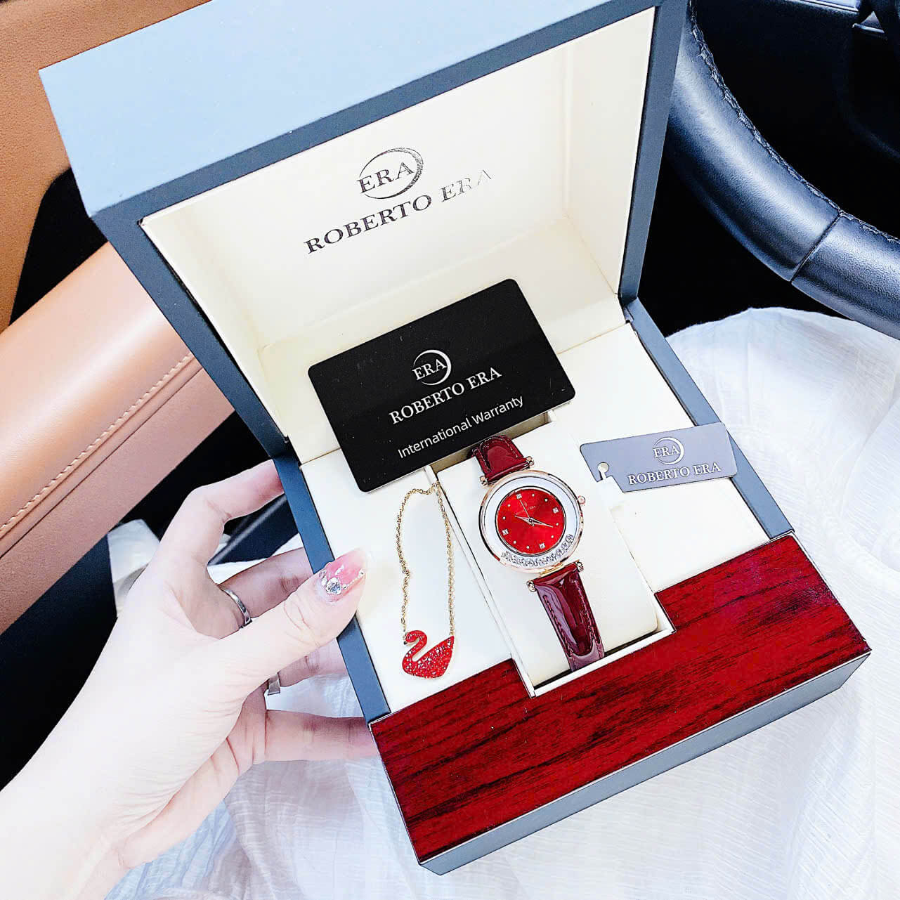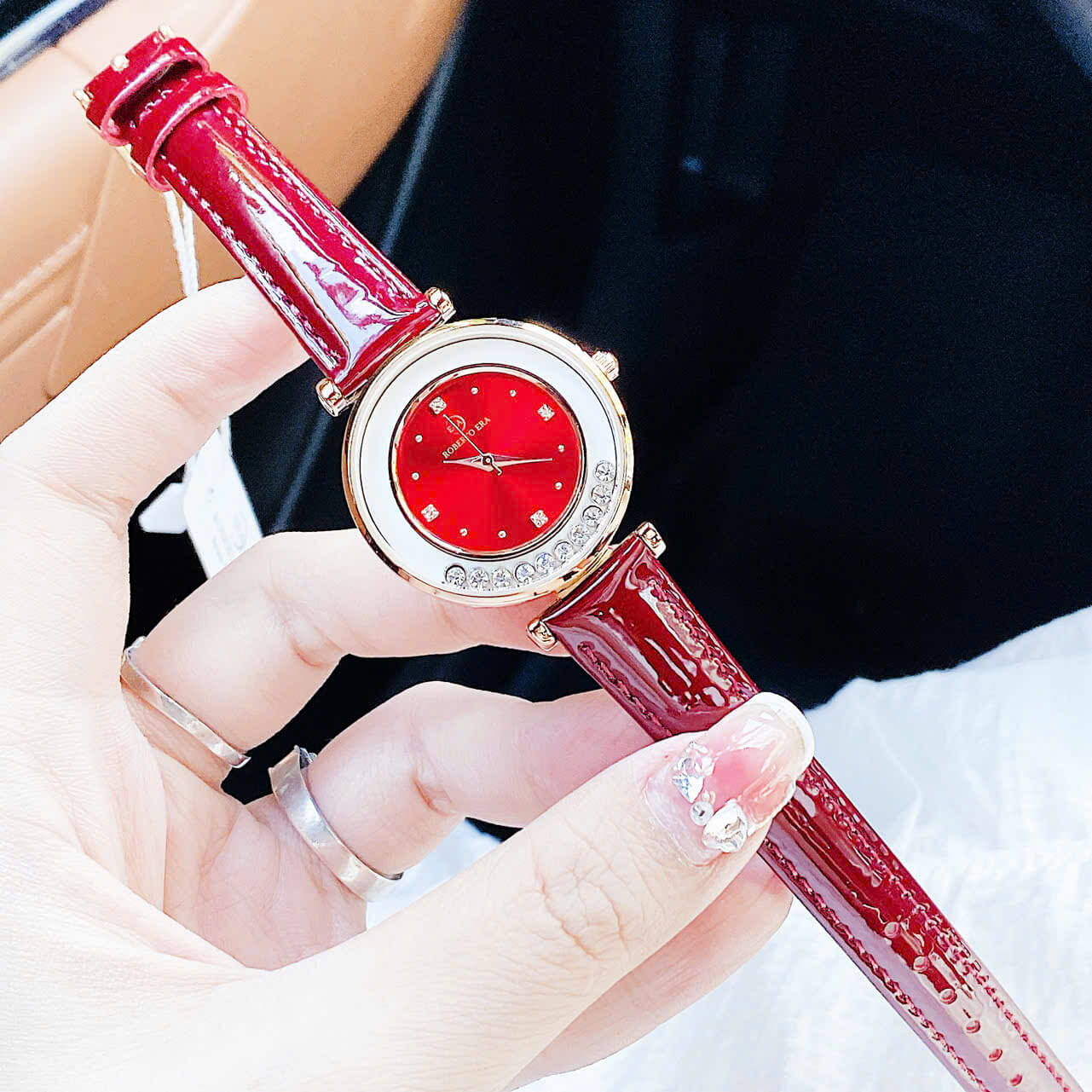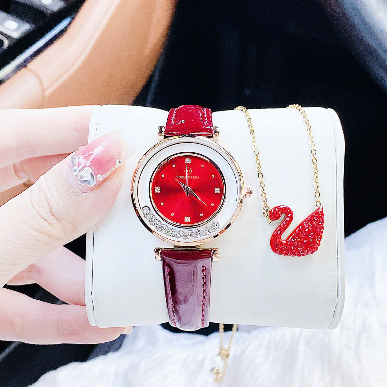 THÔNG TIN SẢN PHẨM: Đồng Hồ Nữ Roberto Era Mặt Đỏ Viền Đá Chạy Dây Da Đỏ Kim Loại Vàng Hồng Máy Pin Size 32mm