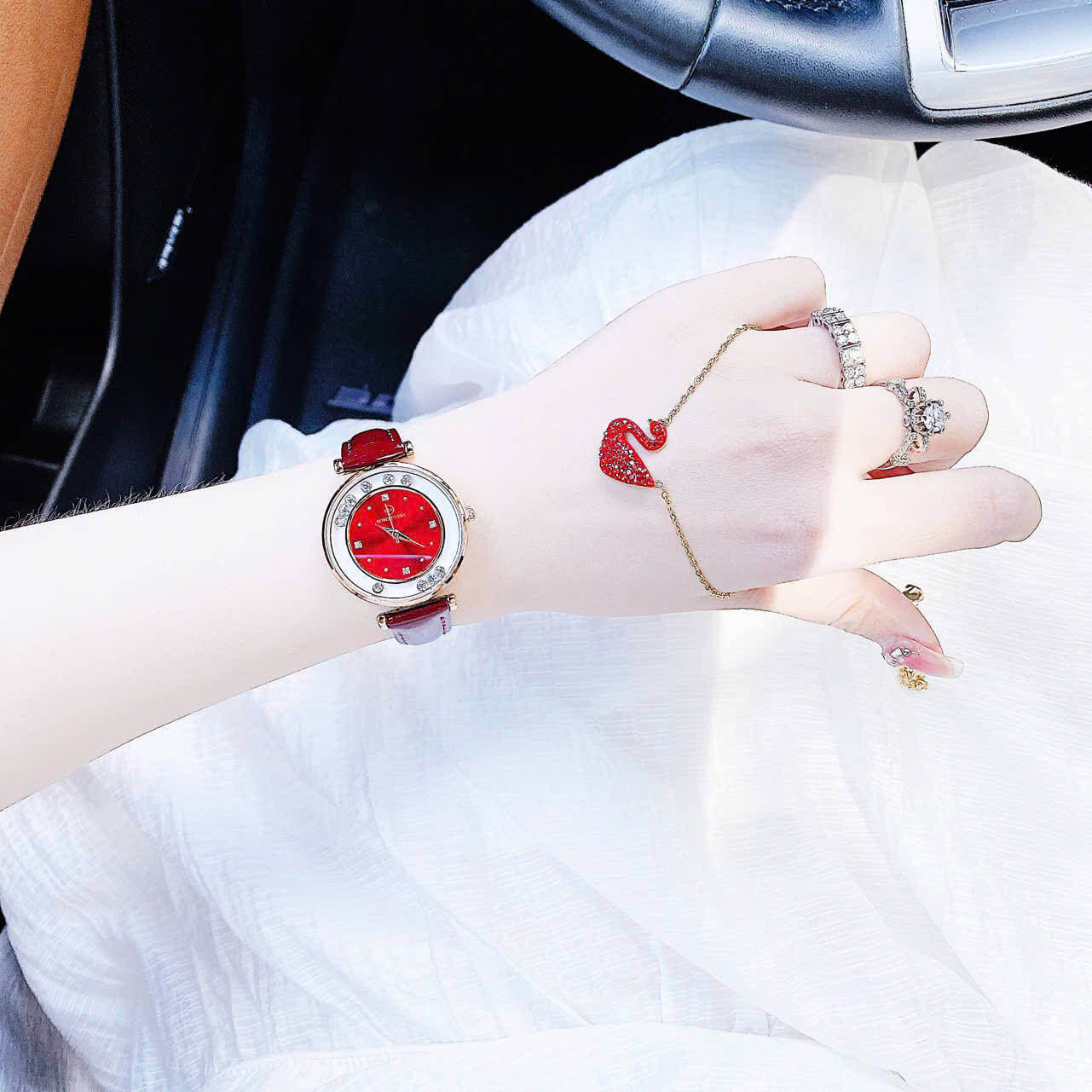 Với thiết kế vỏ tròn size 32mm, phù hợp với mọi cỡ cổ tay nữ, mặt đỏ bên trong đính 4 viên đá các vị trí cọc giờ chính, bên ngoài là viền đá chạy di động với 10 viên đá khối trắng tròn sáng lấp lánh, di chuyển theo chuyển động của cổ tay.