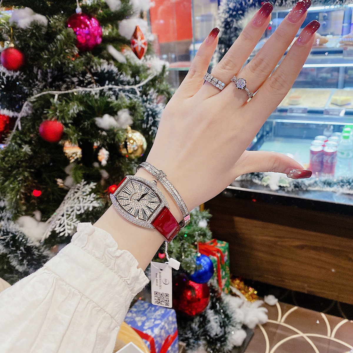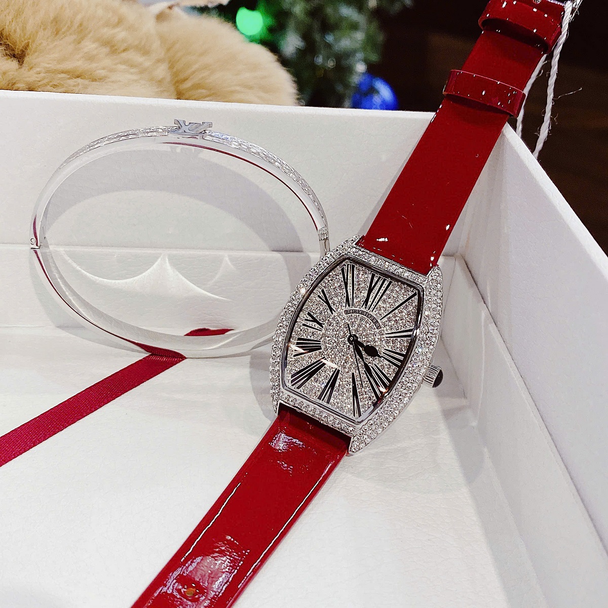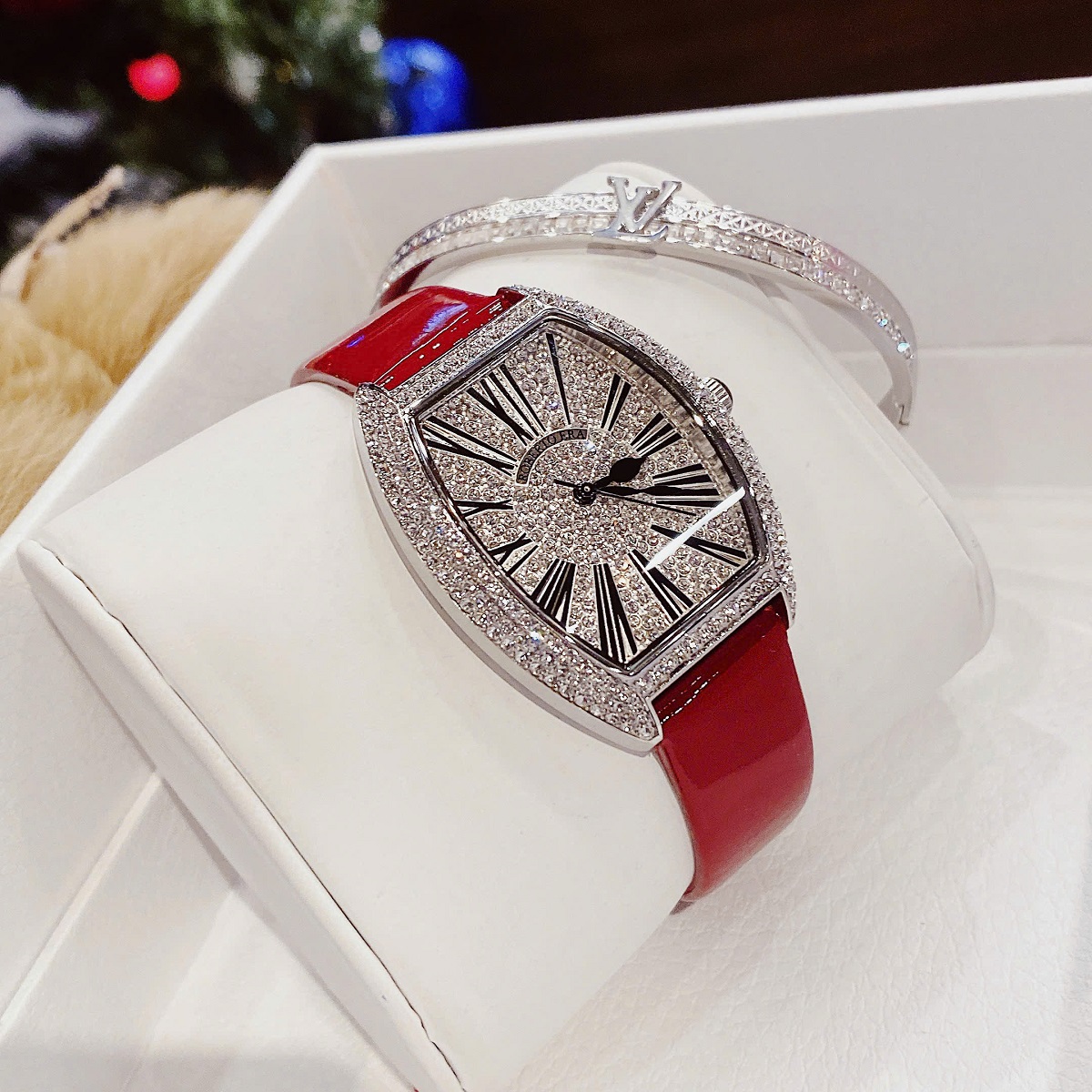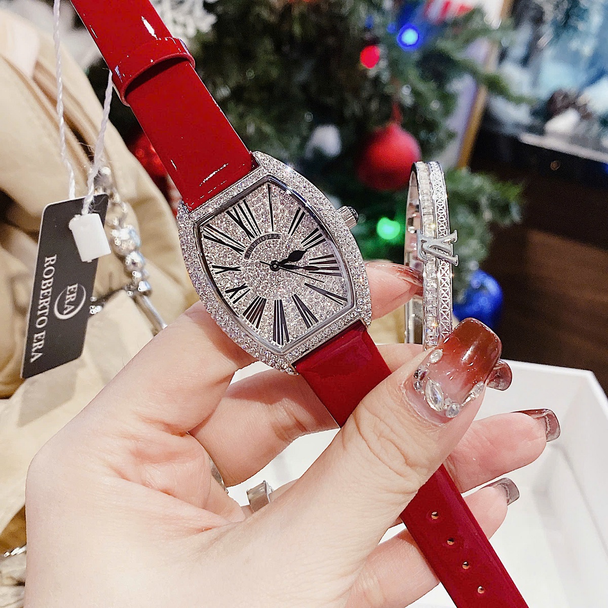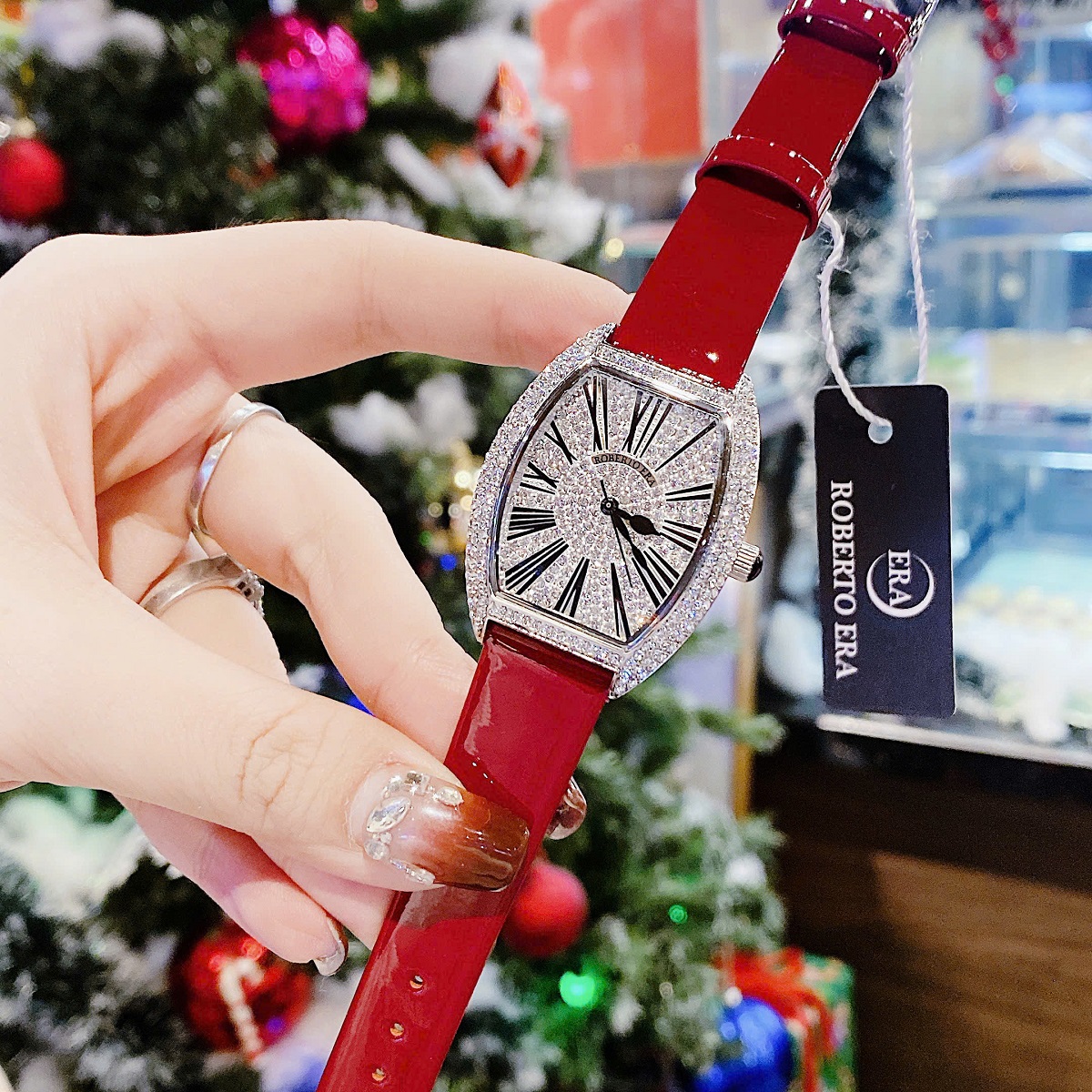 THÔNG TIN SẢN PHẨM: Đồng Hồ Nữ Roberto Era Mặt Ovan Đính Full Đá Vạch La Mã Dây Da Đỏ Kim Loại Silver Size 36mm