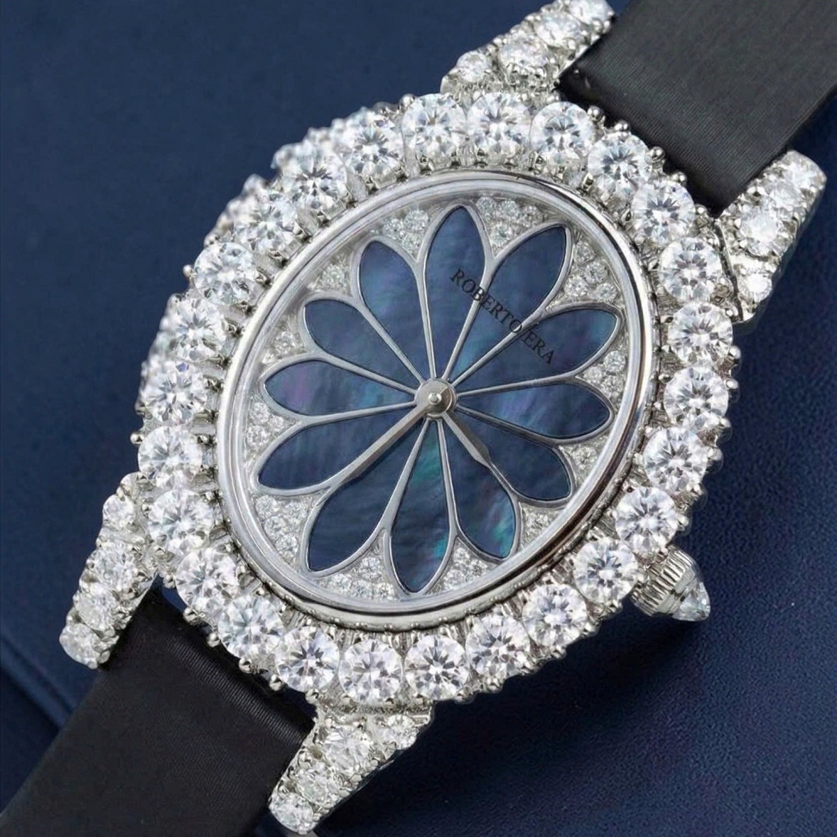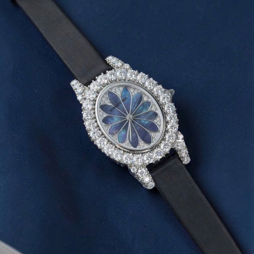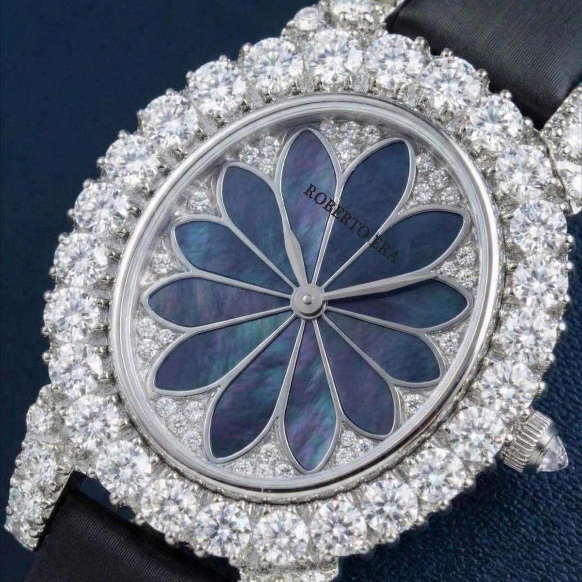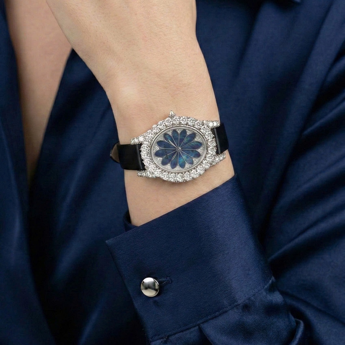 Với thiết kế mặt ovan size 32mm, đính full đá lớn, bên trong mặt là hình dáng 1 bông hoa 12 cánh tương xứng với 12 cọc số giờ, được cẩn xà cừ đen lấp lánh với logo thương hiệu chính giữa 12h.