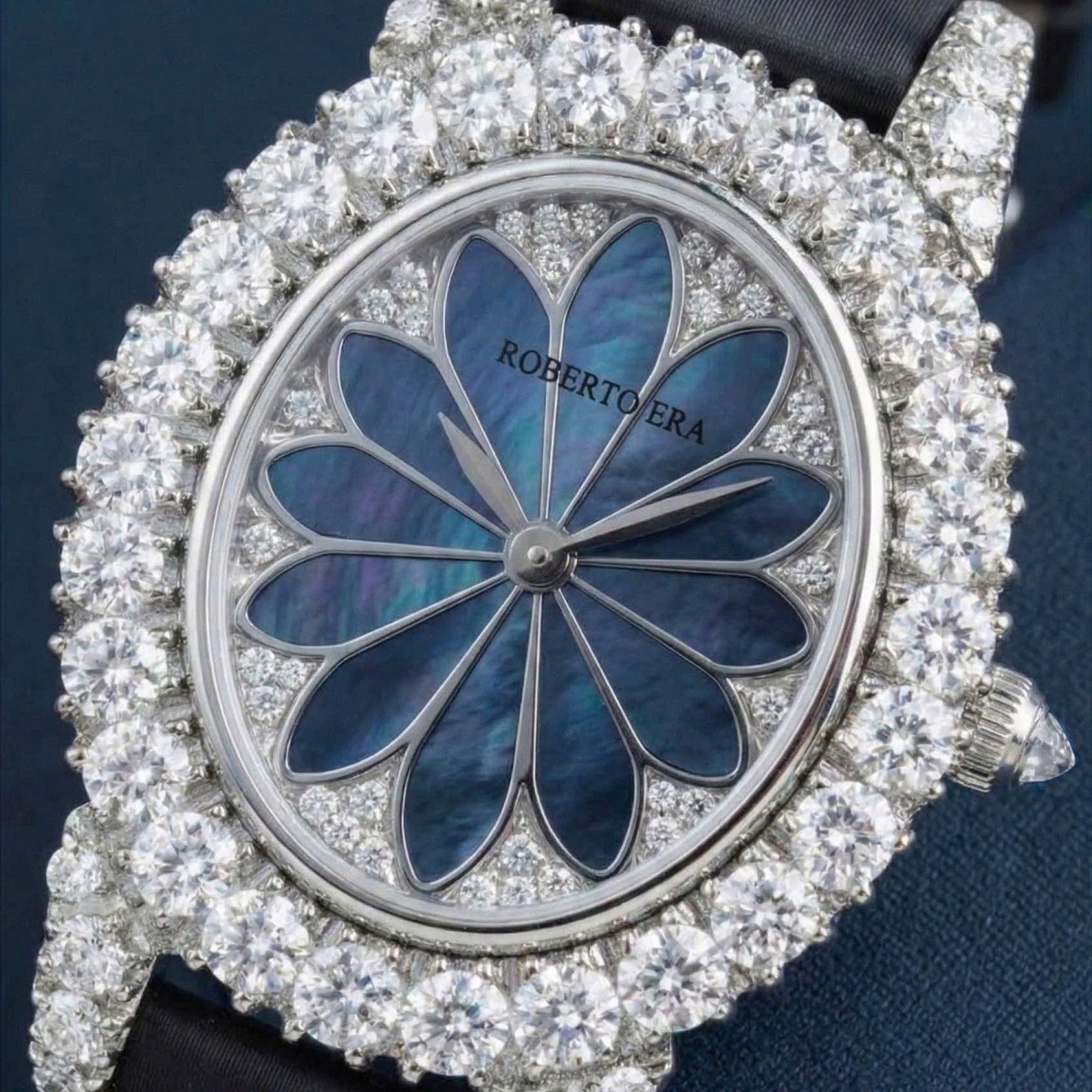 THÔNG TIN SẢN PHẨM: Đồng Hồ Nữ Roberto Era RE2200 Mặt Ovan Bông Hoa Đen Xà Cừ Đính Đá Dây Da Đen Silver Size 32mm