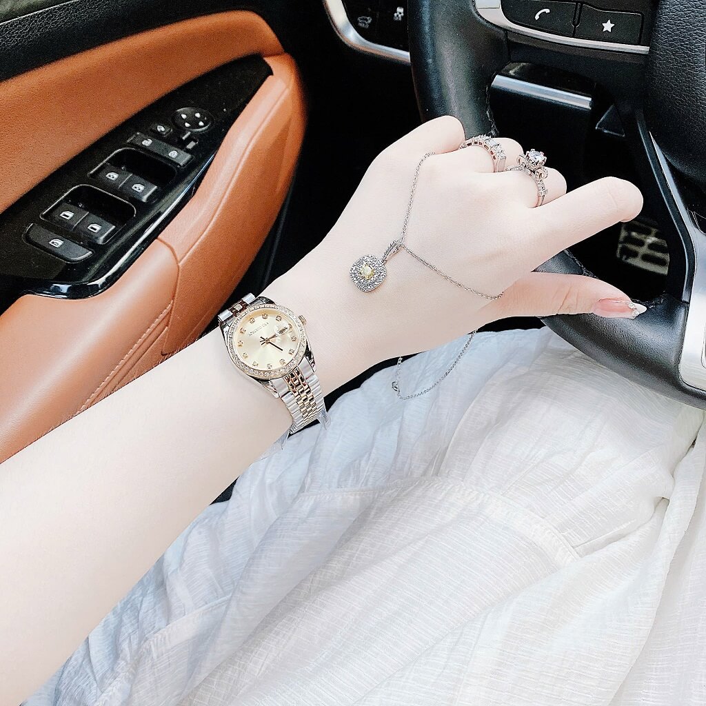 Mặt đồng hồ tròn kích thước 31mm, vừa vặn với cổ tay nữ, tôn lên nét mềm mại và thanh thoát.