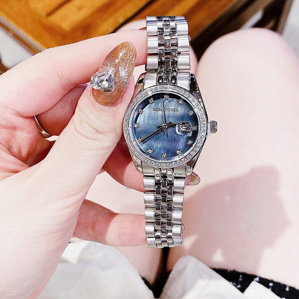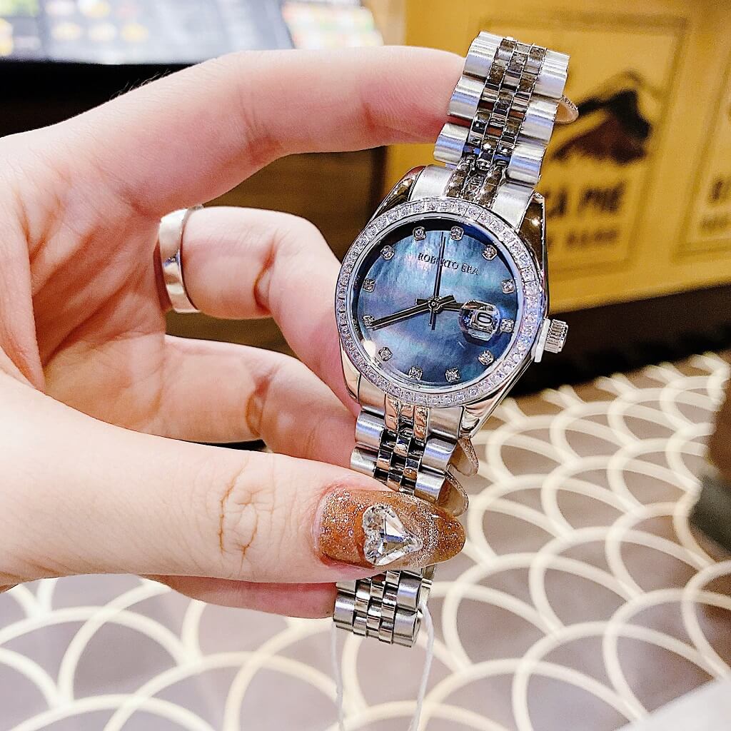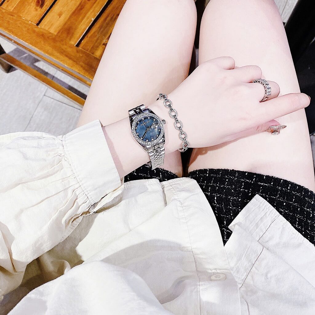 Điểm nhấn nổi bật chính là viền mặt đính đá sang trọng, lấp lánh dưới ánh sáng, giúp chủ nhân thêm phần nổi bật trong mọi sự kiện – từ công sở đến tiệc tối.