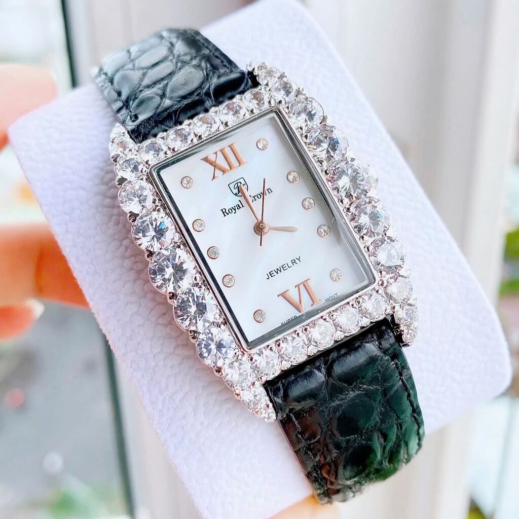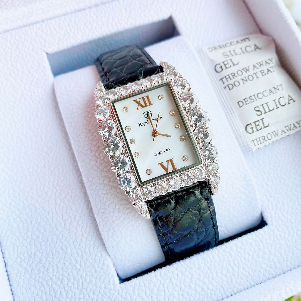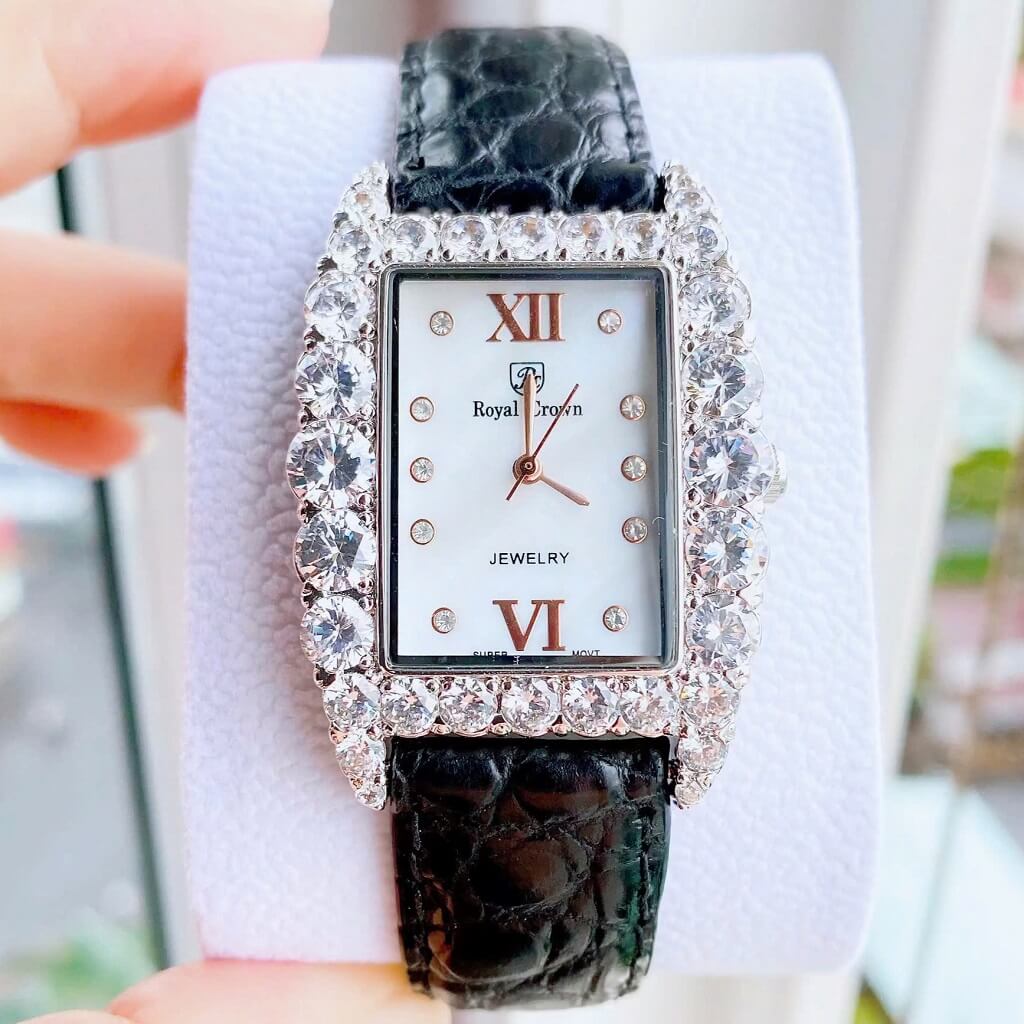 Đồng Hồ Nữ Royal Crown 6111 Dây Da Đen Đính Đá Size 34mm