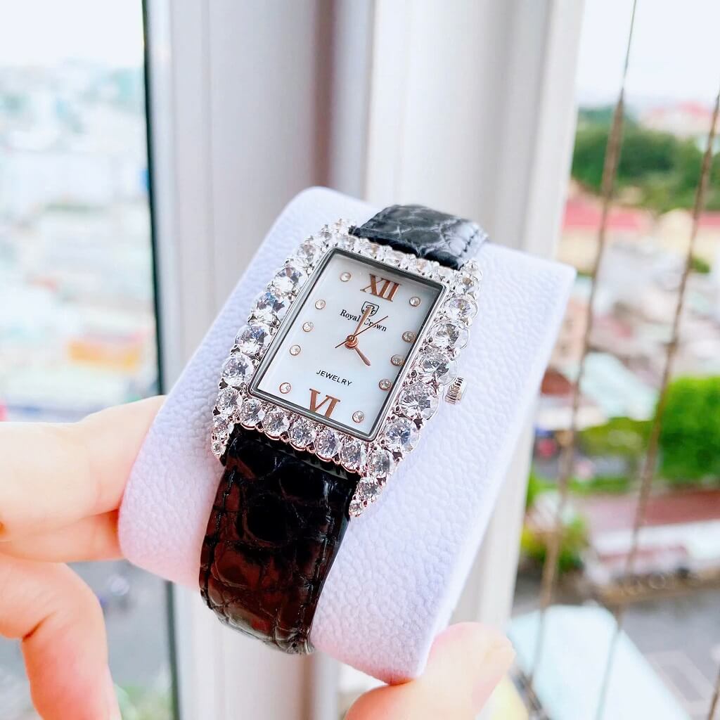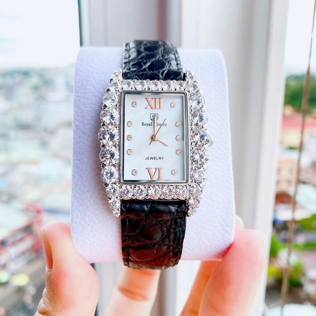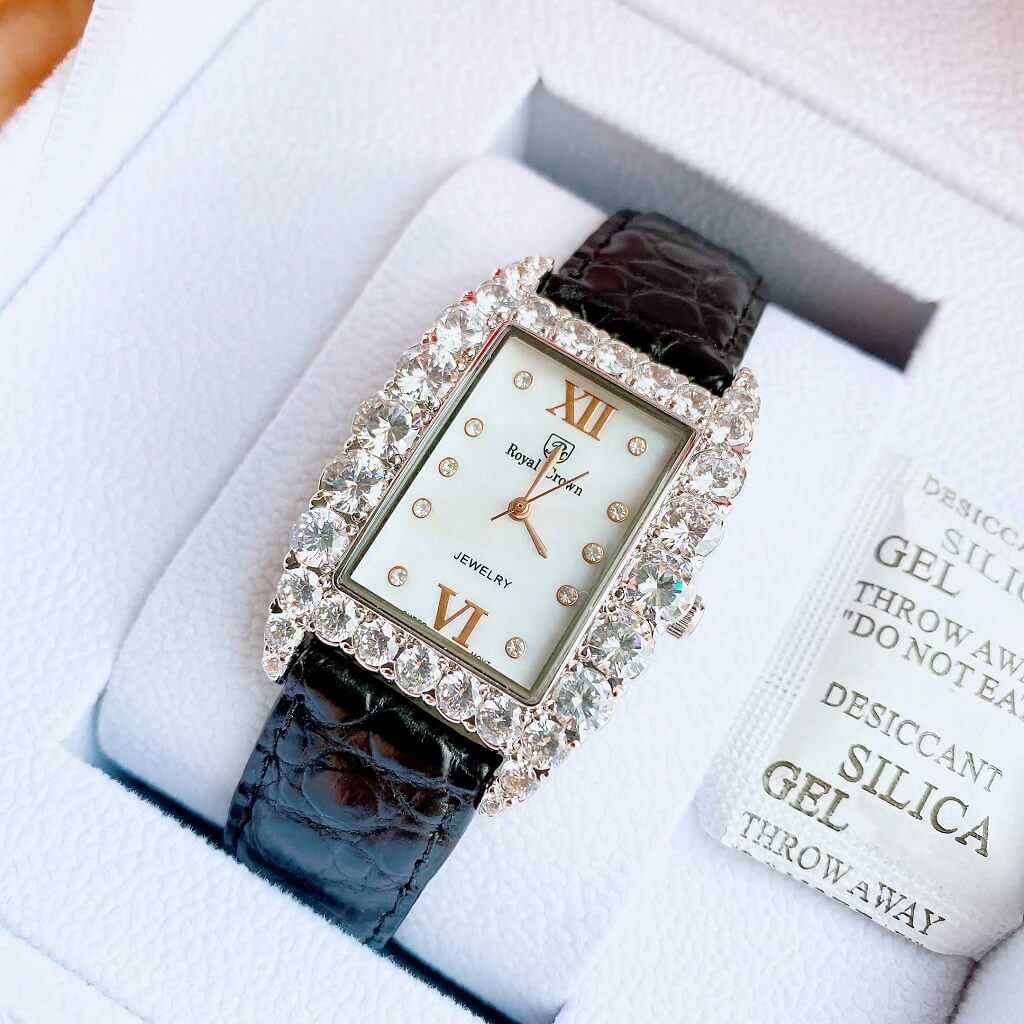 Đồng Hồ Nữ Royal Crown 6111 Dây Da Đen Đính Đá Size 34mm