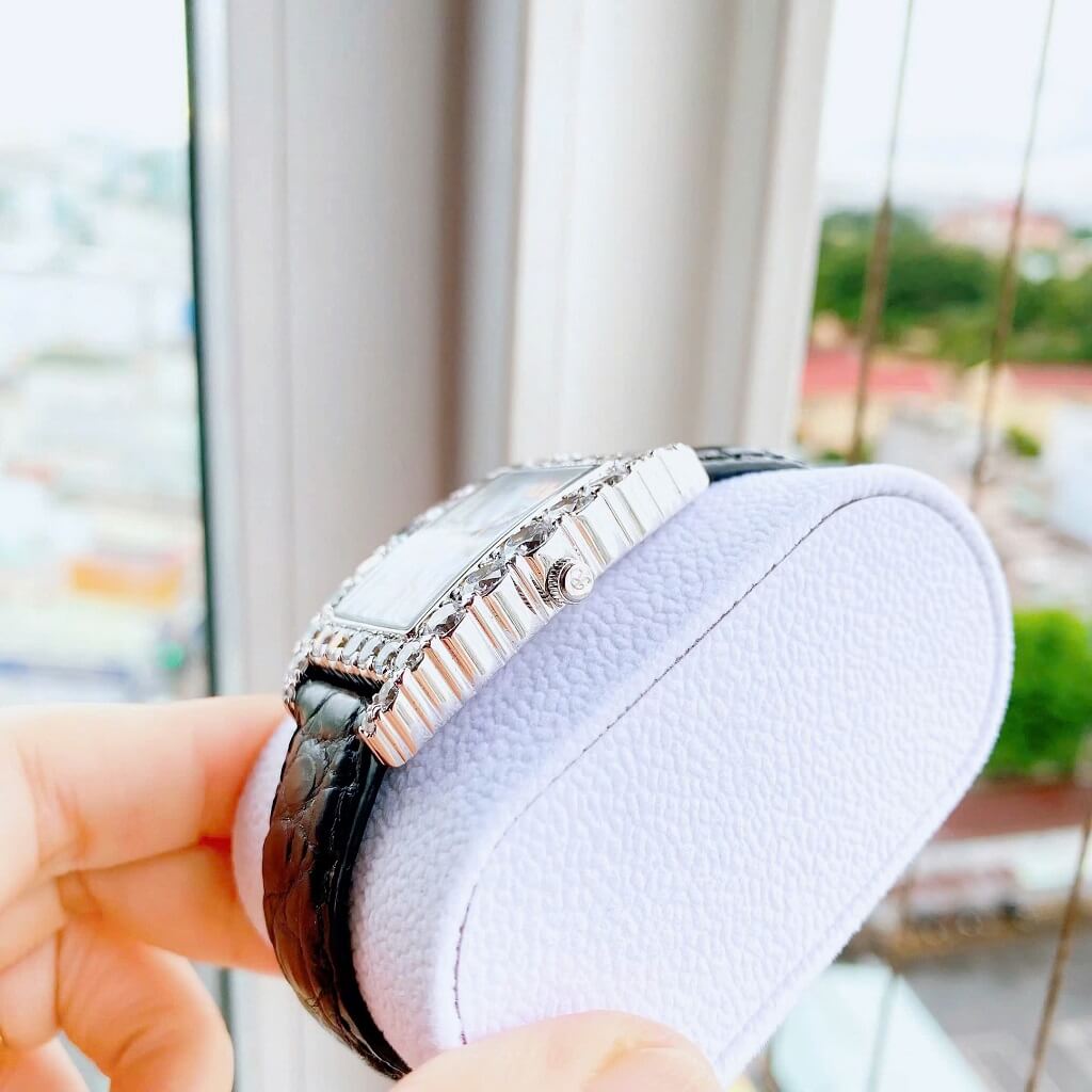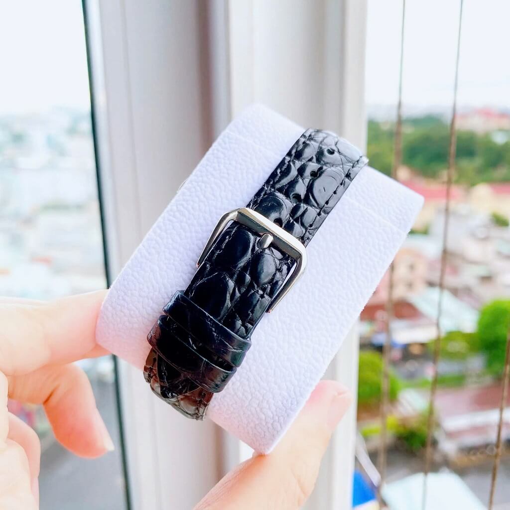Chiếc đồng hồ sở hữu thiết kế mặt chữ nhật tương đương 34mm cân đối, phối dây da đen cổ điển kết hợp niềng đính đá lấp lánh – tạo nên vẻ ngoài nổi bật, vừa hiện đại vừa đầy cuốn hút cho phái đẹp.