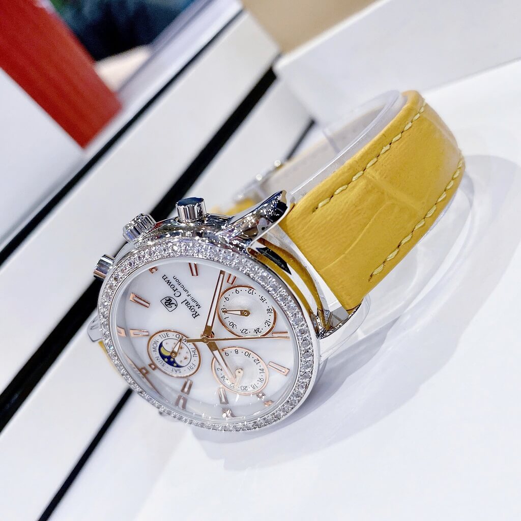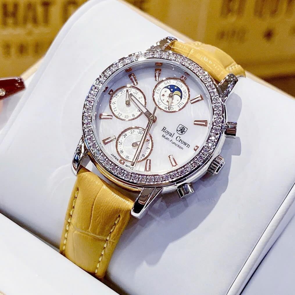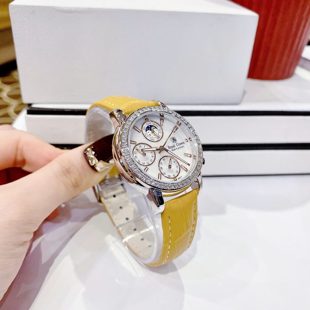 Thông số chi tiết sản phẩm: Đồng Hồ Nữ Royal Crown 6420 Dây Da Vàng Vỏ Màu Silver Size 35mm Chính Hãng