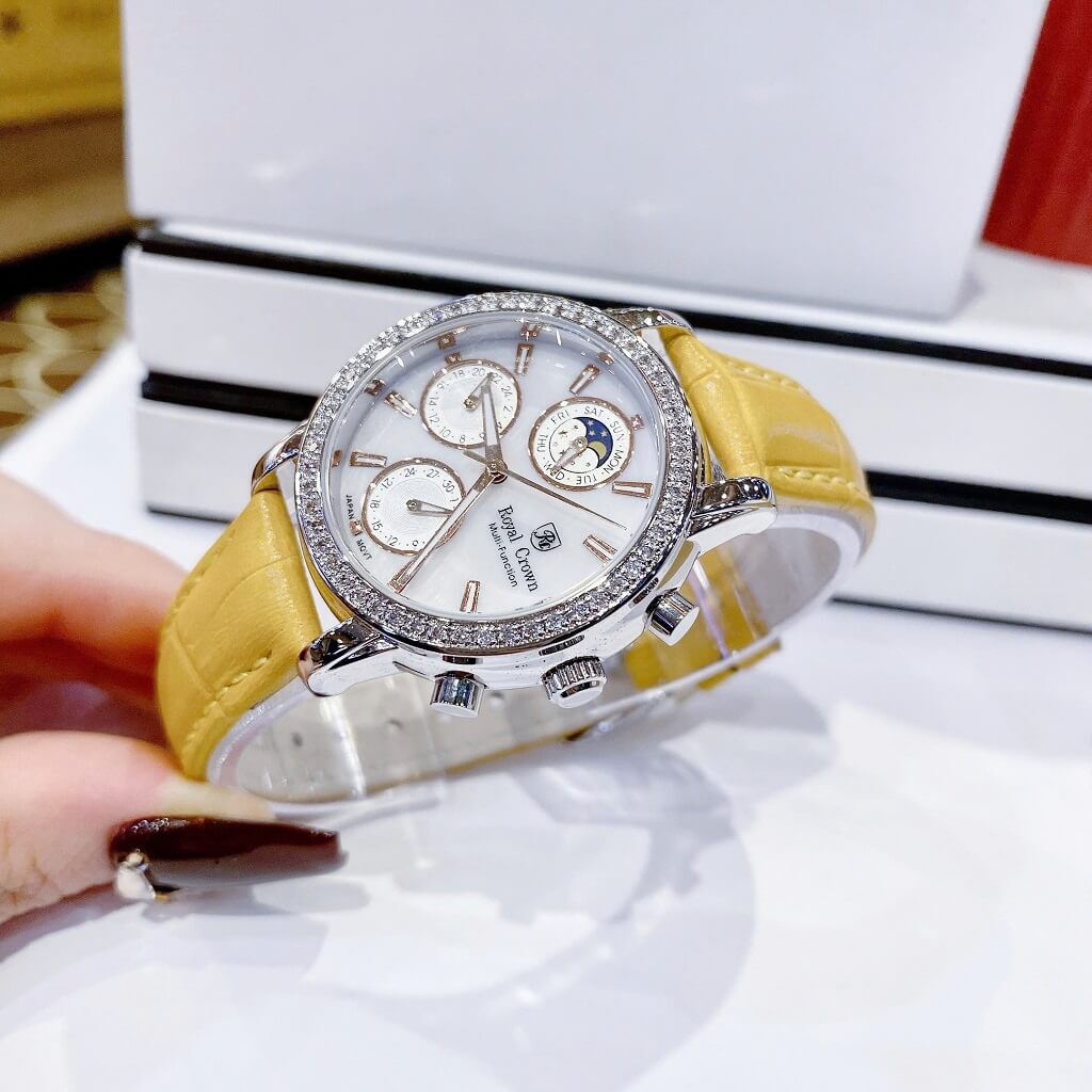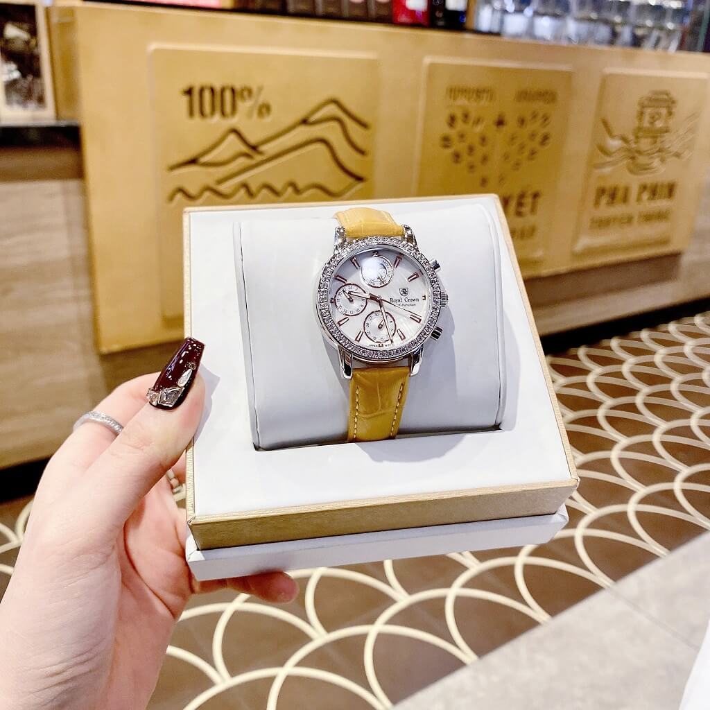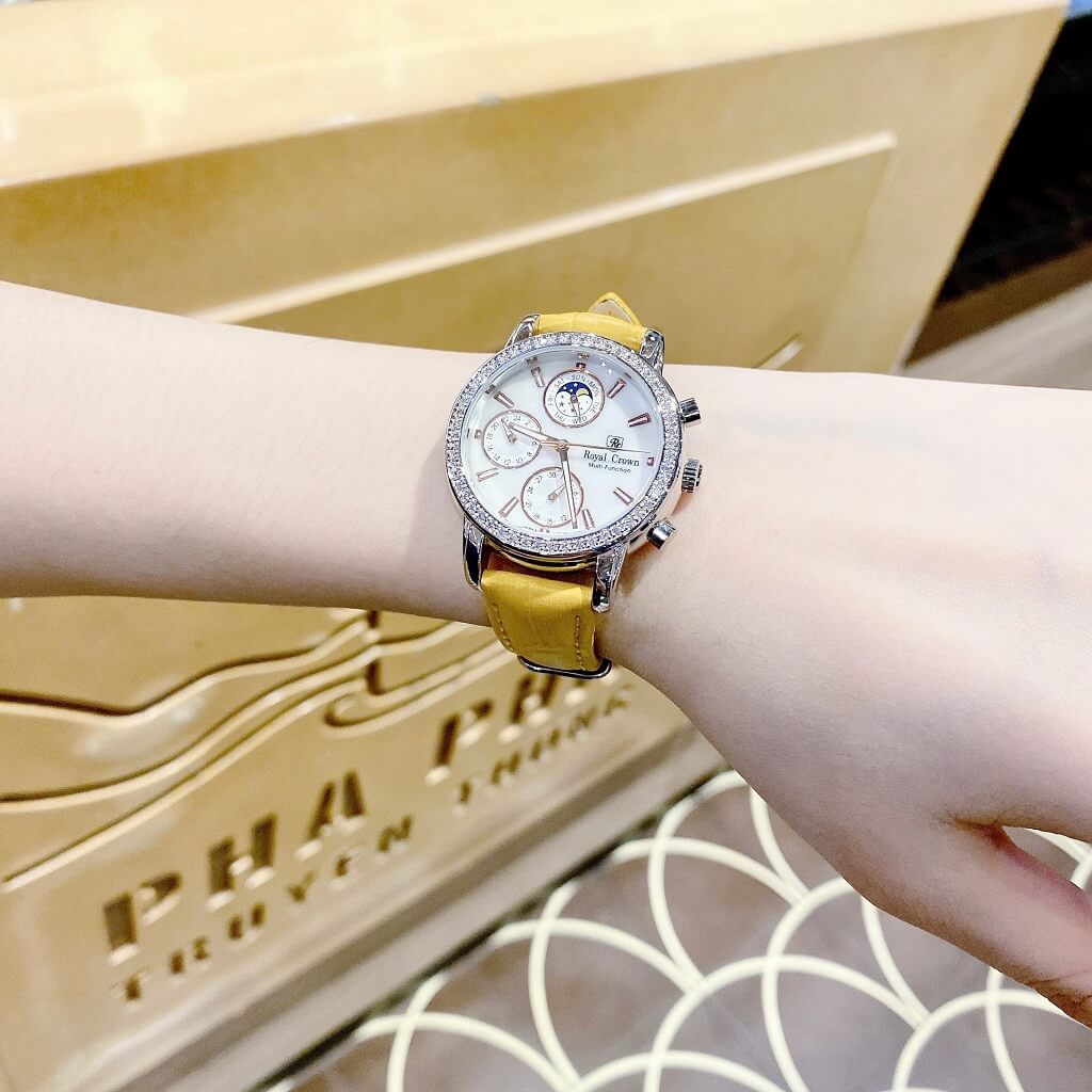 Thông số chi tiết sản phẩm: Đồng Hồ Nữ Royal Crown 6420 Dây Da Vàng Vỏ Màu Silver Size 35mm Chính Hãng