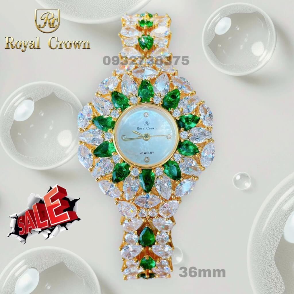 Đồng hồ Royal Crown đính đá xanh lá vỏ vàng là chiếc đồng hồ được thiết kế tinh xảo, kết hợp giữa vẻ đẹp sang trọng và sự thanh lịch. Thương hiệu Royal Crown nổi bật với các mẫu đồng hồ sử dụng đá quý hoặc đá nhân tạo như đá Swarovski để trang trí, tạo điểm nhấn lấp lánh cho sản phẩm.