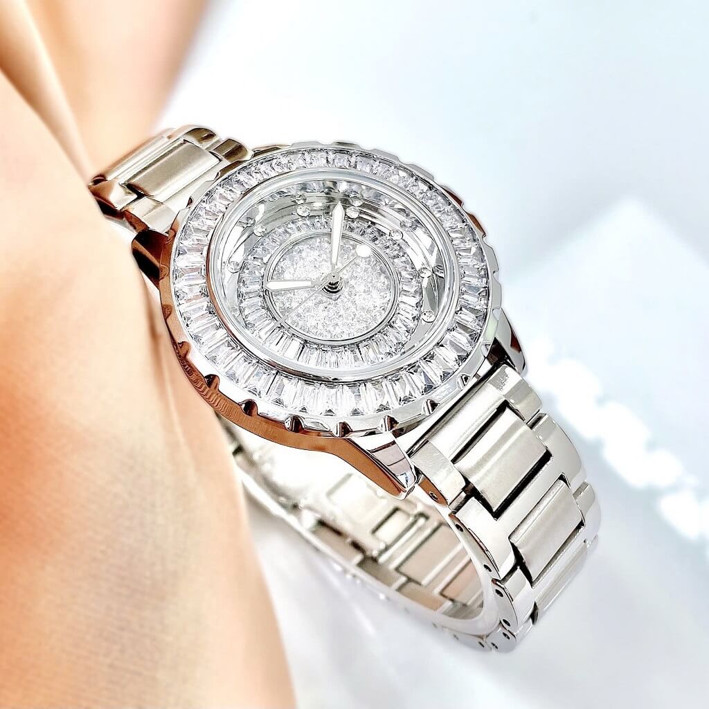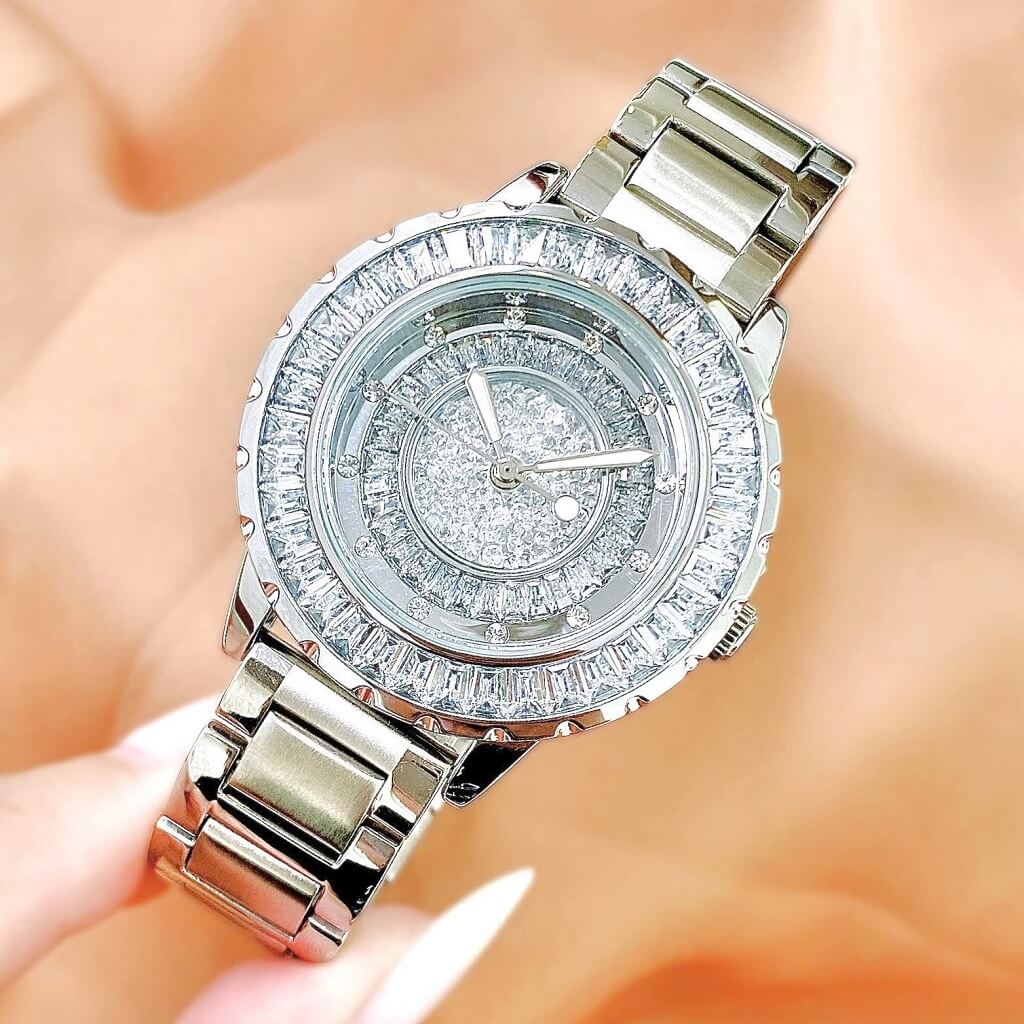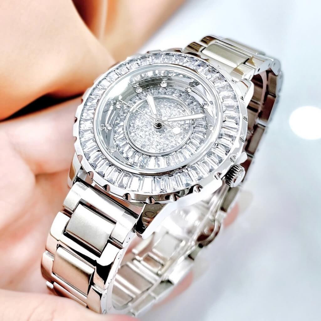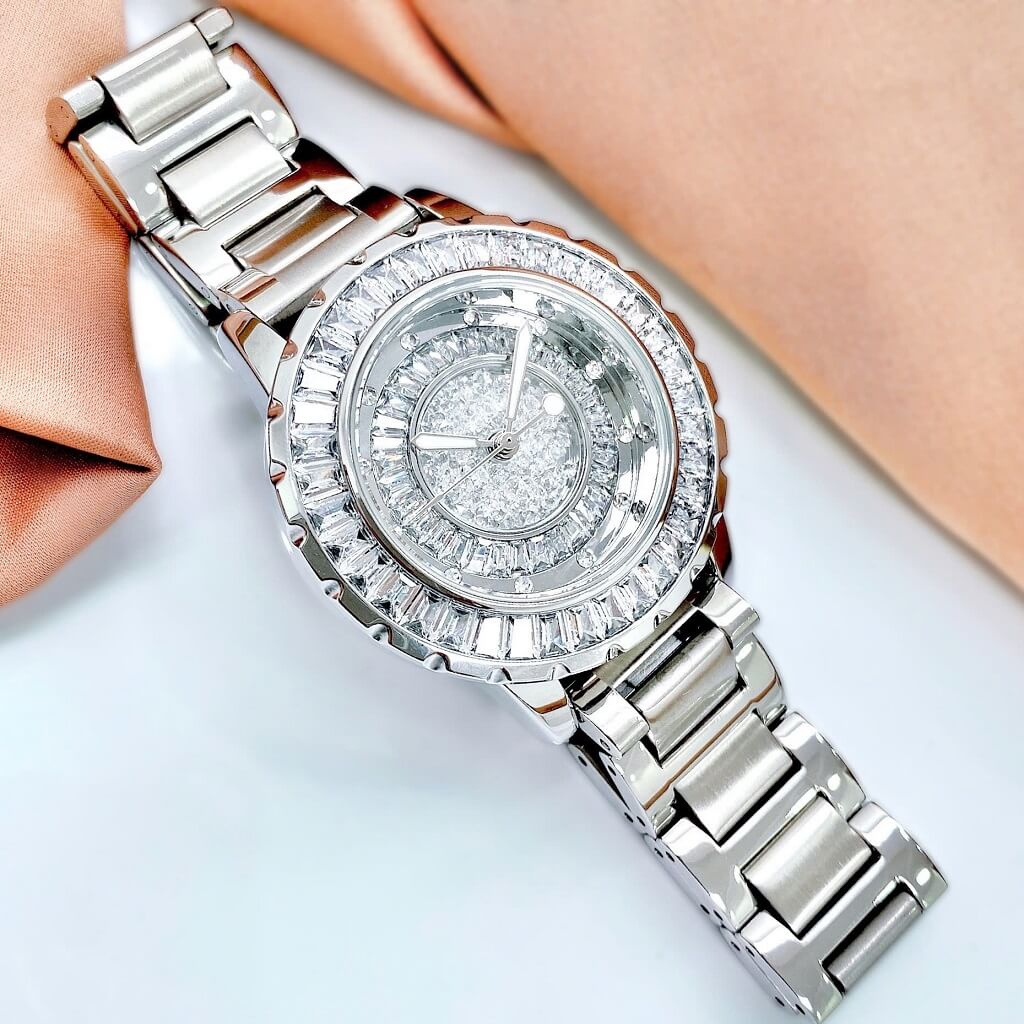 ✅ Thiết kế nổi bật: Mặt số đính đá tinh xảo, phối cùng dây kim loại bạc sang trọng – thu hút ánh nhìn từ mọi góc độ.