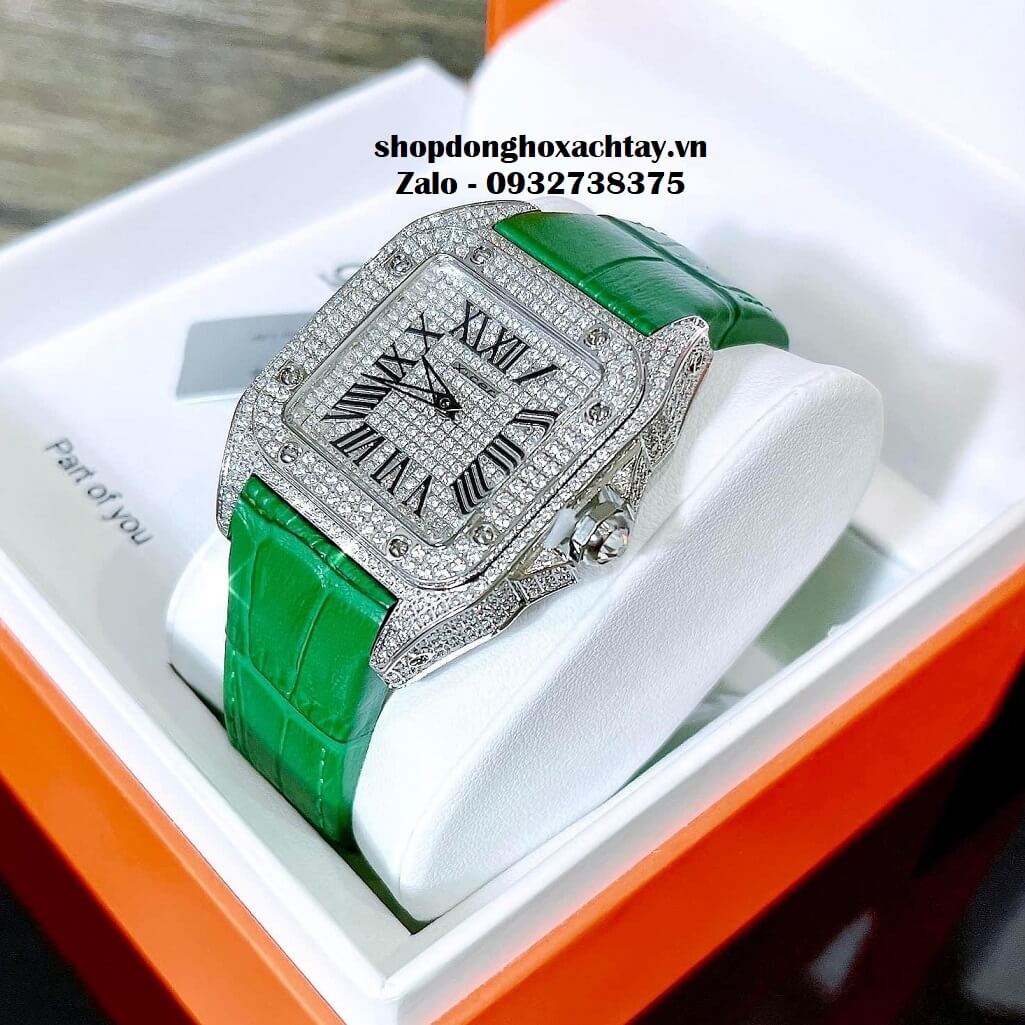 Vỏ thép ko gỉ mặt full đá silver dây xanh nổi bật