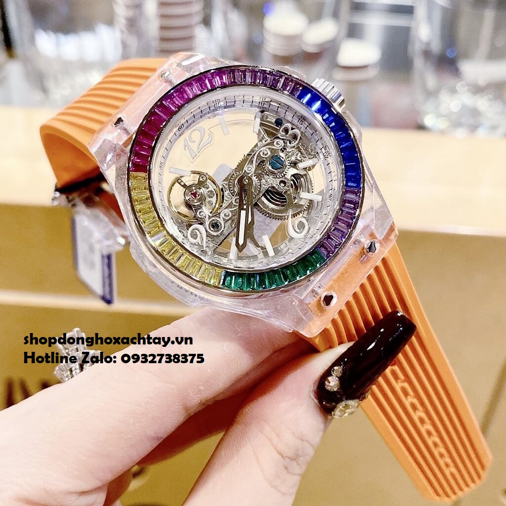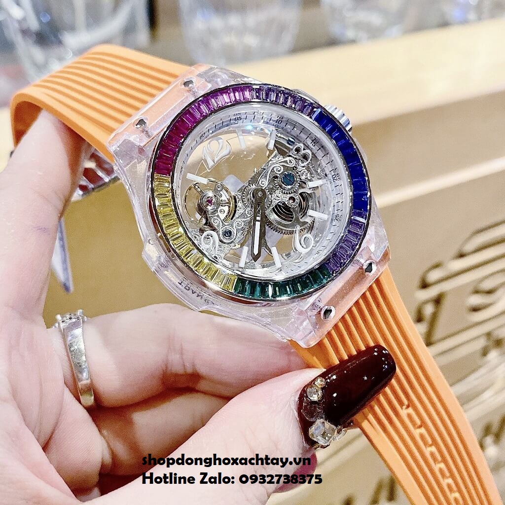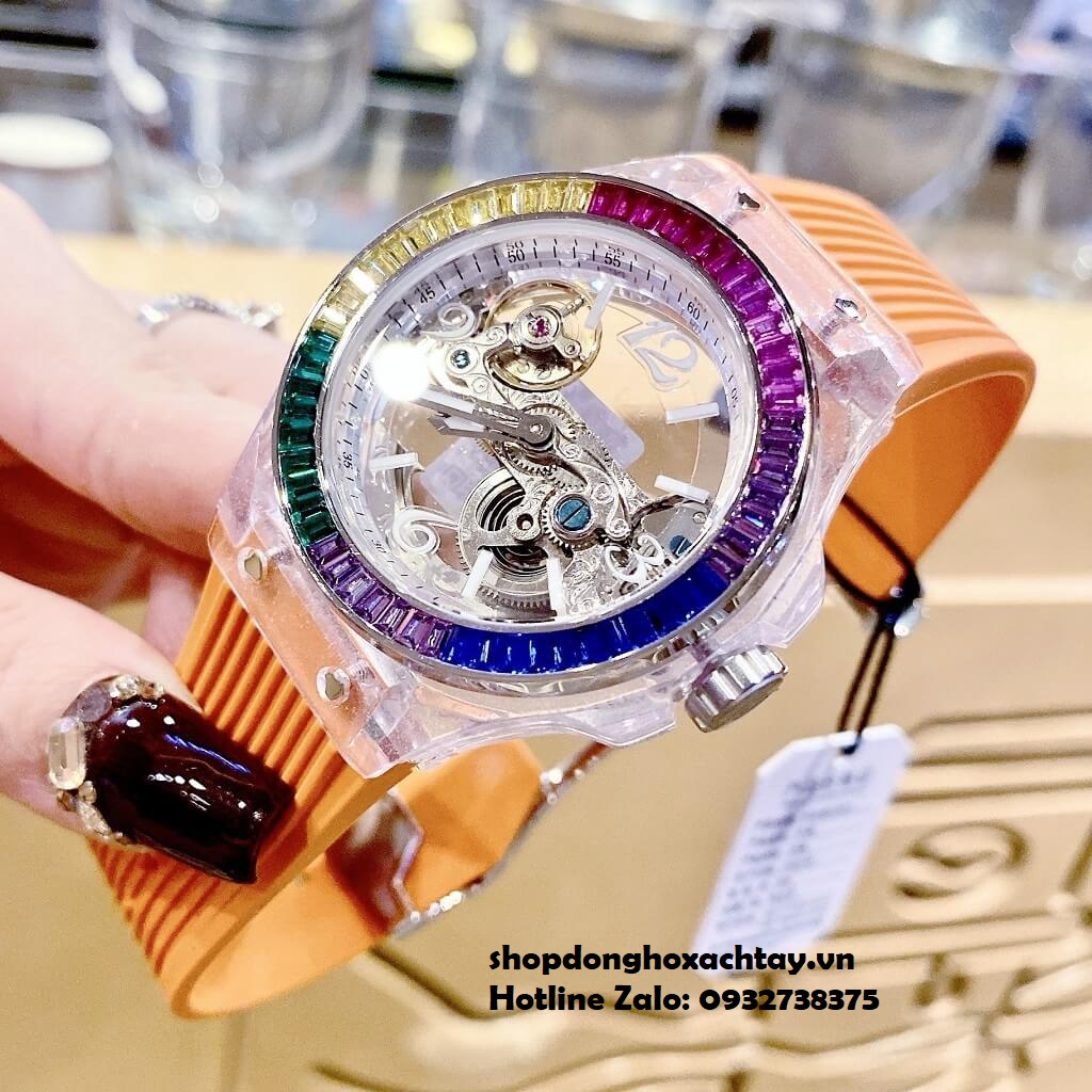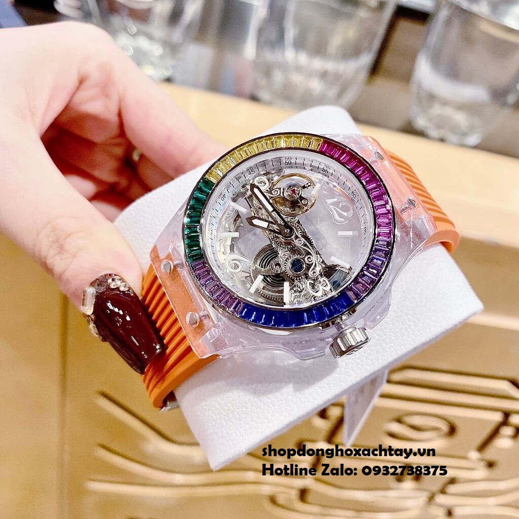 - Thiết kế kiểu dáng Hub.lot với viền đá 7 sắc cầu vồng rực rỡ, có thể xoay được