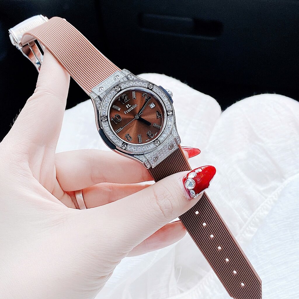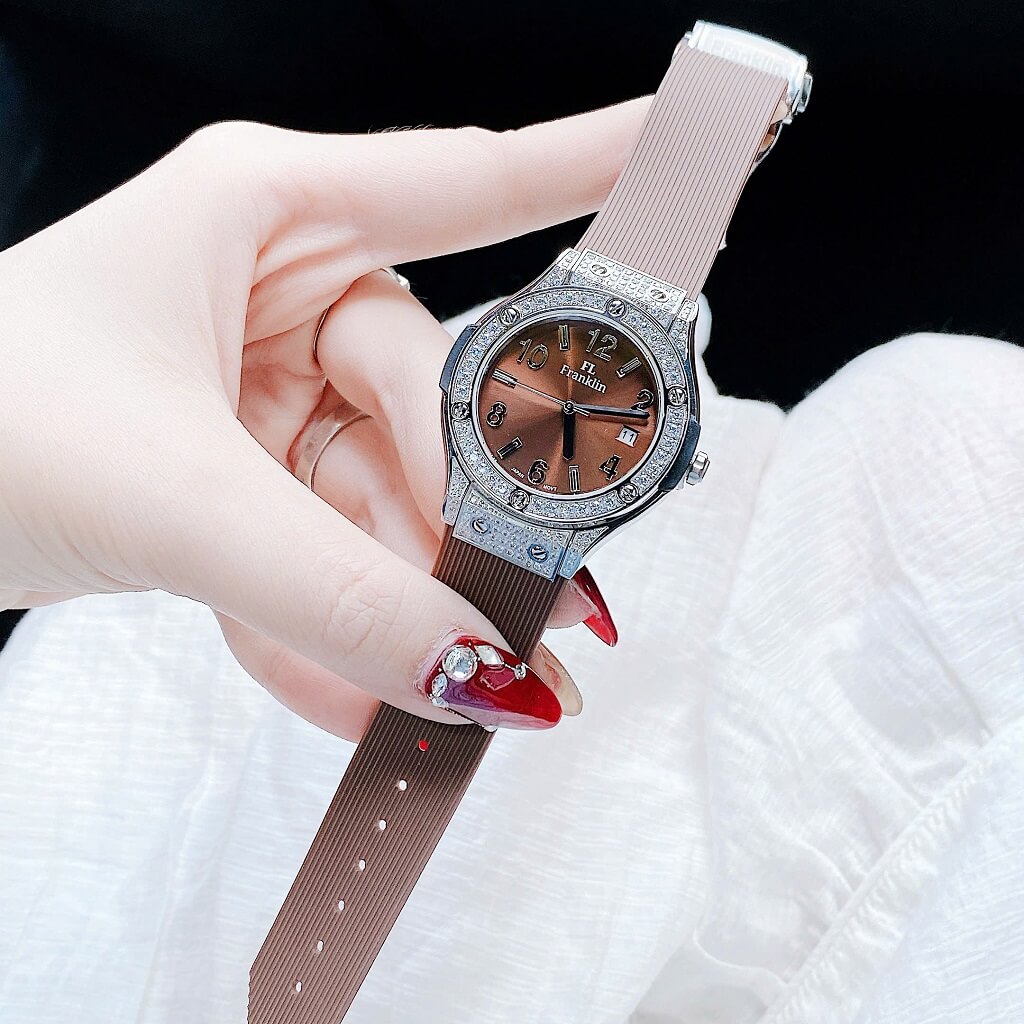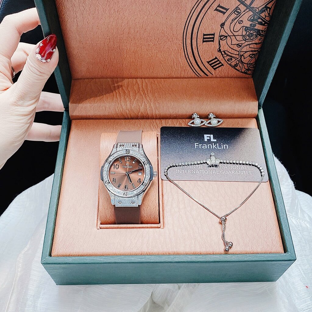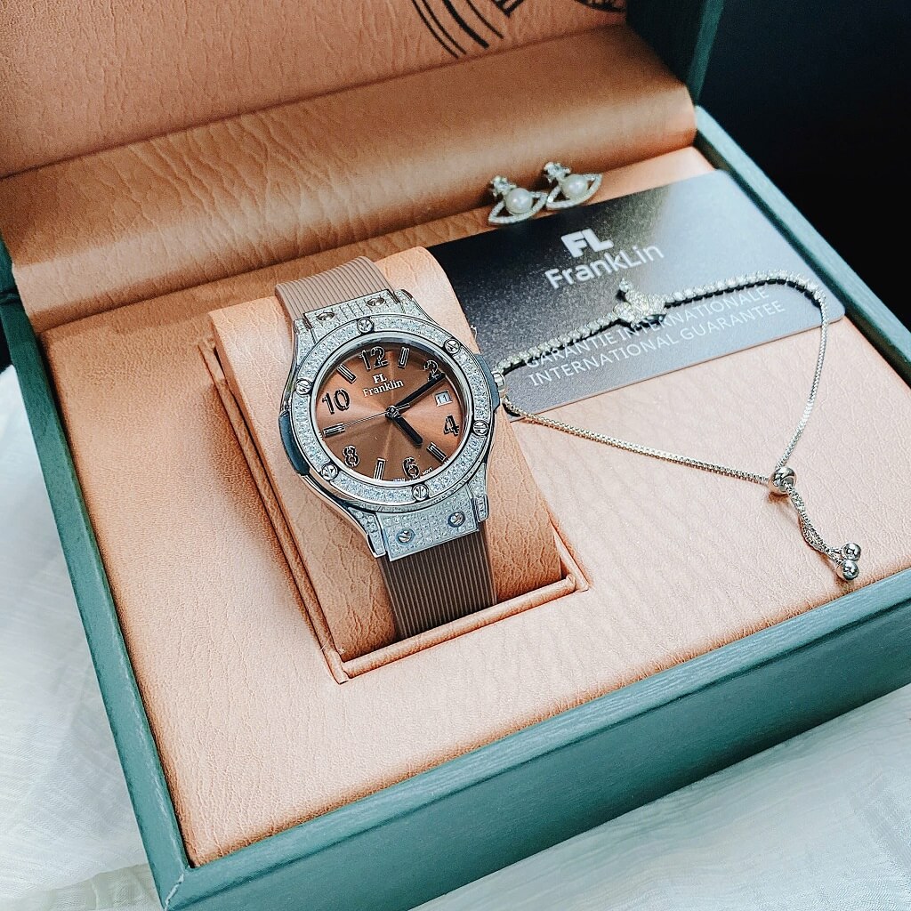 Thông số chi tiết sản phẩm: Set Đồng Hồ Nữ Franklin Dây Cao Su Nâu Vỏ Silver Đính Đá Size 35mm Chính Hãng
