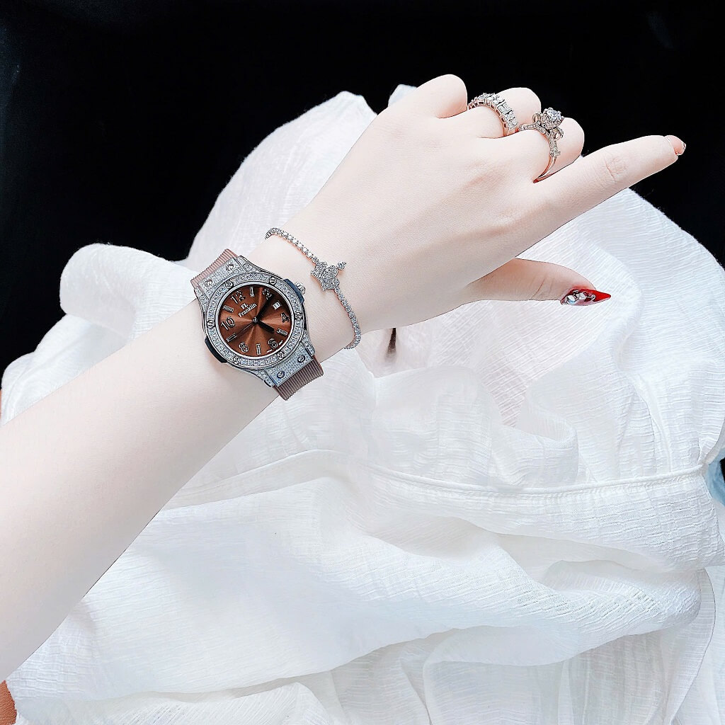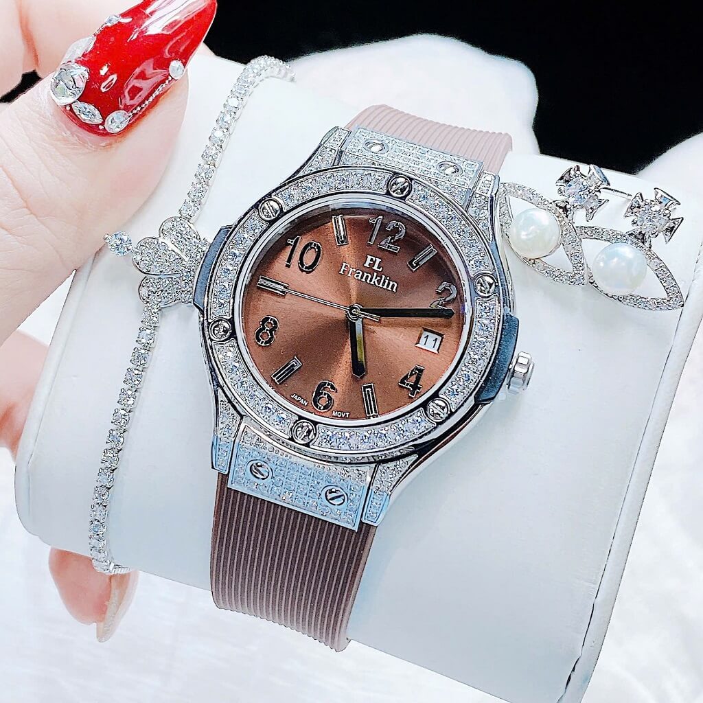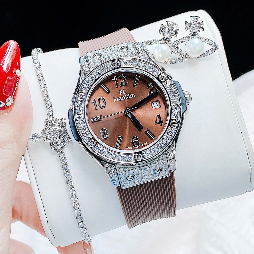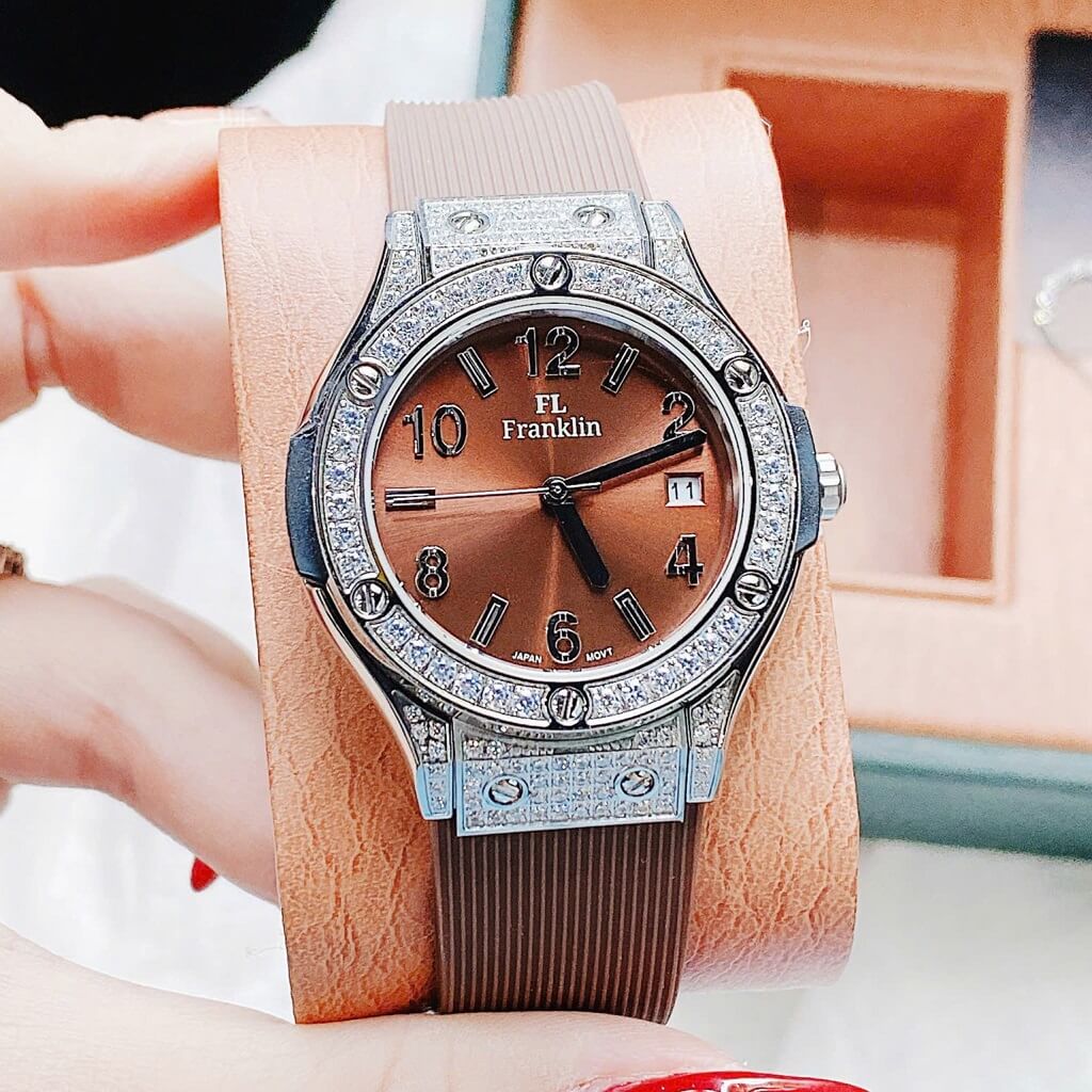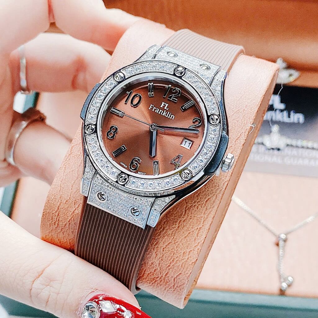Thông số chi tiết sản phẩm: Set Đồng Hồ Nữ Franklin Dây Cao Su Nâu Vỏ Silver Đính Đá Size 35mm Chính Hãng