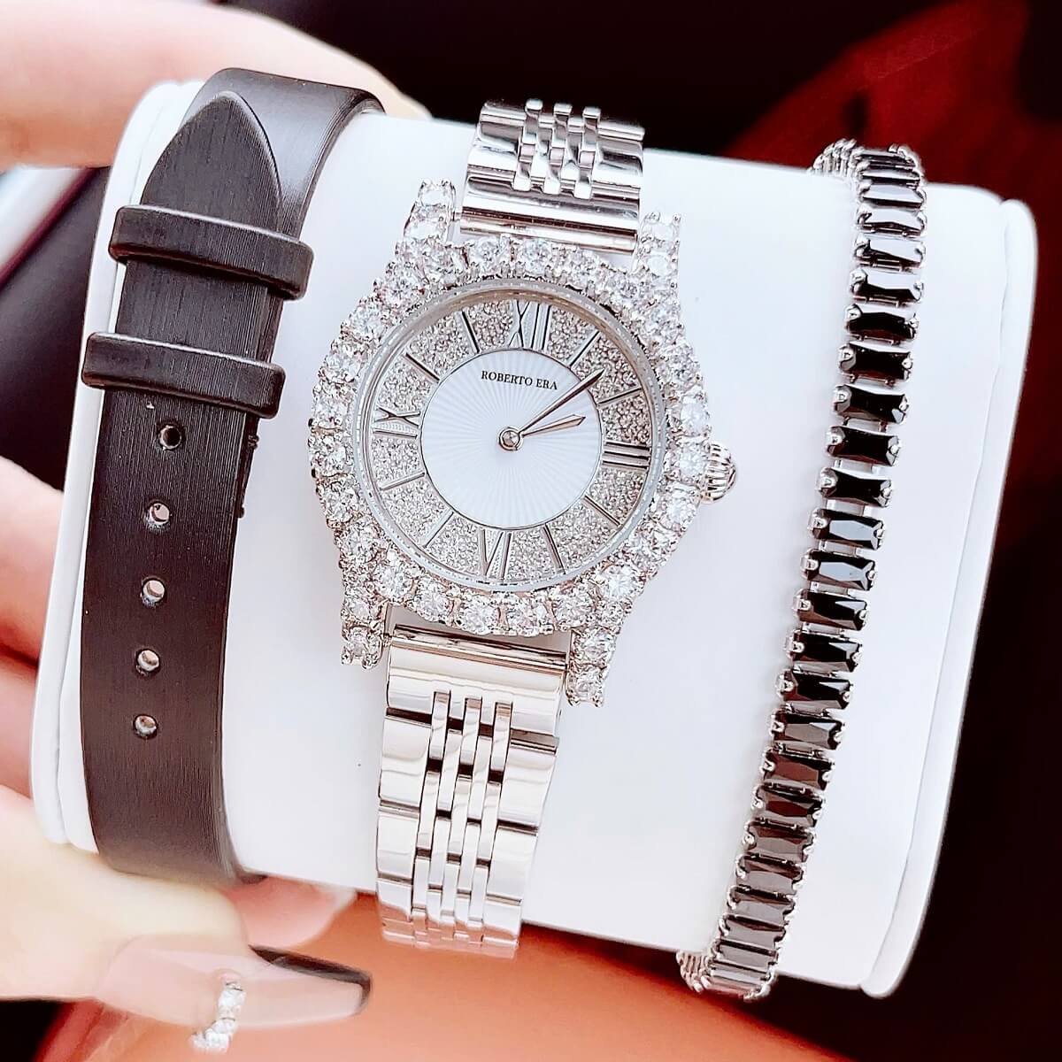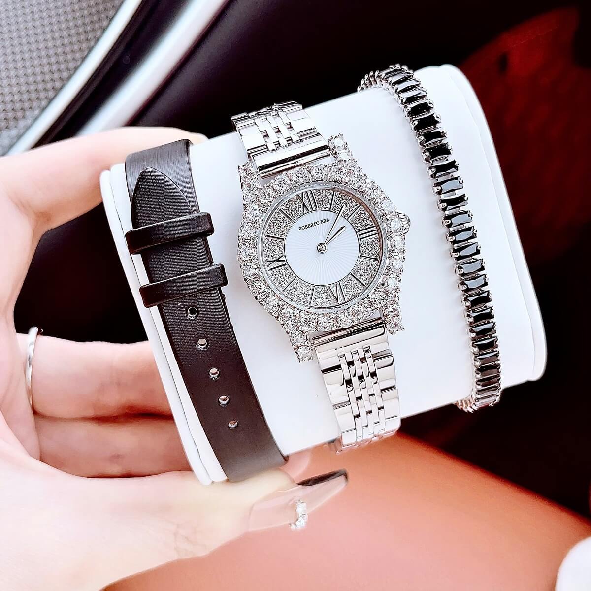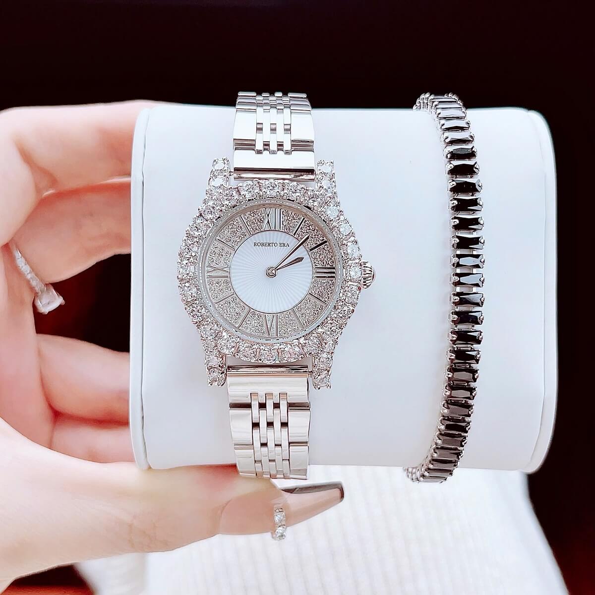 Thông số chi tiết sản phẩm: Set Đồng Hồ Nữ Roberto Era Dây Da Đen Vỏ Silver Size 31mm Chính Hãng