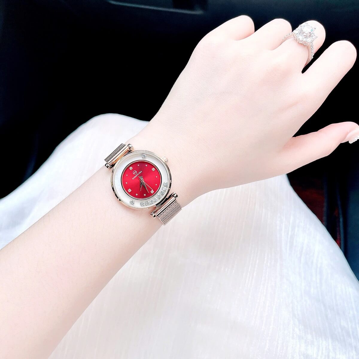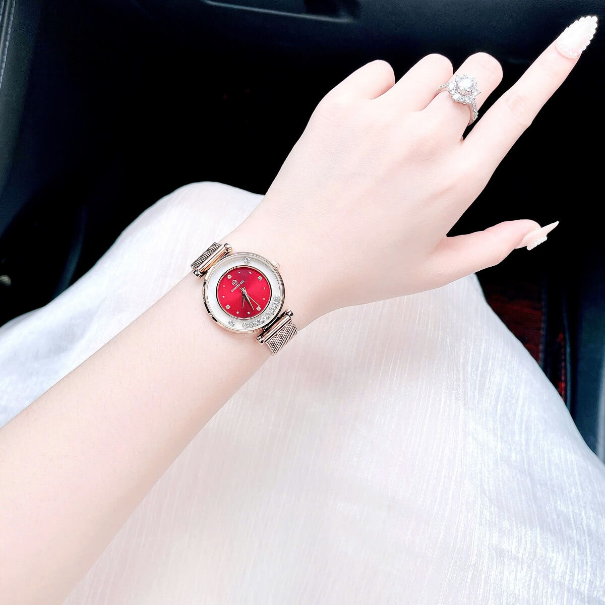 Dây da đỏ: Dây đeo được làm từ chất liệu da cao cấp, mềm mại và bền bỉ, mang đến sự thoải mái khi đeo, đồng thời tạo điểm nhấn nổi bật với màu đỏ thời thượng.