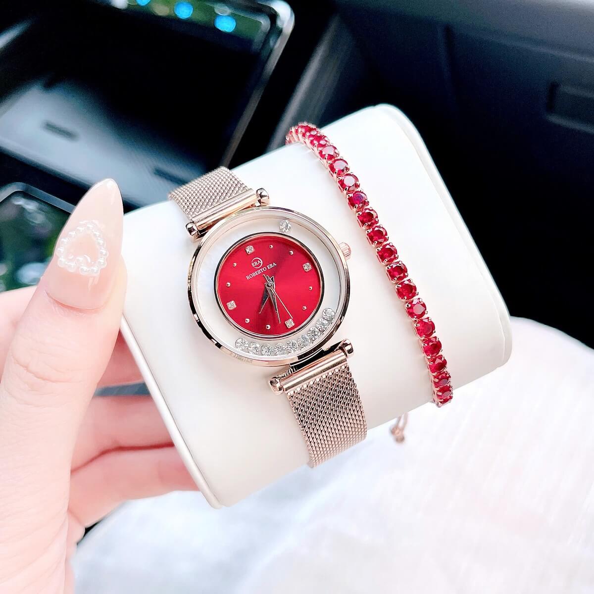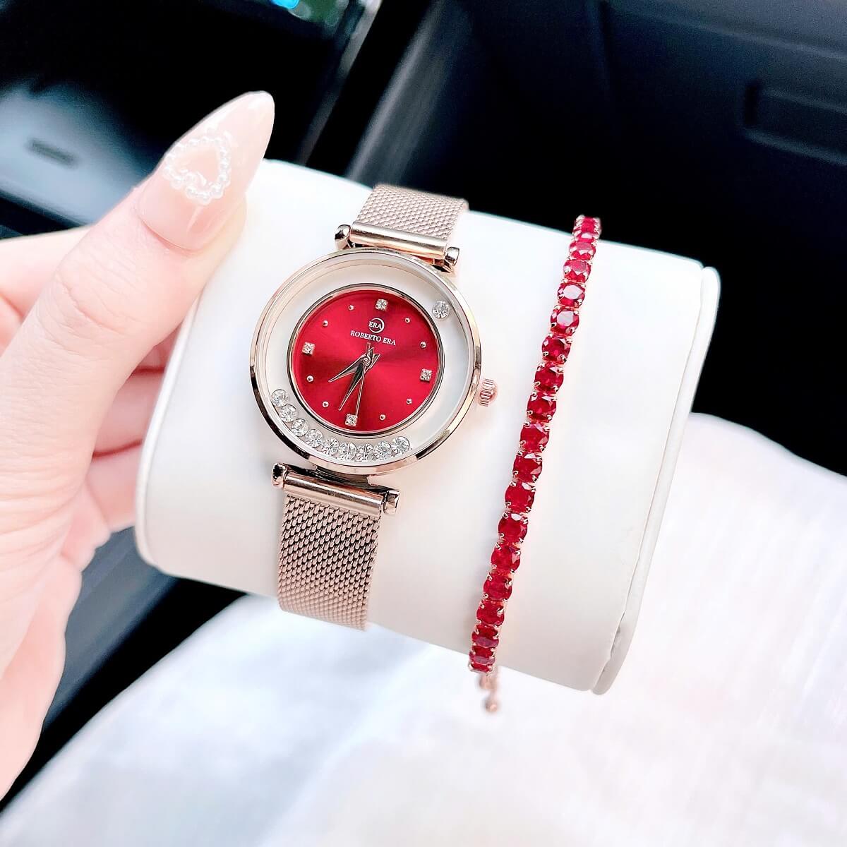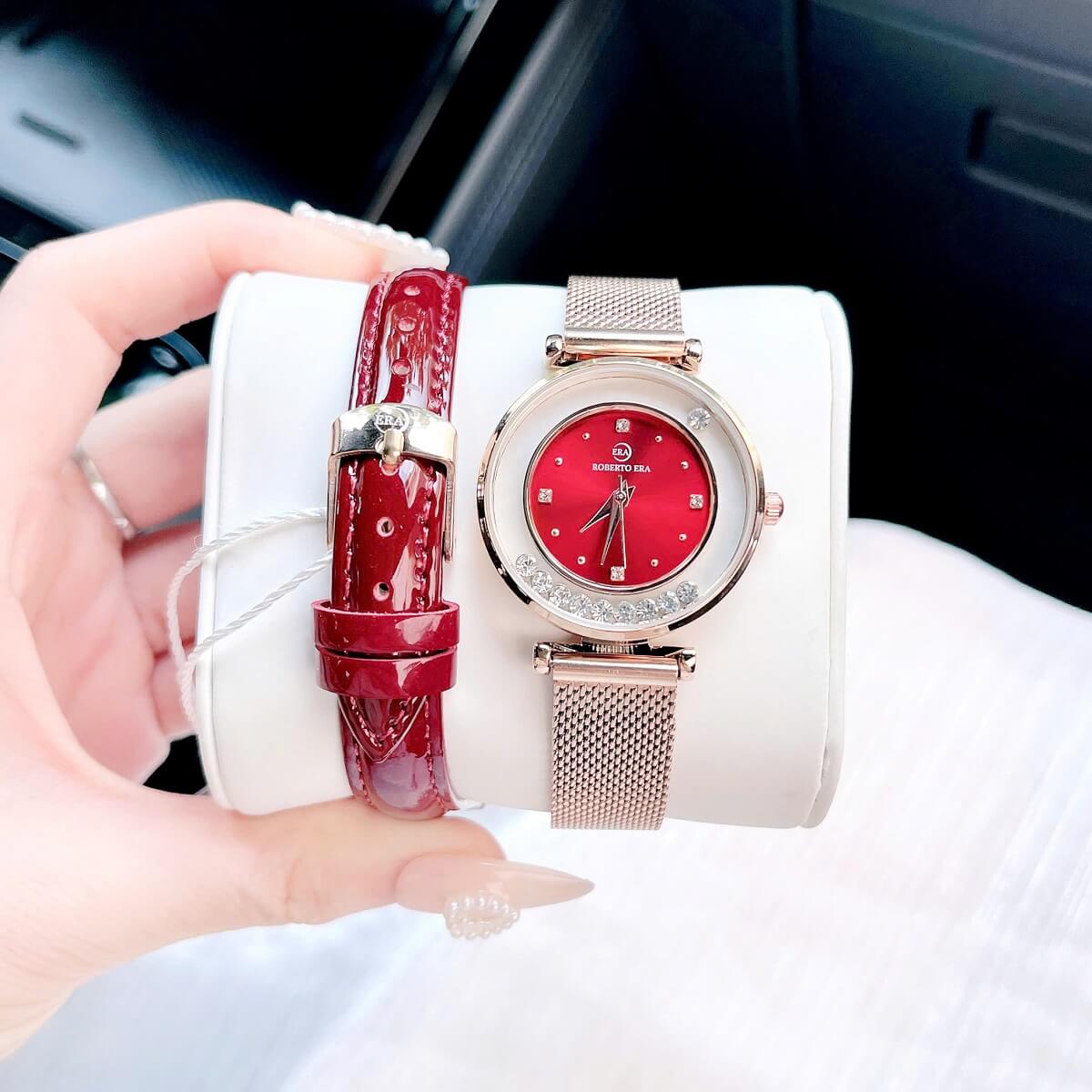 Thông số chi tiết sản phẩm: Set Đồng Hồ Nữ Roberto Era Dây Da Đỏ Vỏ Rose Size 32mm Chính Hãng